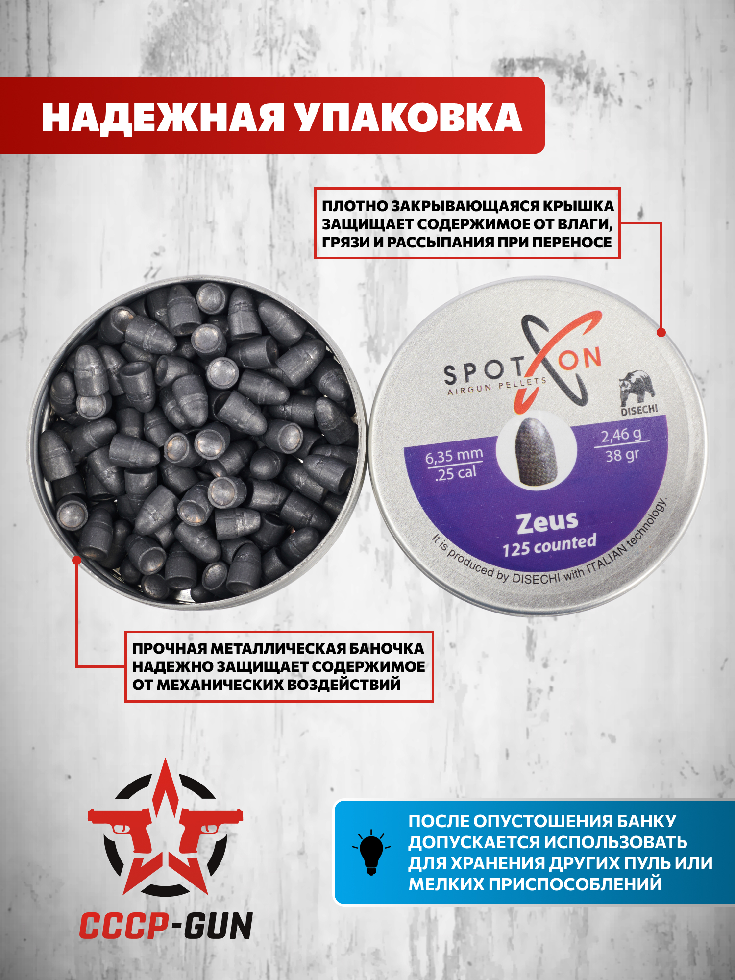 В качестве уточнения стоит сказать, что длина представленного боеприпаса находится в пределе 12 миллиметров. Материалом для изготовления рассматриваемых расходников стал свинец, а процесс производства происходит по запатентованной итальянской технологии. Поставляются пули в металлических плоских банках в количестве 125 штук, которые помогают легко и комфортно хранить или переносить снаряды.