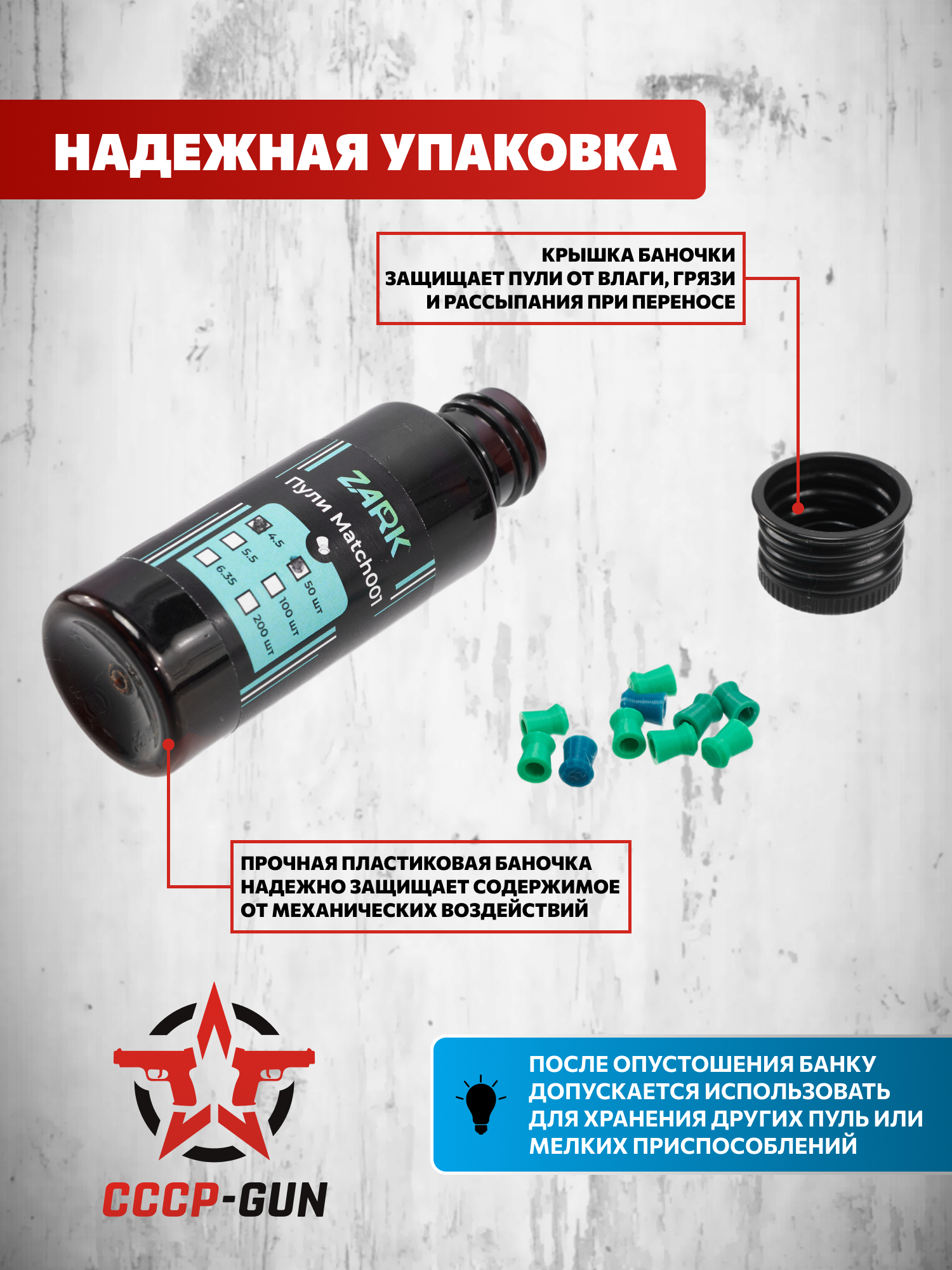 Поставляются снаряды ZA Match001 в темной банке, защищающей их от нежелательного влияния солнечного света. Емкость предоставляет 50 единиц боеприпасов и дополнена закручивающейся крышкой для комфортного хранения.