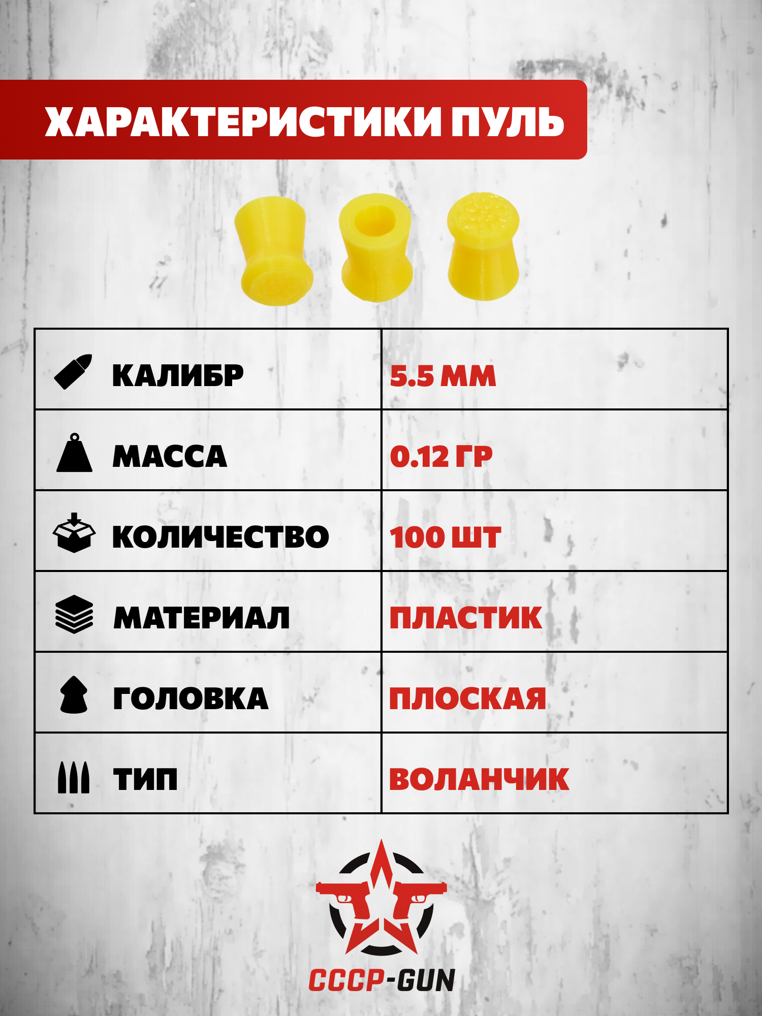 Калибр составляет 5.5 мм - увеличенный диаметр помогает стабилизировать полет. Благодаря этому выстрелы сохраняют точность на ближних дистанциях. Вес каждого боеприпаса составляет 0.12 г, что подойдет для маломощной пневматики - пластиковая пуля для воздушки разгоняется до высокой скорости и демонстрирует предсказуемую траекторию.