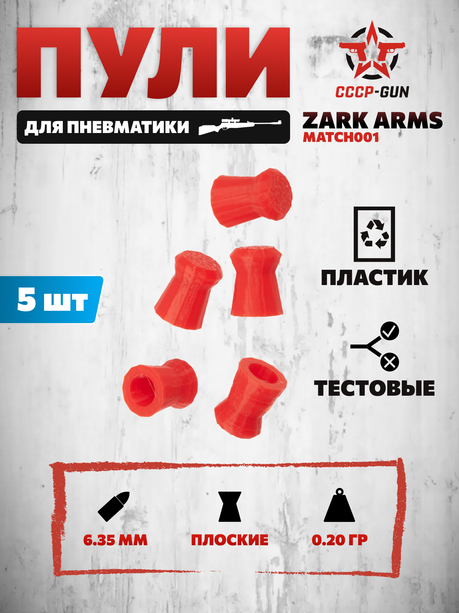 В рассматриваемом комплекте пули для пневматики пластиковые Zark Arms Match001 поставляются в количестве пяти штук. Такой набор предназначен для теста совместимости с оружием стрелка. Изготовитель обращает внимание пользователя на то, что эксплуатировать представленные снаряды требуется при температуре окружения не меньше -15 градусов и не больше +45 градусов по Цельсию, а также при хранении избегать прямого воздействия ультрафиолета и солнечного света чтобы не допустить нарушения геометрии боеприпасов и снижения их эксплуатационных качеств.