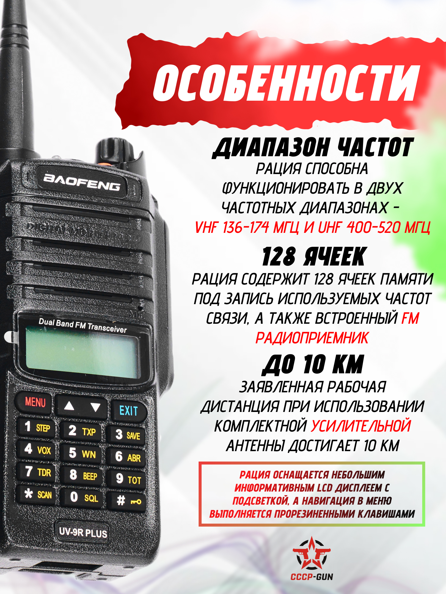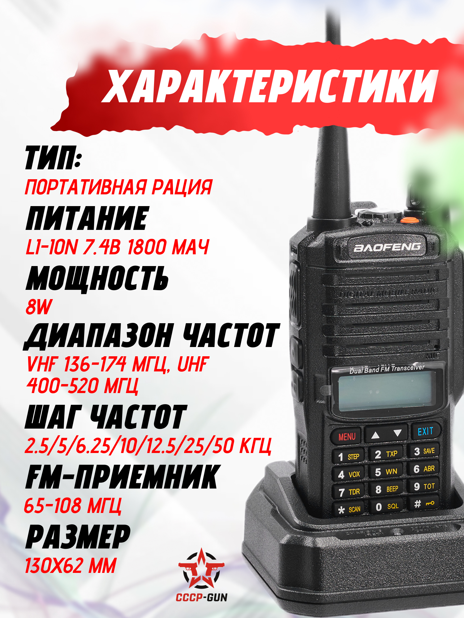 | Комплектация | Рация, антенна, аккумулятор, зарядное устройство, ремешок, клипса на пояс, инструкция, упаковка |