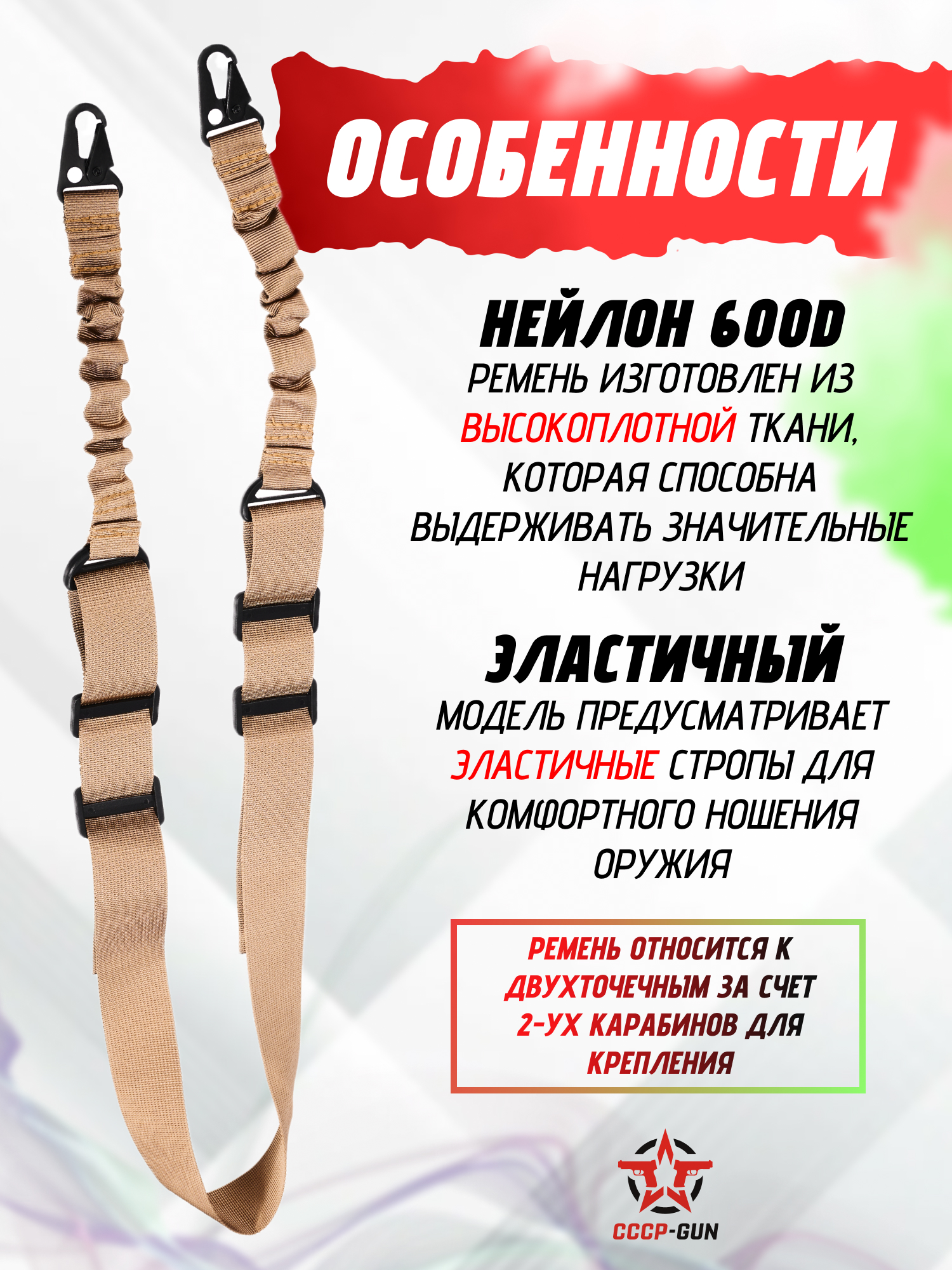 Ремень от предприятия Patriot - тактическая вариация классической конструкции, устанавливающейся на две точки в виде передней и тыльной антабок, вместе с чем этот образец допускается использовать в роли одноточечного. В этой модели задействовали нестандартную схему крепления - крепеж в виде карабинов соединили со стропой ремня через эластичные элементы. За счет последнего свойства оружие в состоянии покоя будет размещаться ближе к корпусу стрелка, что сделает передвижение комфортнее.