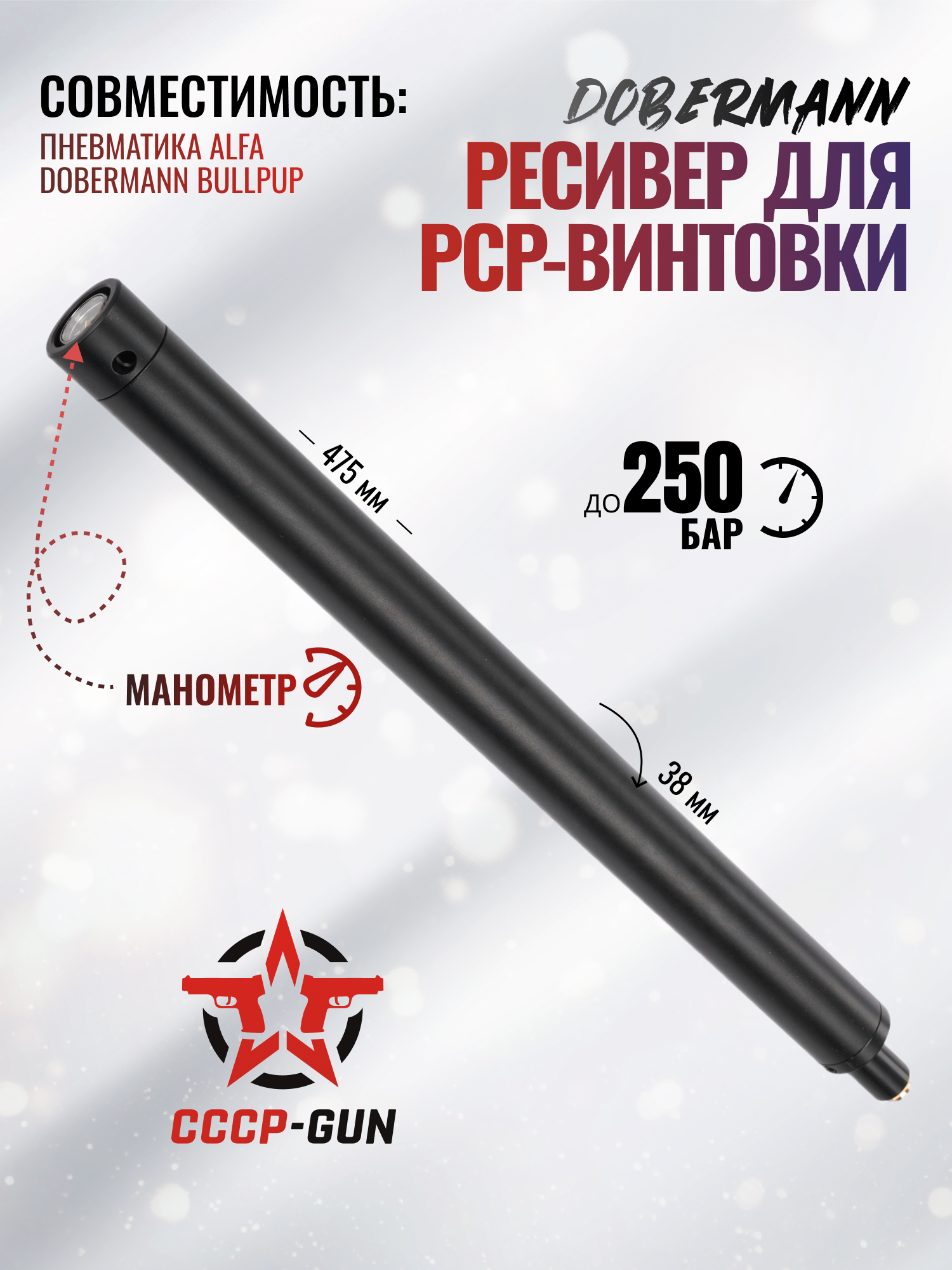 Баллон для PCP винтовки Dobermann монтируется на заводские посадочные места, что исключает необходимость в исправлении, как конструкции Булл-Папа, так и самого резервуара. Модель имеет длину 47.5 сантиметров, классическую цилиндрическую форму с двумя пробками: в передней части размещается встроенный манометр для контроля давления, а задняя подготовлена под вкладной редуктор с соответствующим стаканом.