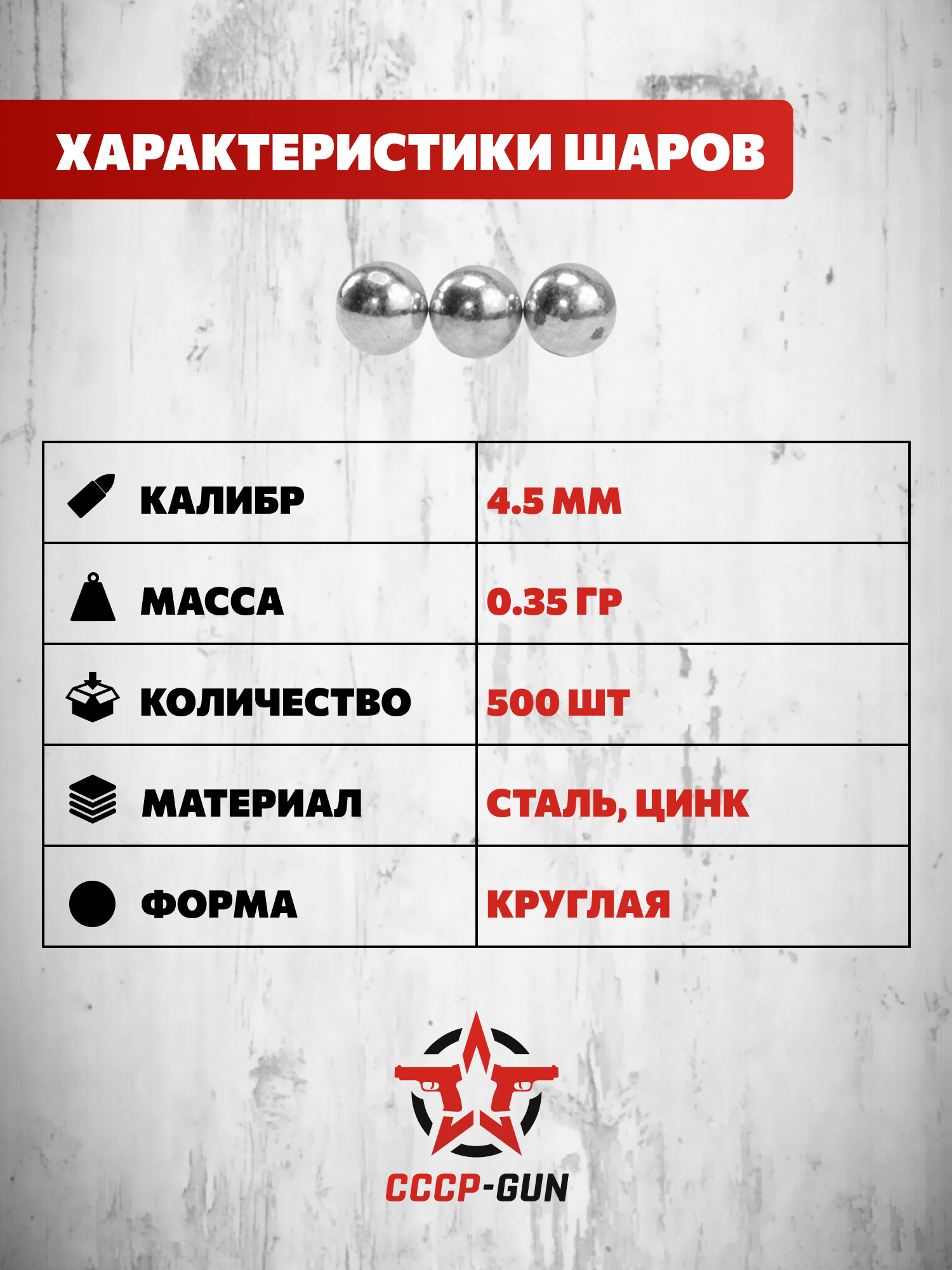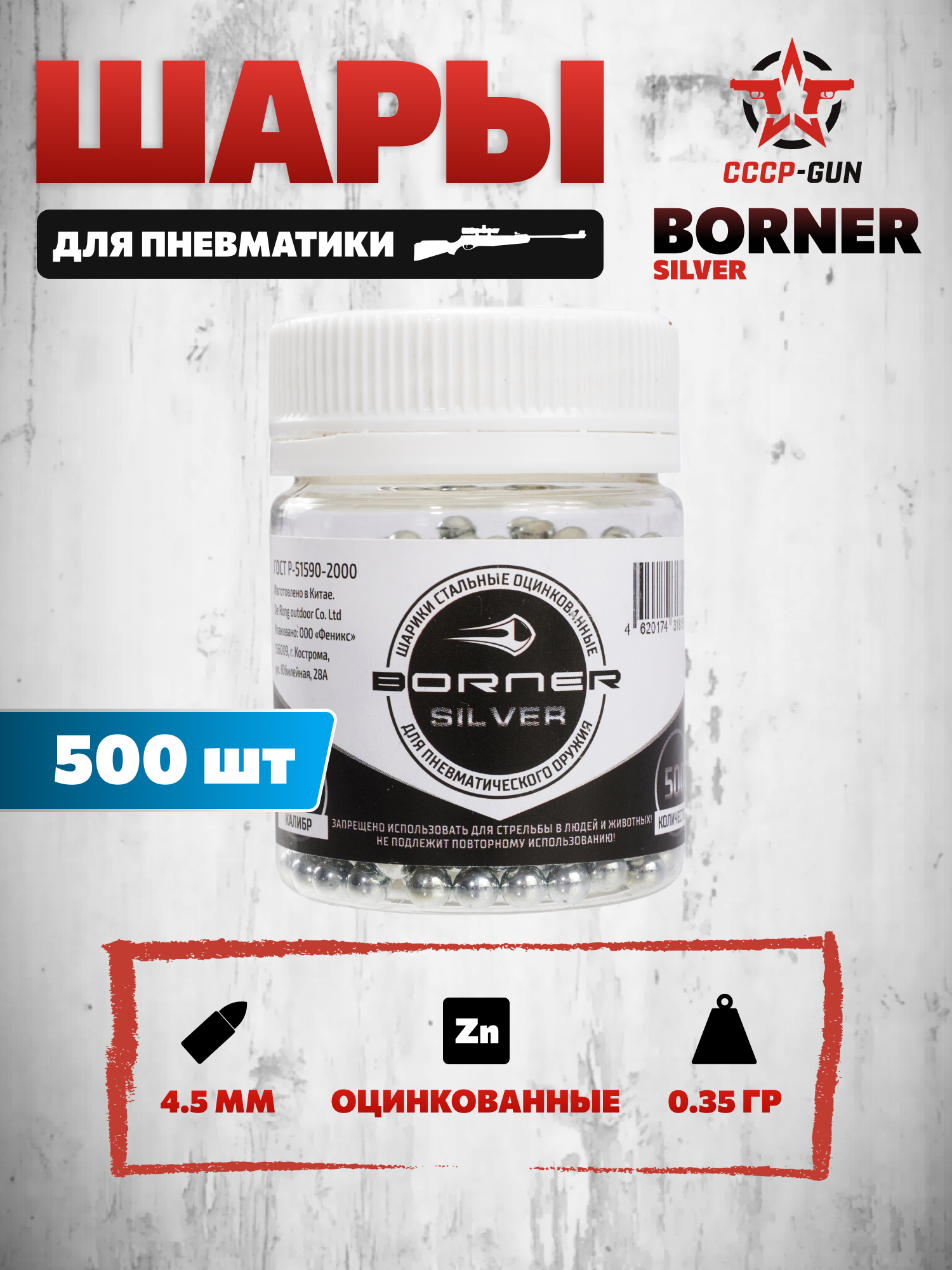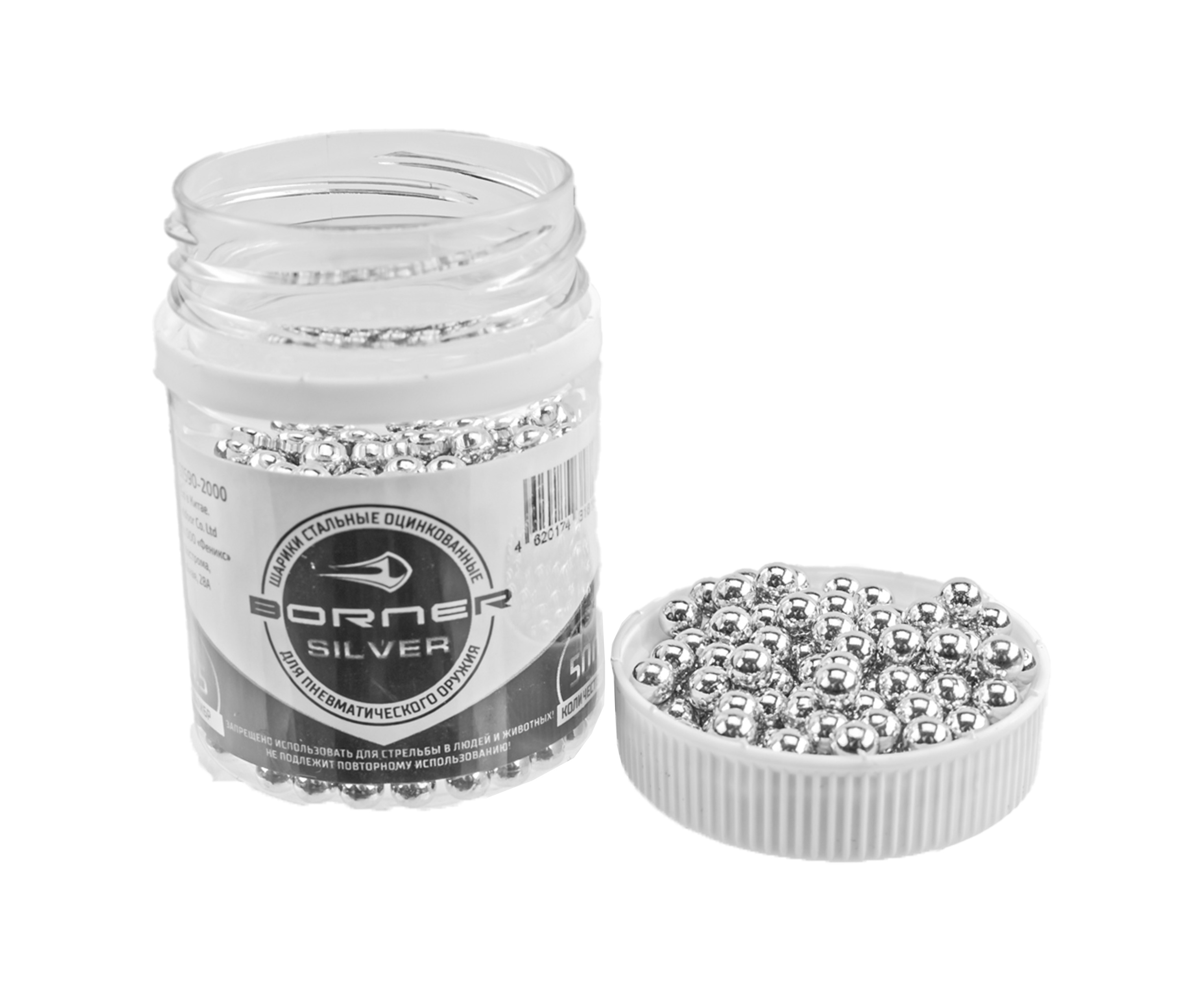 Представленные шарики Borner Silver характеризуются диаметром 4.5 мм - они изготавливаются из стального сплава, отличающегося прочностью относительно классического свинца. С целью предотвращения абразивного трения зарядов о внутренние стенки канала ствола, внешний слой каждого элемента покрывается цинком. За счет подобного инженерного решения в процессе движения пули вдоль ствольного канала повреждается исключительно внешнее покрытие, не затрагивая саму металлическую основу - на этом фоне стоит учитывать, что боеприпасы не многоразовые.
