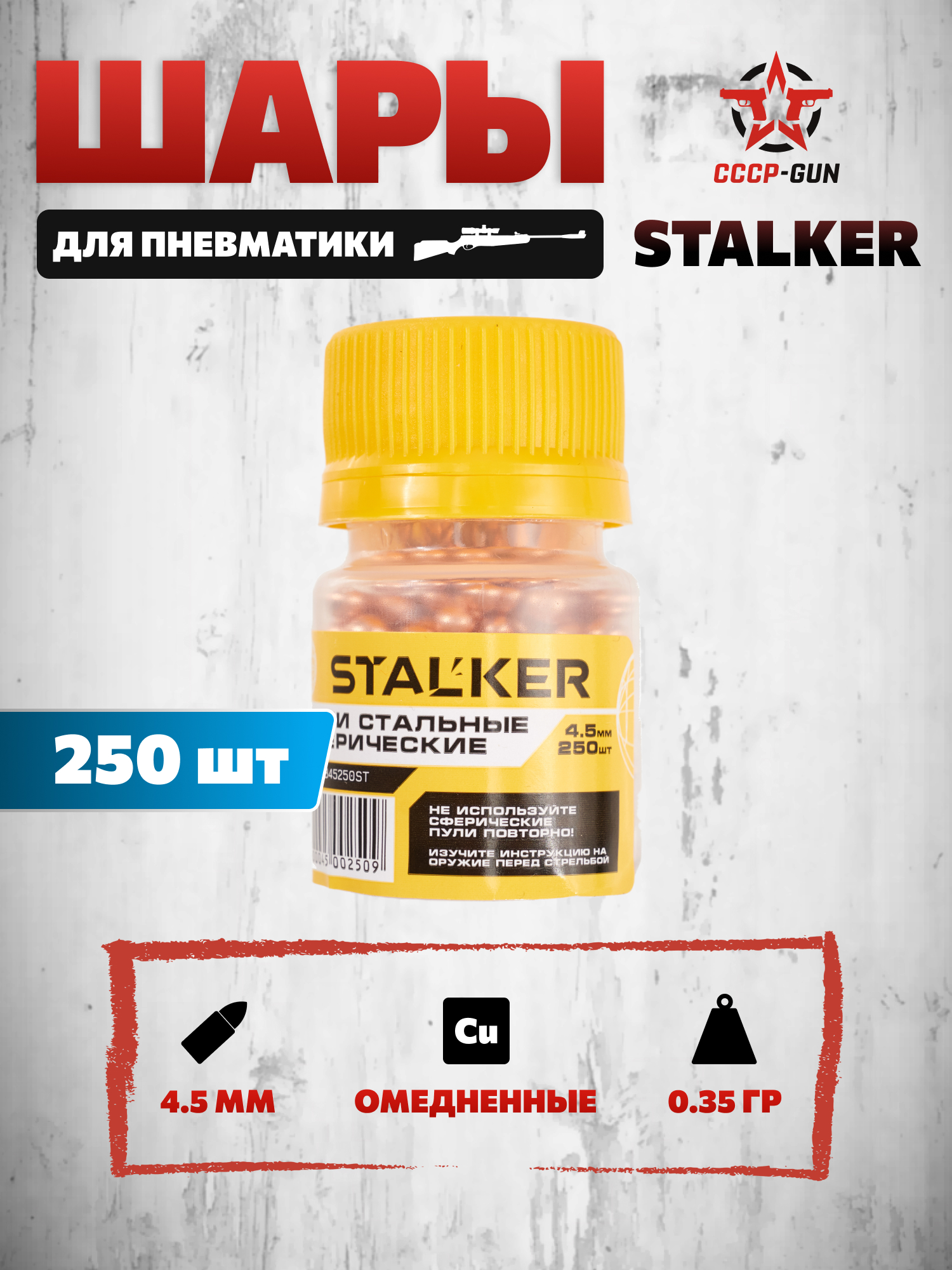 Вес каждого снаряда равен 0.35 г - малая масса снижает нагрузку на механизмы подачи, улучшает скорость полета и сокращает траекторию падения на малых дистанциях, что пригодно для точной стрельбы по мишеням. Пули стальные сферические 4.5 Stalker обладают гладкой круглой поверхностью. Этот профиль облегчает перемещение в магазине, исключая перекосы и застревания при автоматической подаче, что ценно при активной стрельбе.