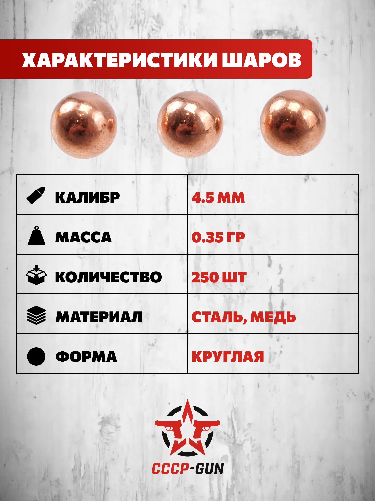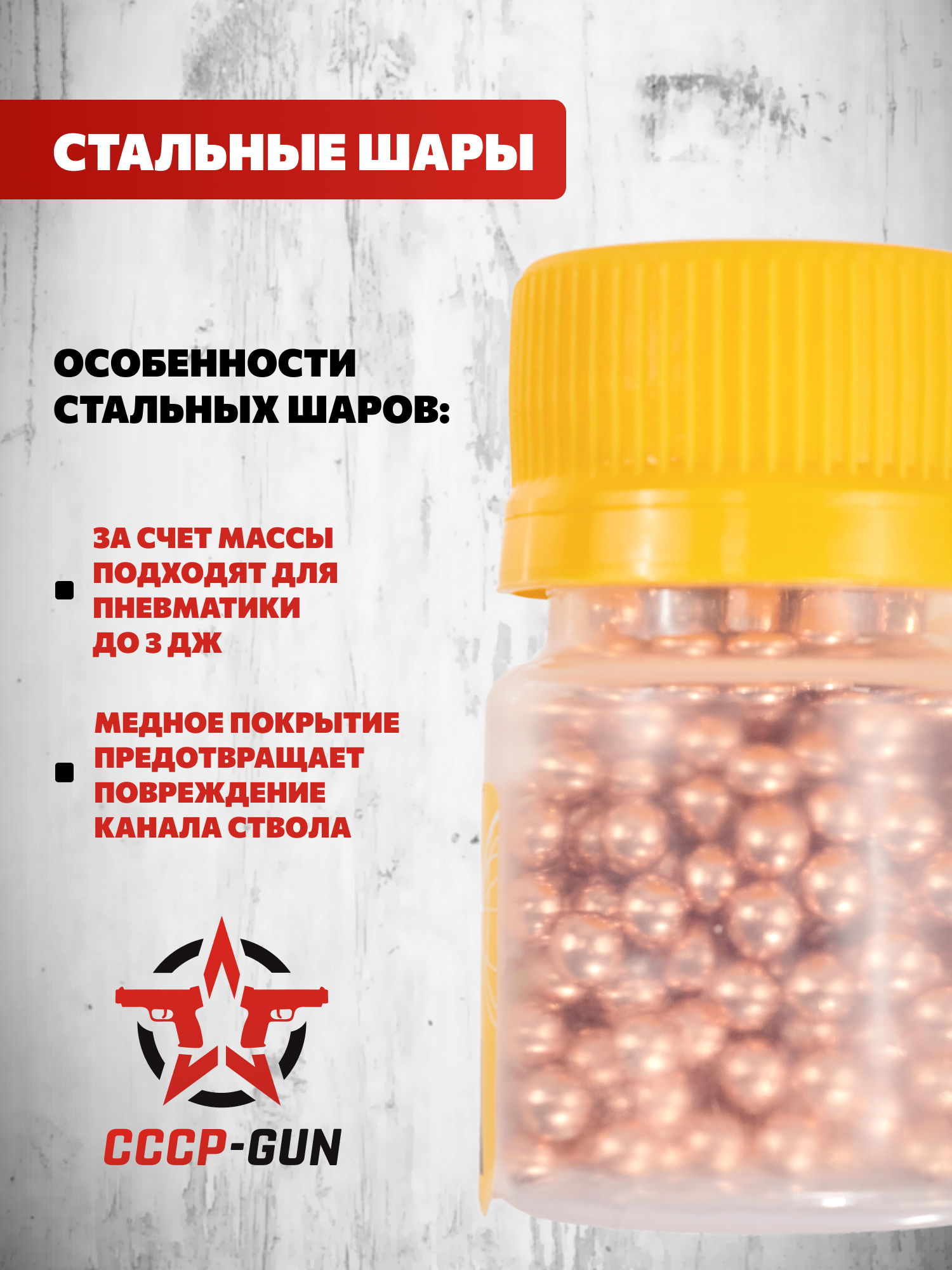 Диаметр шариков составляет 4.5 мм - стандартный калибр для многих газобаллонных моделей, которые используют сферические боеприпасы. Данный размер поддерживает равномерную подачу из магазинов барабанного и линейного типа.