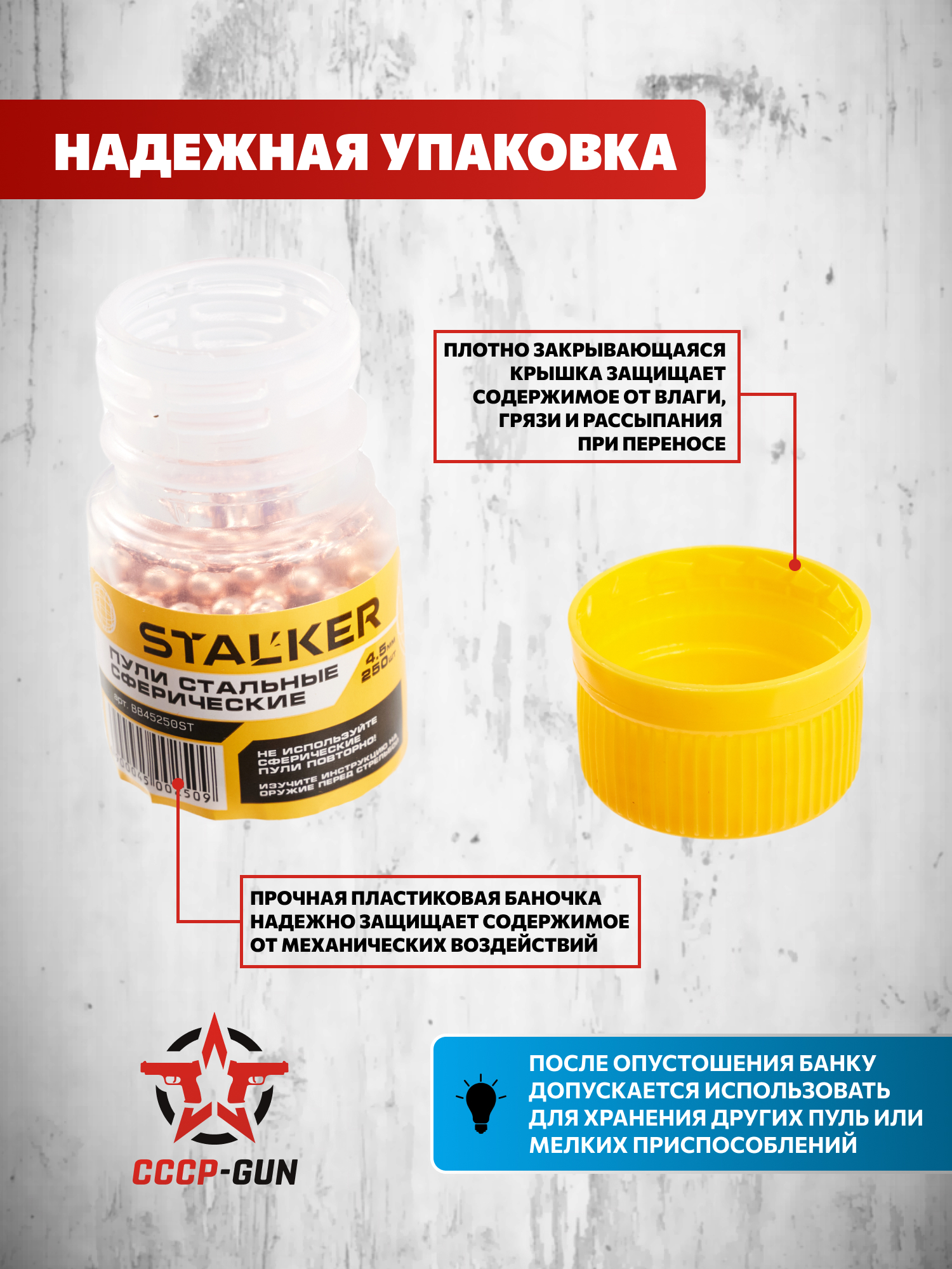В одной упаковке снарядов Сталкер содержится 250 шариков. Этого количества хватает для проведения продолжительных тренировок, развлекательных стрельб и поддержания постоянного запаса в арсенале.