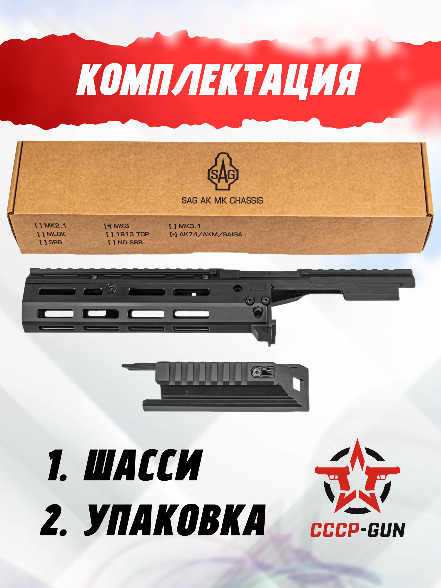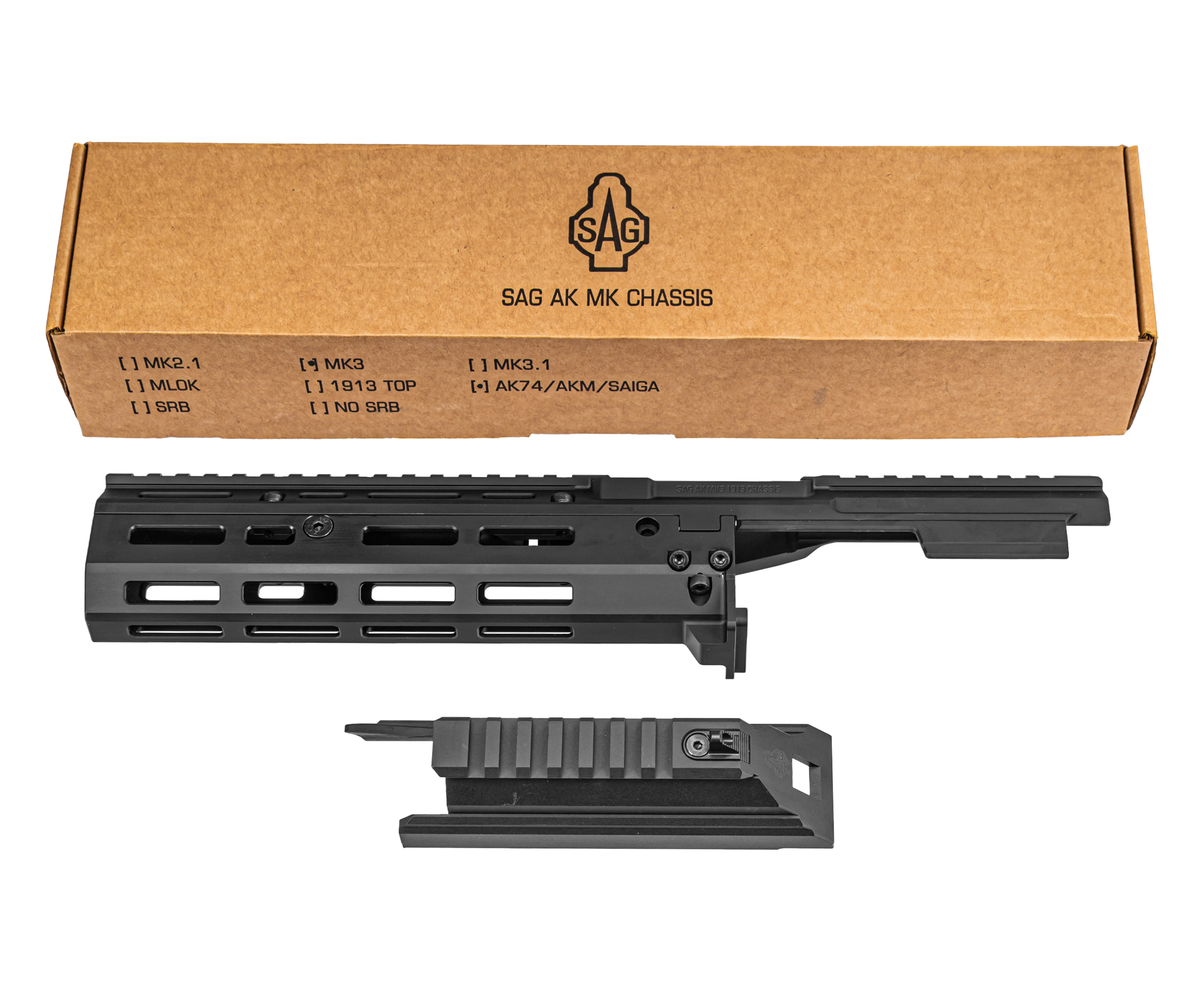Шасси SAG MK3 предназначено для расширения функционала автоматов Калашникова, а также Сайги и ВПО на его платформе. Модель S-20050 оснащена интерфейсом M-LOK длиной в 4 слота, позволяющим устанавливать большой спектр аксессуаров.