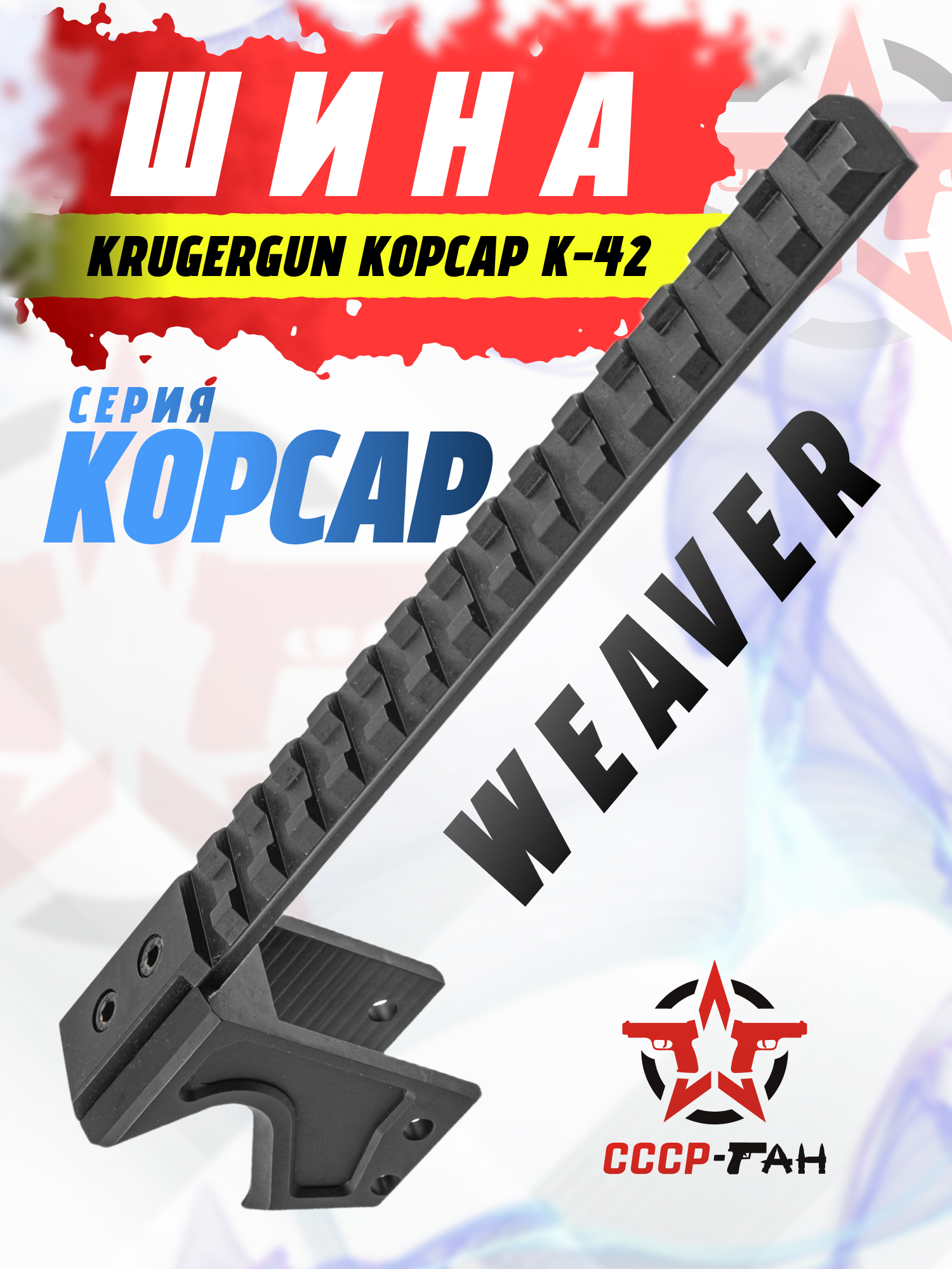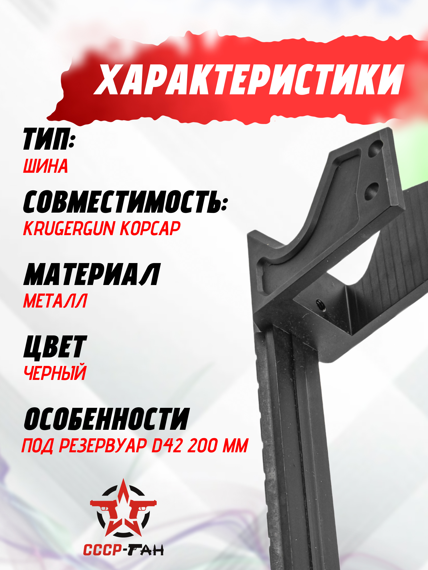 Это изделие входит в штатную комплектацию Крюгерган Корсар, выпускаемого в виде винтовки со стволом длинной 350 миллиметров. Шина крепится к оружию посредством штифтов, что ощутимо упрощает ее снятие и установку - как в плане легкости, так и скорости операции. В наборе с рассматриваемым аксессуаром присутствует пара удлиненных пинов, ставящихся в ствольную коробку взамен штатных.