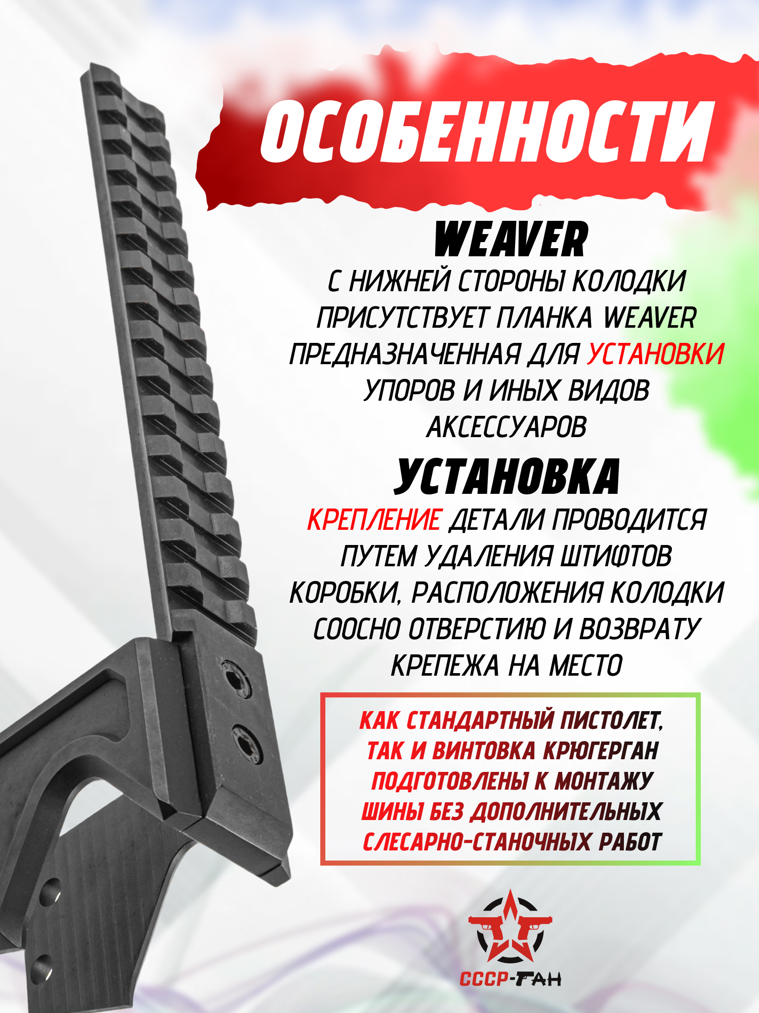 Образец подходит к тем исполнениям Крюгерган, которые предполагают монтаж ресивера длинной 200 мм и шириной 42 миллиметра. Материал выполнения изделия - Д16Т. Следовательно, этой детали не страшна ржавчина, вместе с чем она не прибавит излишней массы оружию.