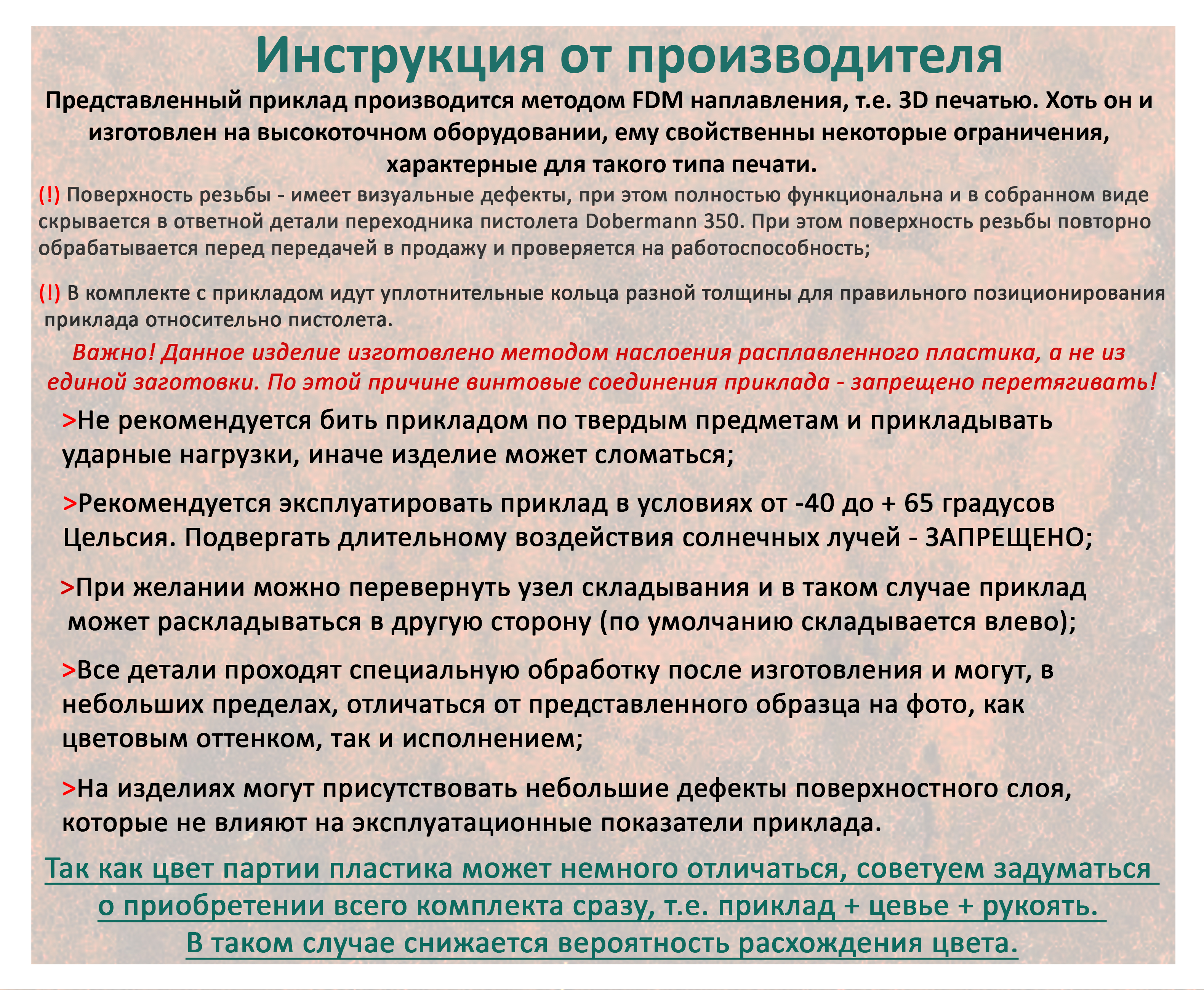 Представленный приклад Zark Arms на Доберман 350 монтируется к пистолету путем вкручивания в специальный переходник с резьбой, а для плотного позиционирования применяются уплотнительные кольца. Фиксируя основание упора в адаптере не стоит применять много усилий, так растет шанс расслоения пластиковой части изделия, а также не следует хранить обвес на солнце, поскольку ультрафиолет негативно сказывается на структуре полимера.