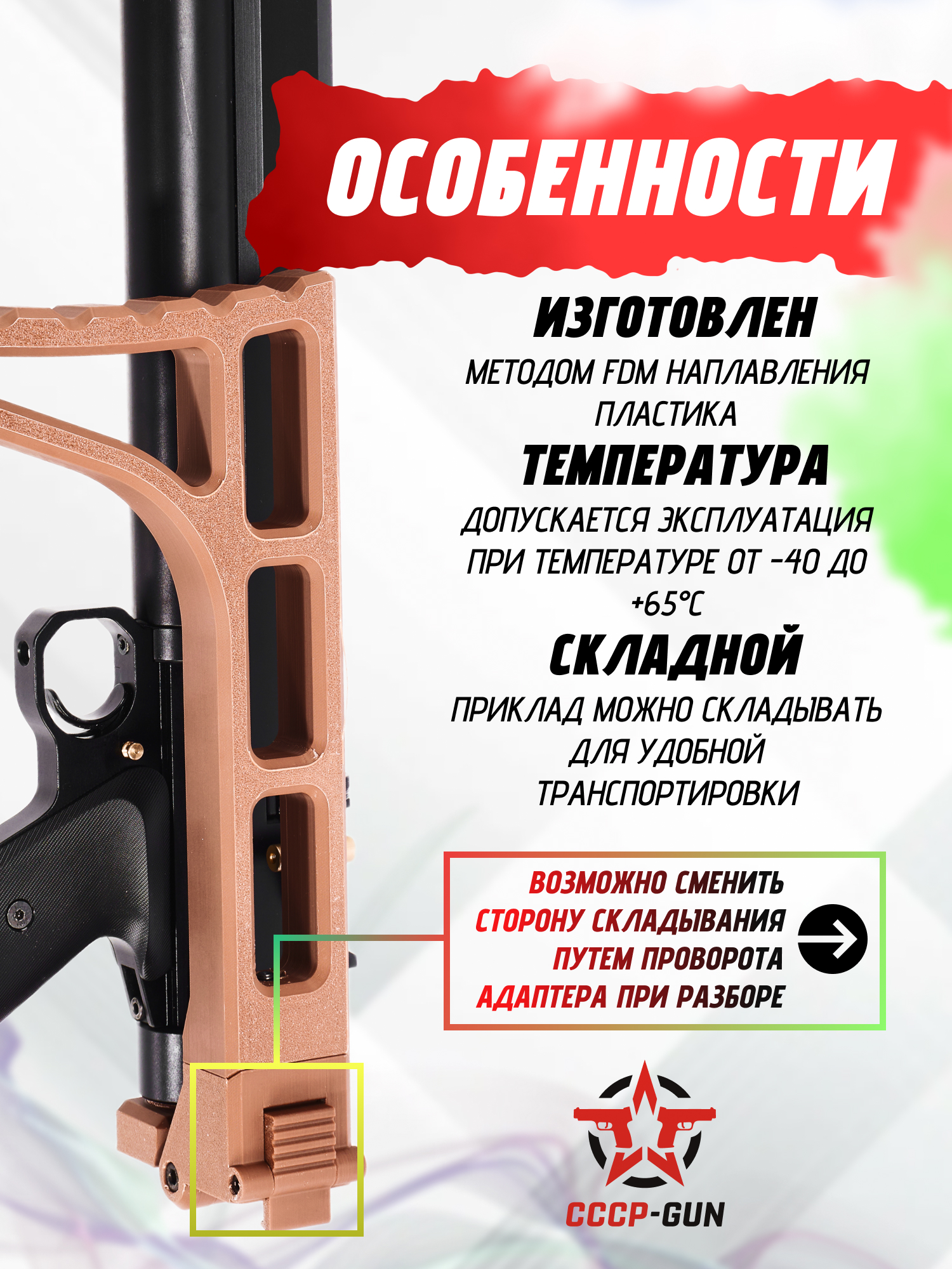 | Особенности конструкции | Складной приклад, возможность изменения стороны складывания, 3D печать методом FDM наплавления, эксплуатационная температура: от -40 до + 65°C |