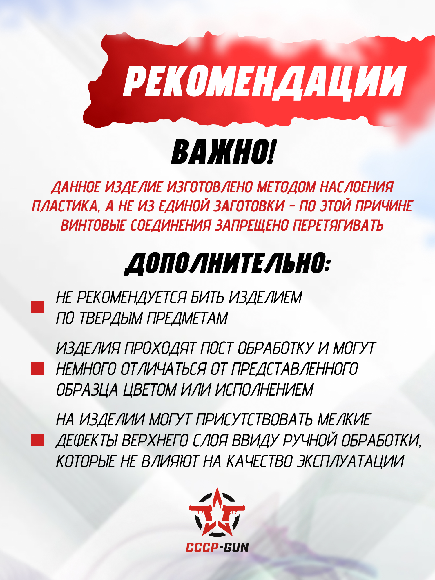 Рассматриваемый тюнинг проверяется на совместимость инженерами Зарк и обрабатывается от остаточных дефектов для комфортной вкладки с прикладом. Производитель предупреждает о возможных следах полимерного облоя, который не влияет на функционал обвеса при работе. Для предотвращения скольжения на тыльнике спроектированы углубления, помогающие улучшить соприкосновение изделия с плечом.