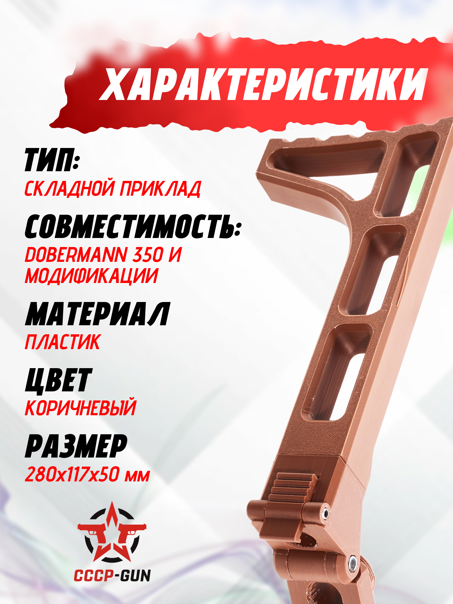 Производителю удалось спроектировать приклад таким образом, что конструкция имеет возможность складываться, при этом сторону сворачивания легко поменять, прокрутив адаптер после частичной разборки основания обвеса. Во время работы с пистолетом Dobermann 350 не стоит подвергать тюнинг тяжелым ударным нагрузкам, так как он не предназначен для того, чтобы бить твердые предметы или падать с большой высоты.