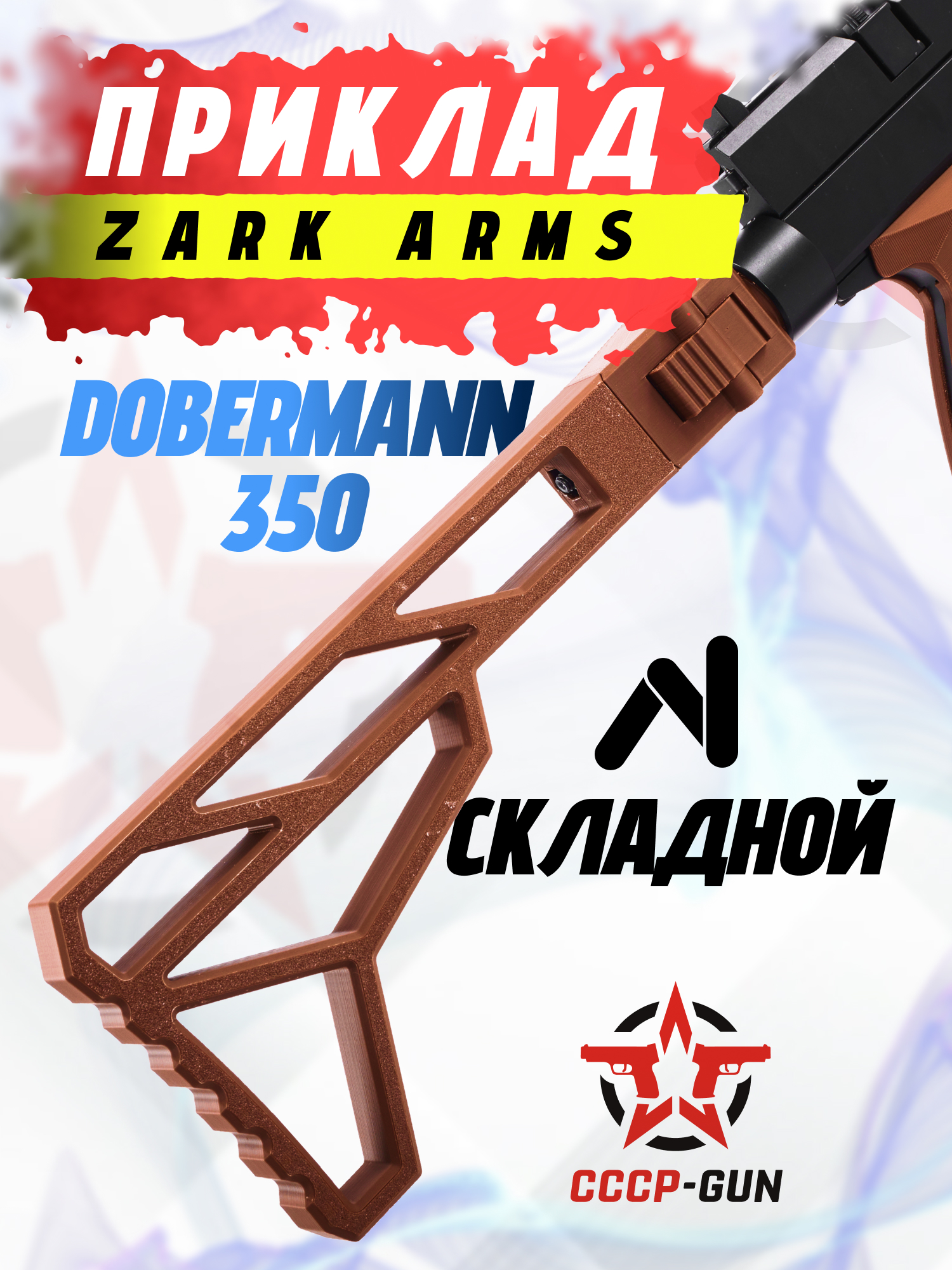 Сложенный приклад Zark Arms на Dobermann 350 занимает меньше места и удобен для переноски в чехле или кейсе. Чтобы сложить упор, необходимо нажать на кнопку фиксатора и потянуть конструкцию влево. Для изменения стороны складывания пользователю нужно провести неполную разборку подвижного узла обвеса, а после развернуть механизм в противоположное направление.