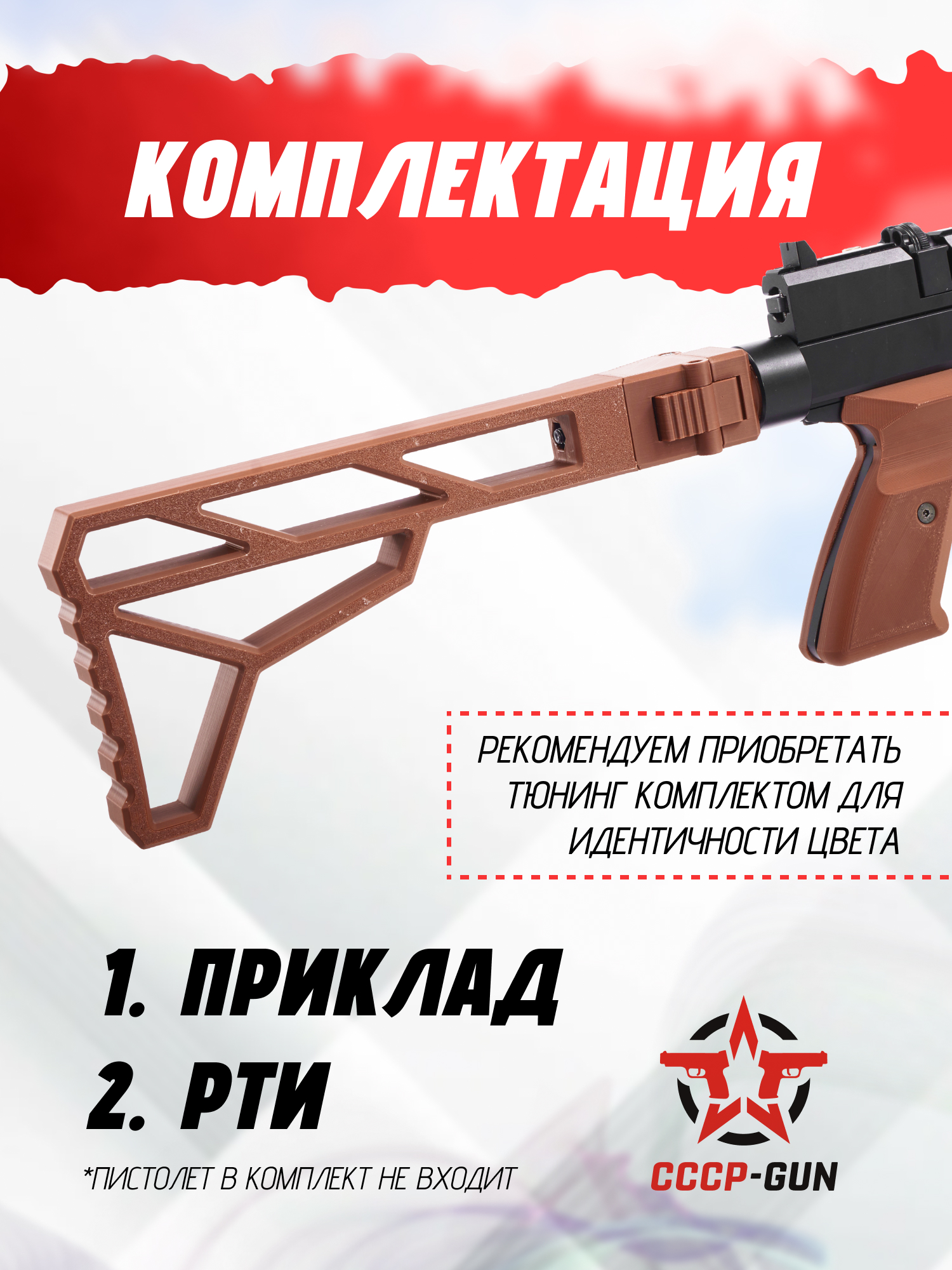 Обозреваемый обвес от компании Zark устанавливается на пистолет при помощи штатного переходника с адаптером. Для фиксации необходимо вкрутить крепеж основания приклада в посадочное гнездо, избегая перекосов и перетягивания резьбы. Чтобы обеспечить плотное совмещение деталей, производитель добавил в набор проставочные кольца.