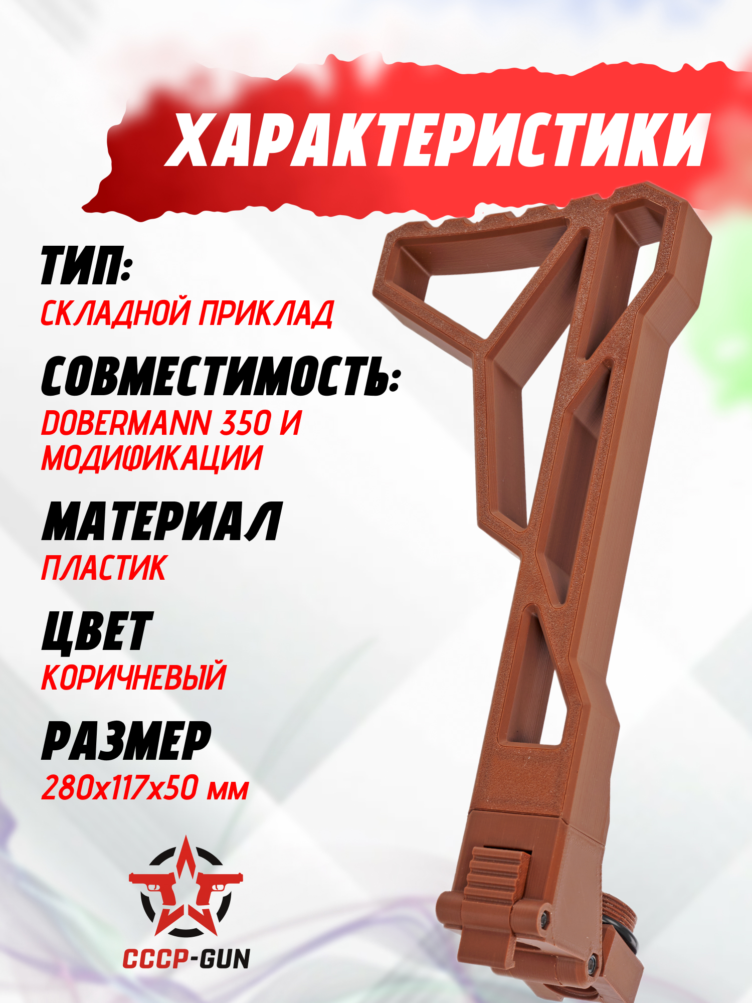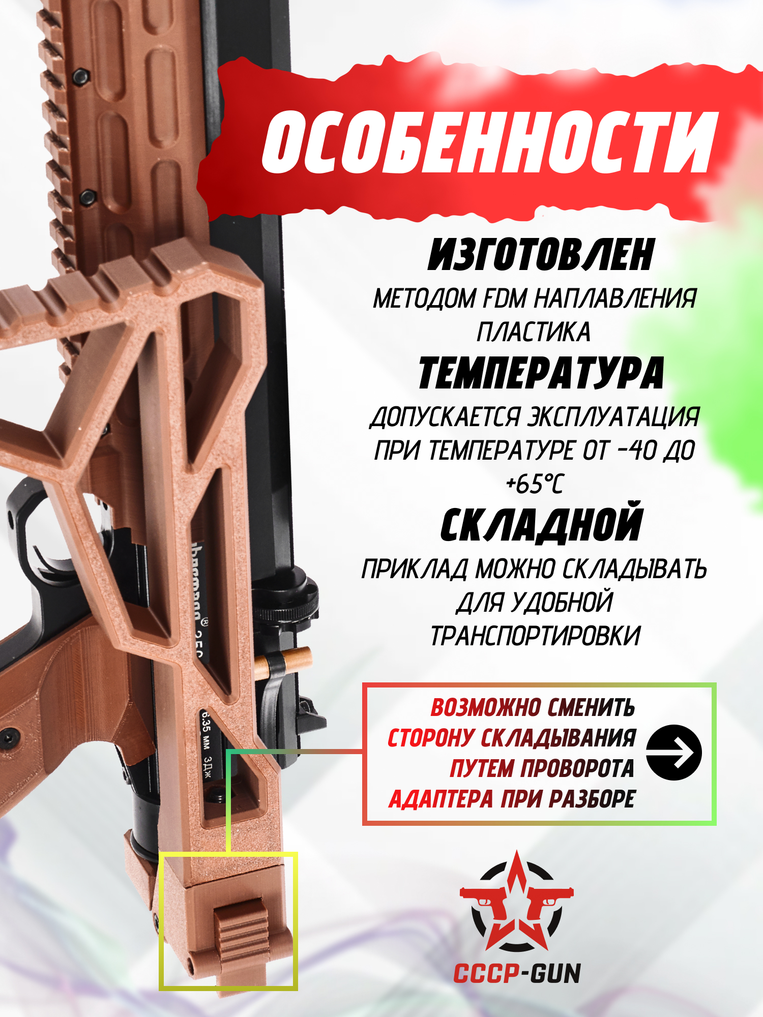 | Особенности конструкции | Складной приклад, возможность изменения стороны складывания, 3D печать методом FDM наплавления, эксплуатационная температура: от -40 до + 65°C |