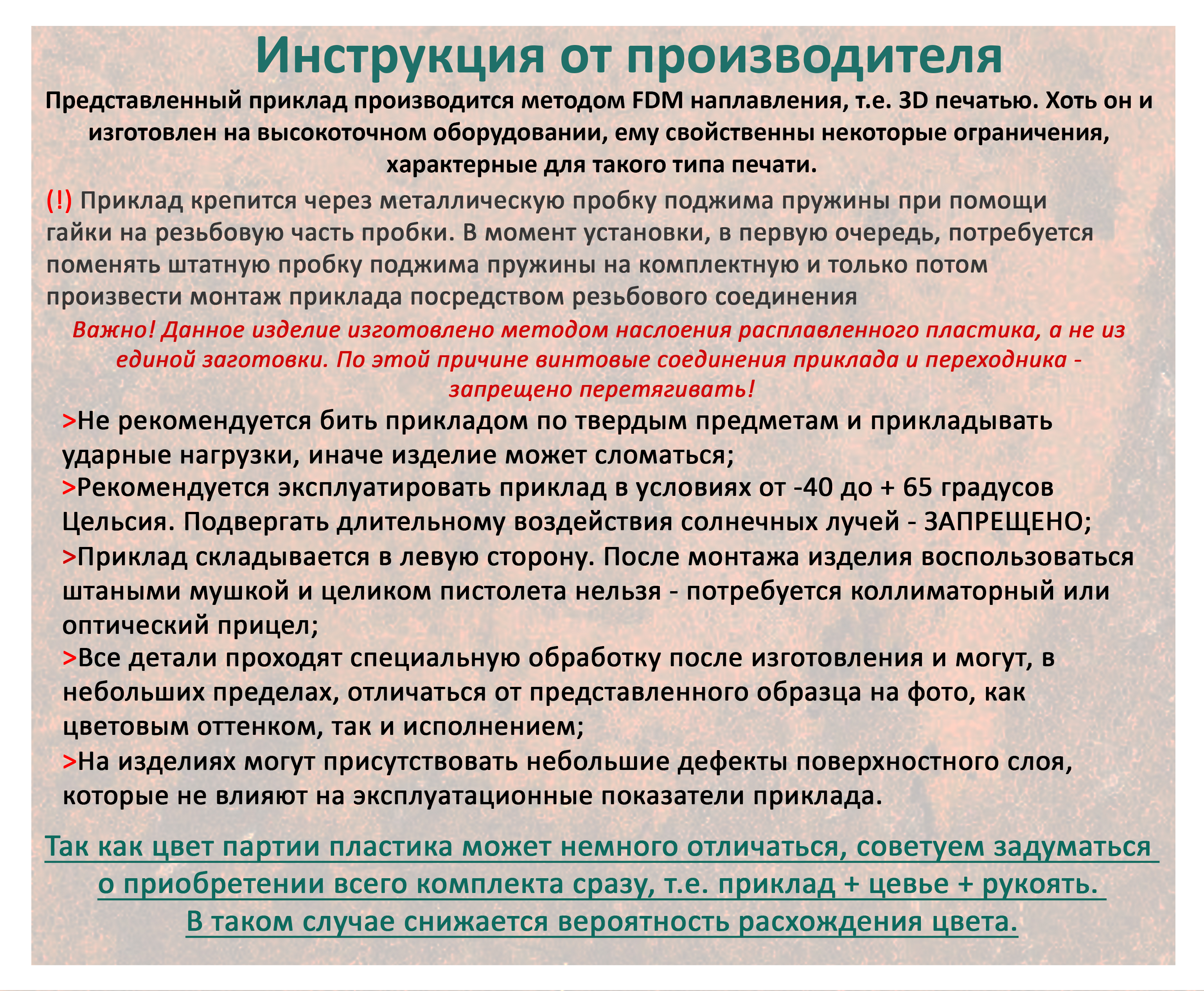 Поскольку пластик имеет свойство отличаться по цвету между партиями, производитель предупреждает о небольшом расхождении тона приобретаемого изделия с примером на фотографии. Также рекомендуется не хранить приклад под прямым светом солнца, поскольку лучи типа УФ приводят к деградации материала.