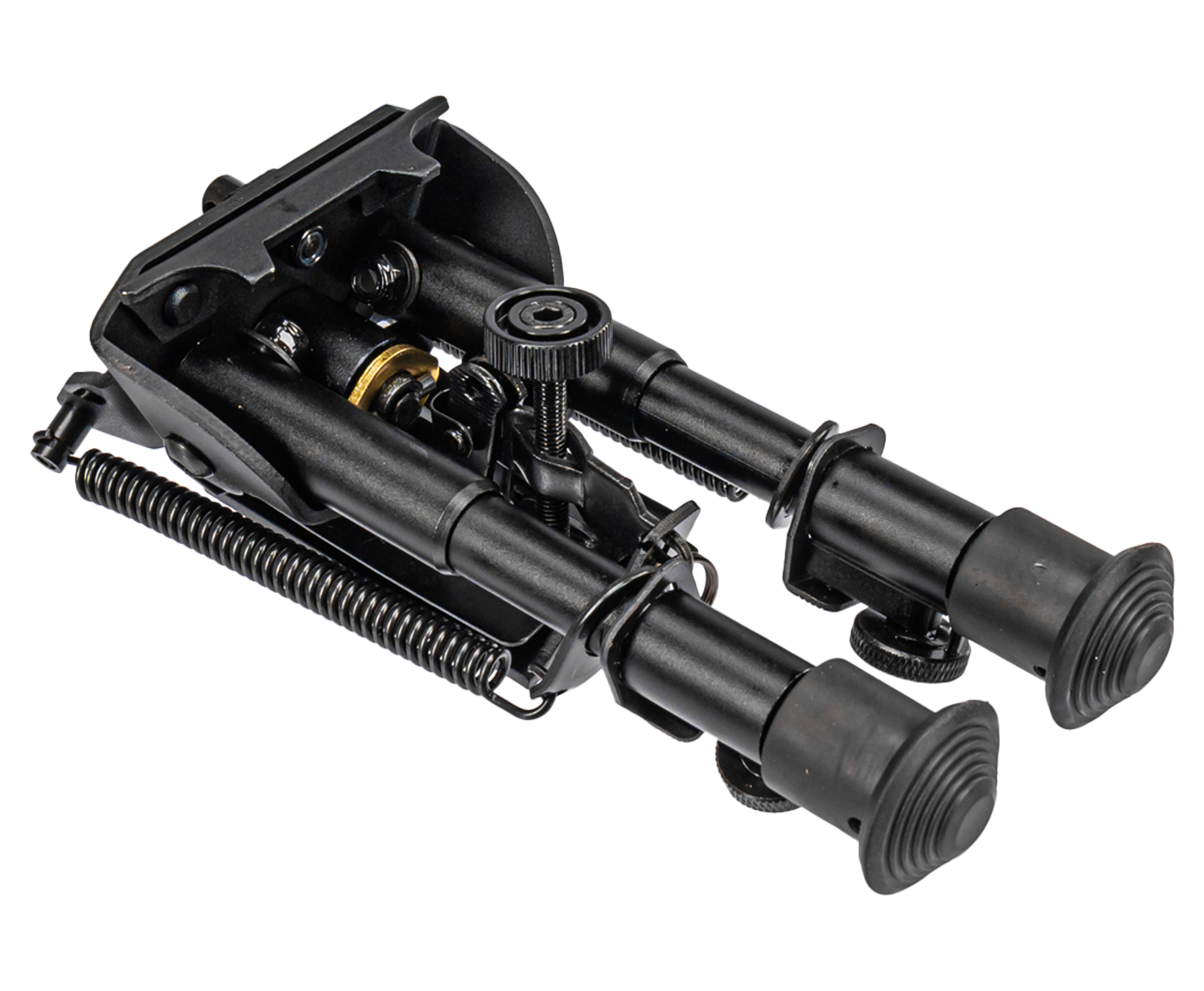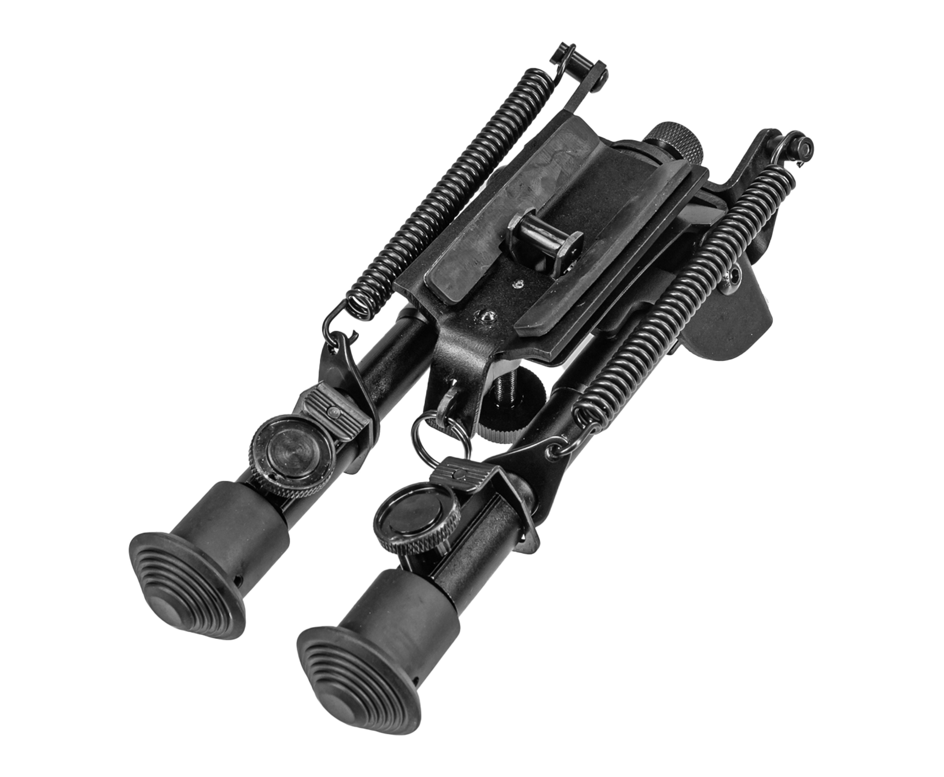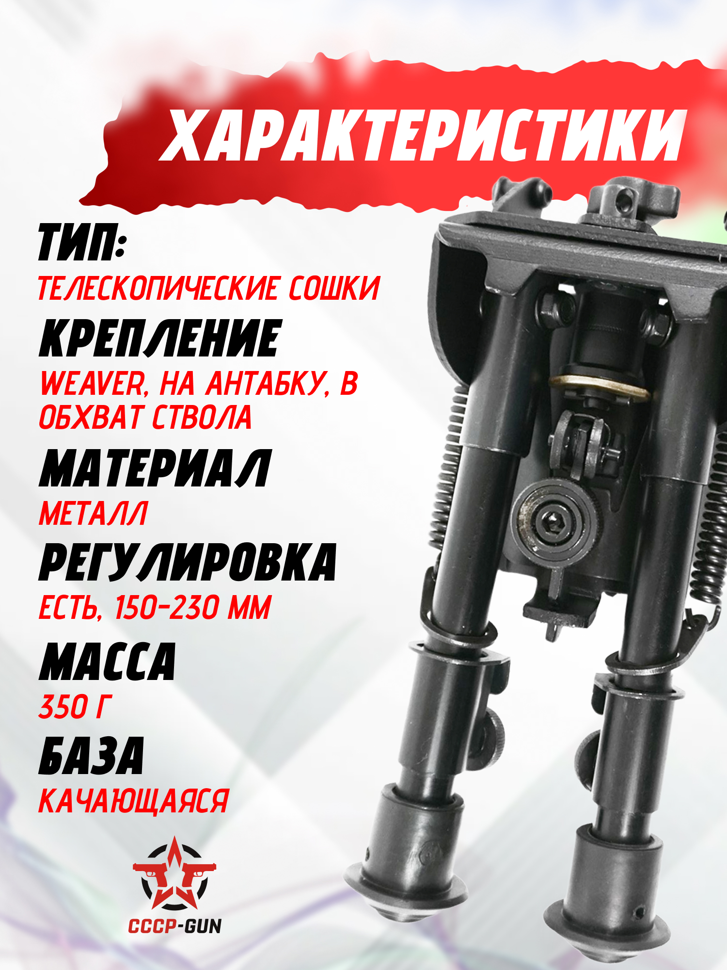 Универсальная конструкция предполагает установку на стандарт Weaver 22 мм, монтаж в обхват ствола или крепление на антабку, что делает экземпляр совместимым с большим спектром платформ. Это будет хорошим решением для владельцев нескольких винтовок, ведь отпадает необходимость в покупке отдельных моделей сошек под каждую из них. Телескопические упоры регулируются в диапазоне от 150 до 230 мм, это поможет пользователю адаптировать оружие под текущие условия практики.