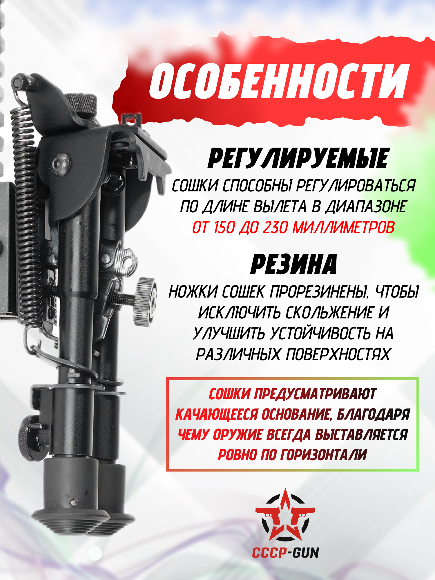 Материал изготовления модели - металл, выдерживающий нагрузки, возникающие при выстреле. Благодаря массе в 0.35 кг сошки не утяжеляют оружие и не будут переутомлять владельца. В походном режиме они не будут стеснять передвижений.