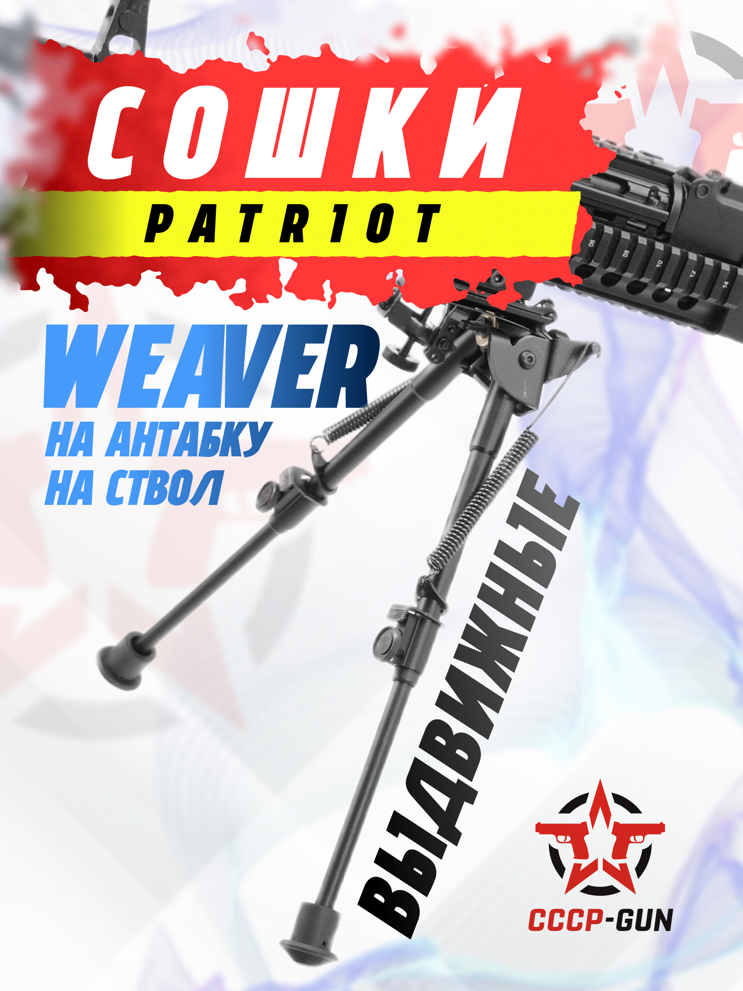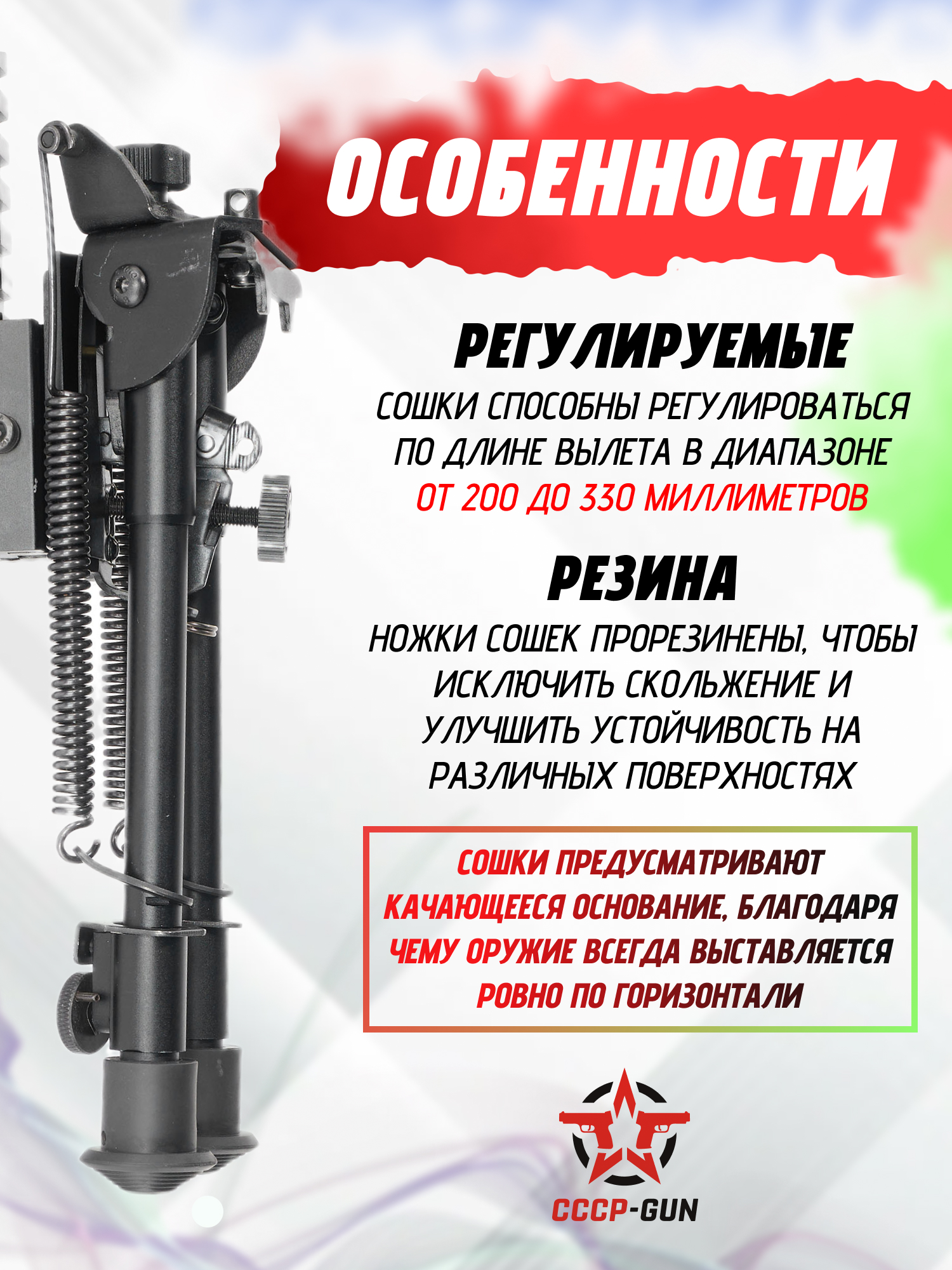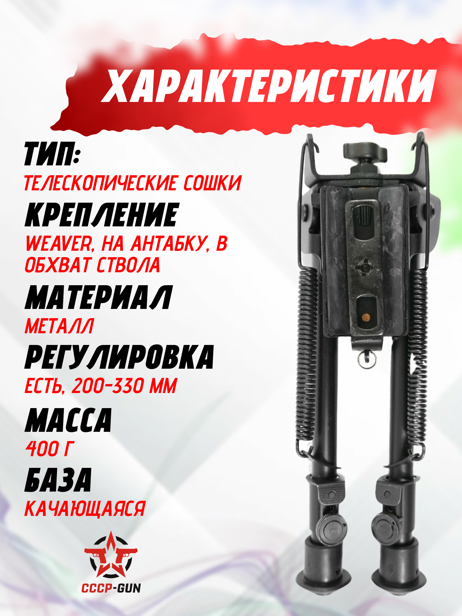 Сошки с качающейся базой, с переменной высотой от 200 до 330 мм. Модель оснащена креплением на антабку, планку Вивера, а так же поставляется с кронштейном в обхват ствола.