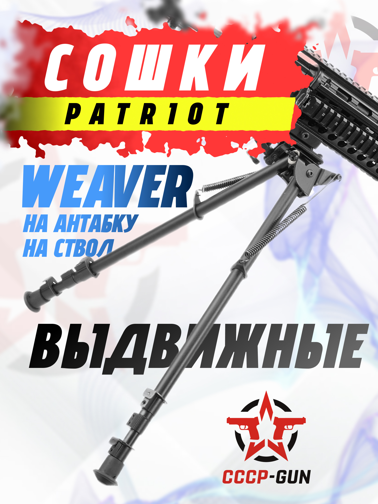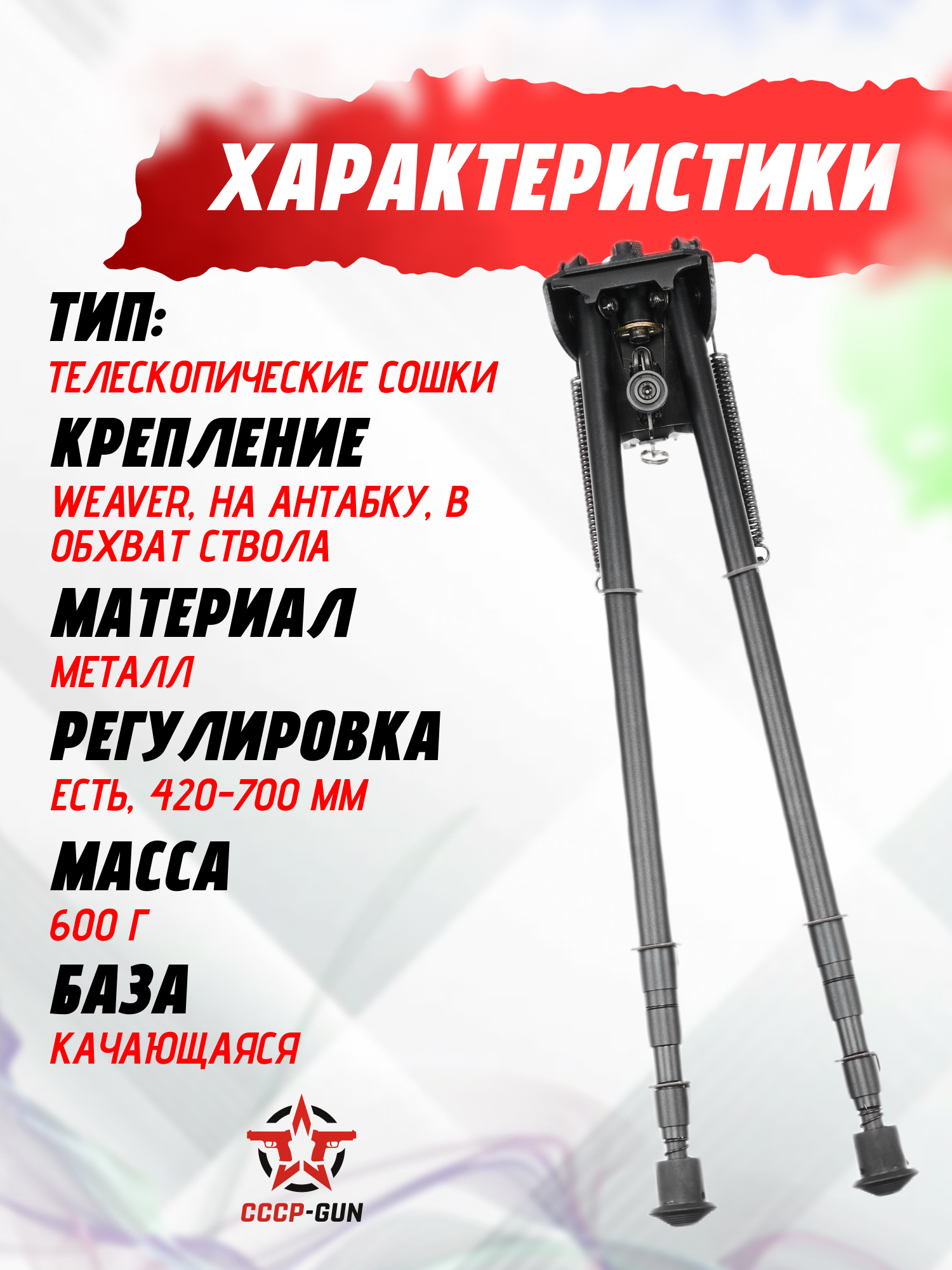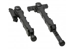 Высокие сошки, которые позволяют вести стрельбу как лежа, так и сидя. Высота модели может быть настроена в диапазоне от 420 до 700 мм. Сошки оснащены креплением под планку Вивера, а так же поставляются с кронштейном в обхват ствола.