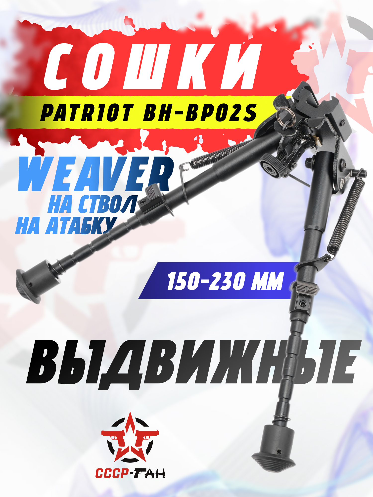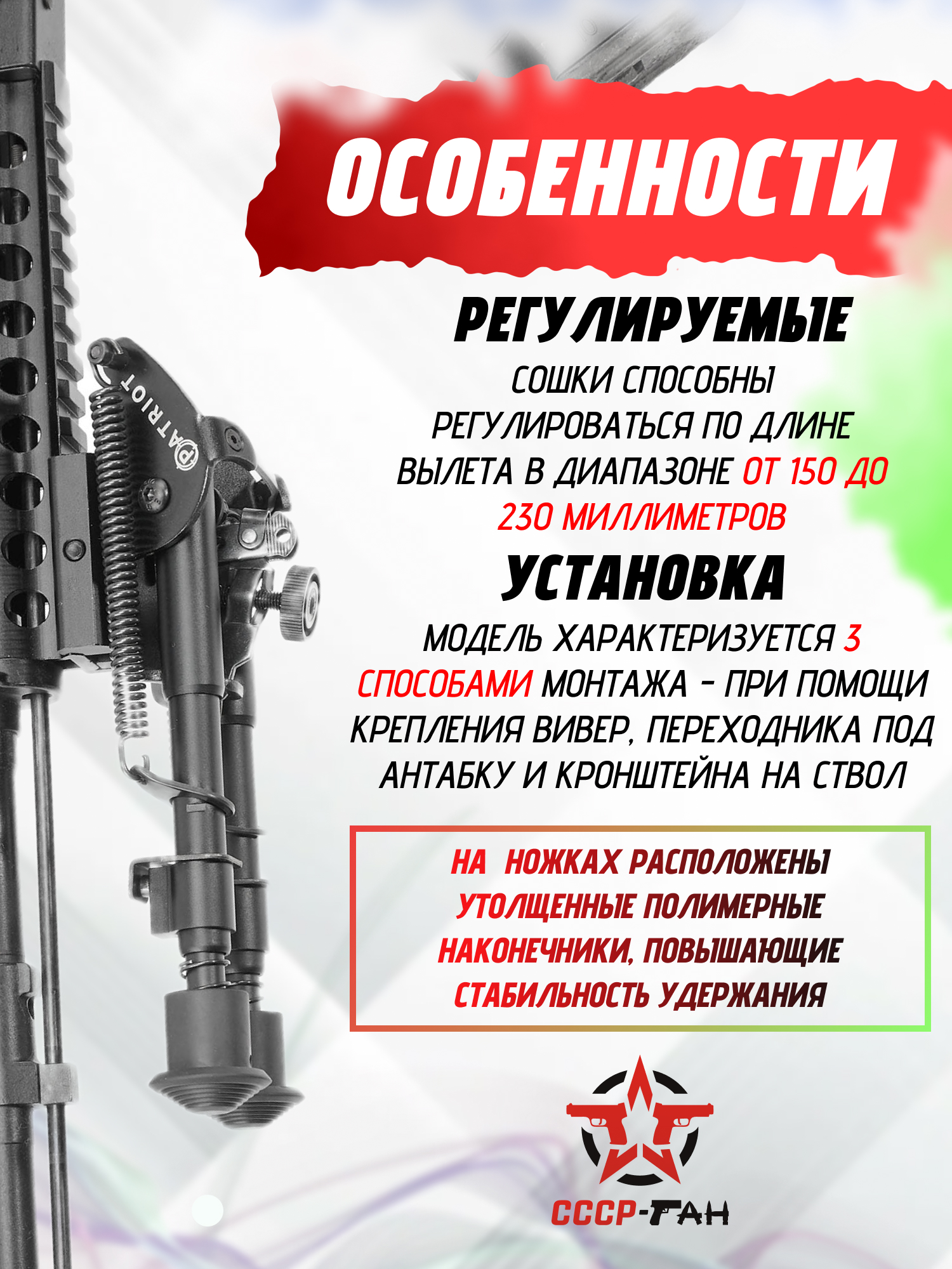 Сошки Weaver 22 мм от Патриот регулируются по высоте в диапазоне от 150 до 230 мм, благодаря чему владелец может подобрать необходимое положение исходя из особенностей рельефа или собственных предпочтений. Ножки снабжены боковыми пружинами, надежно удерживающими их в рабочей позиции - это предотвращает самопроизвольное складывание во время выстрела. Полимерные наконечники улучшают сцепление с поверхностью, не позволяя оружию скользить на гладких, каменистых или наклонных участках.