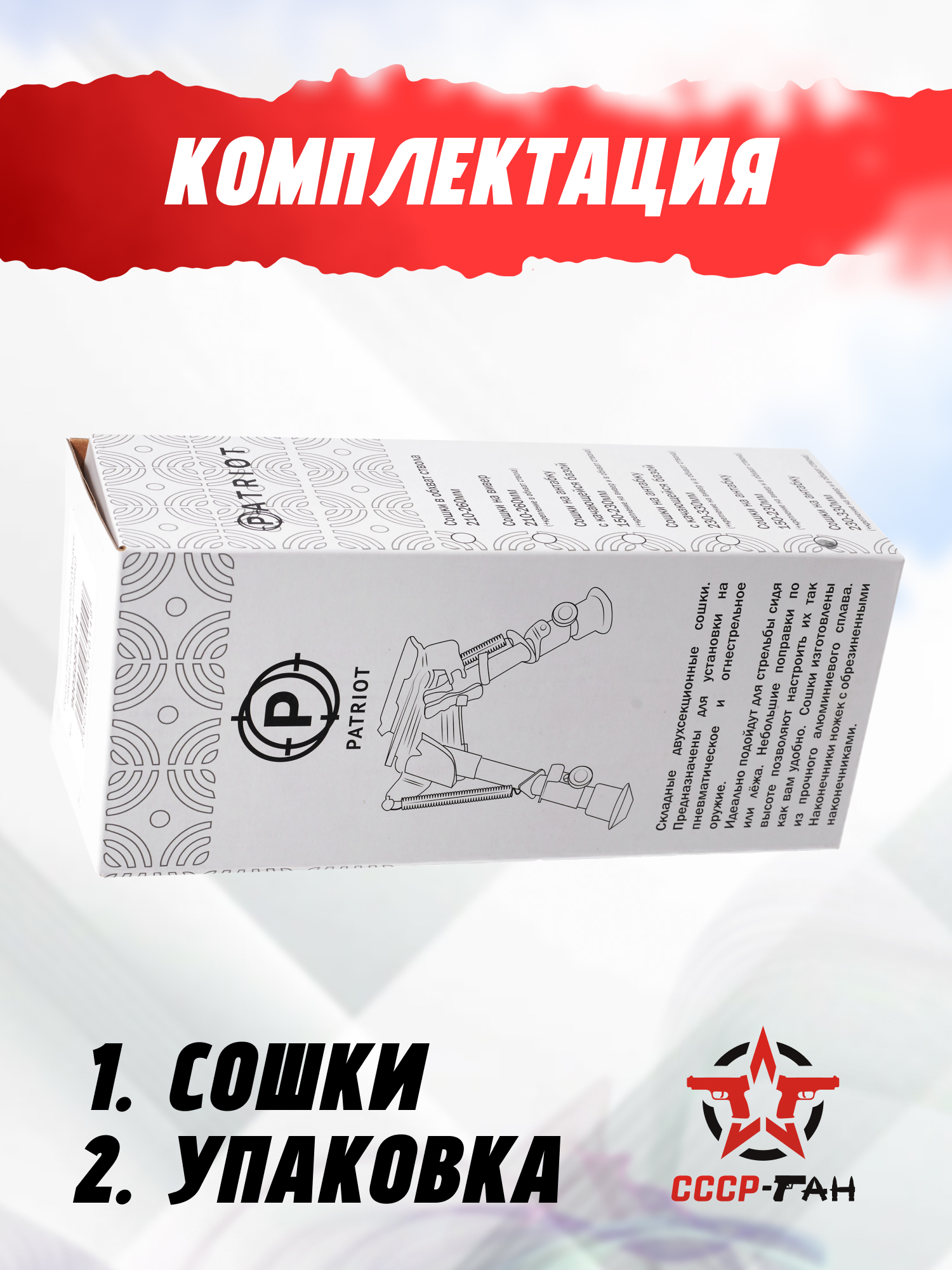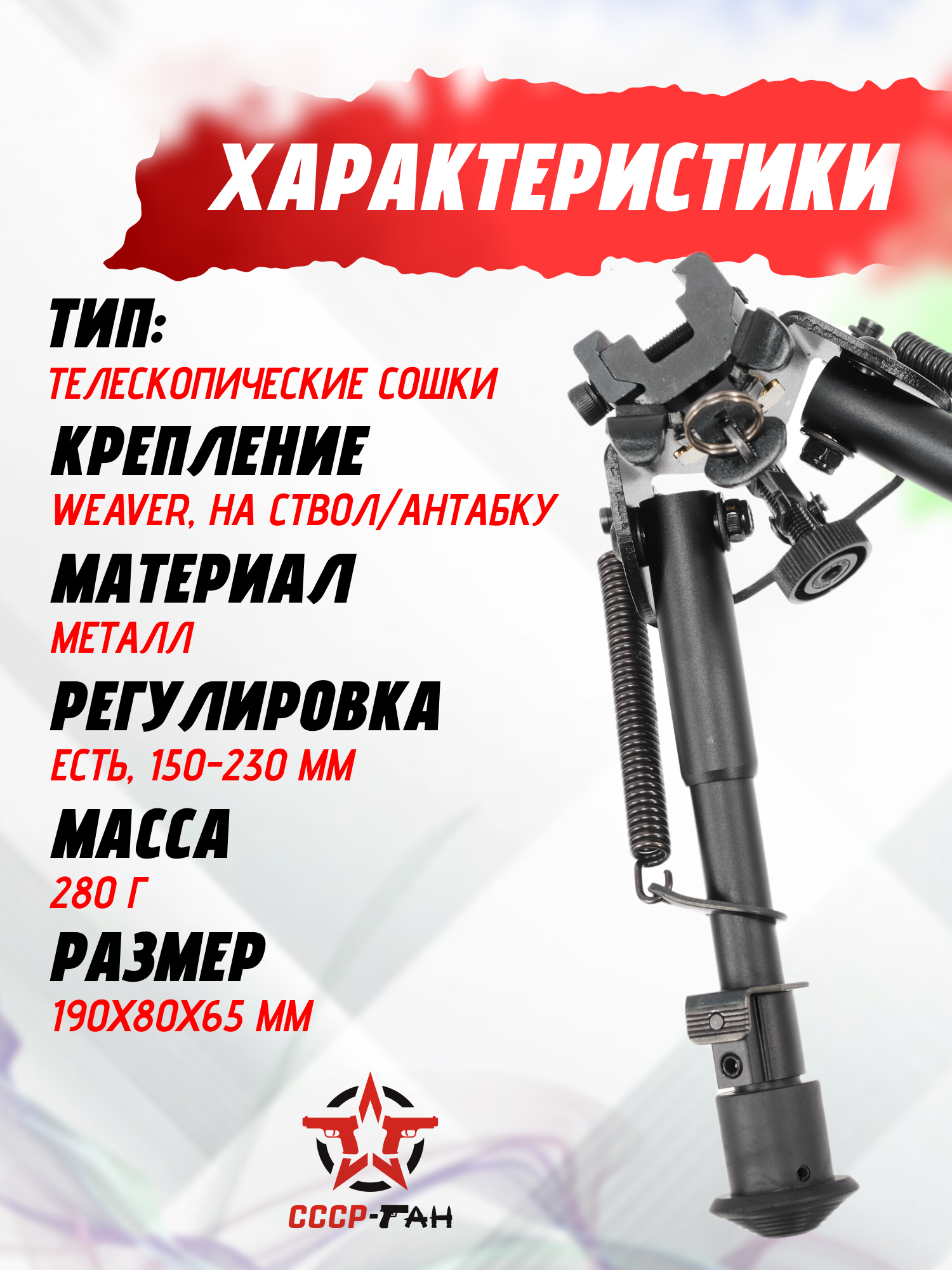 | Комплект поставки | Сошки, кронштейн на ствол, переходник под антабку, монтажные винты, шестигранник, упаковка |