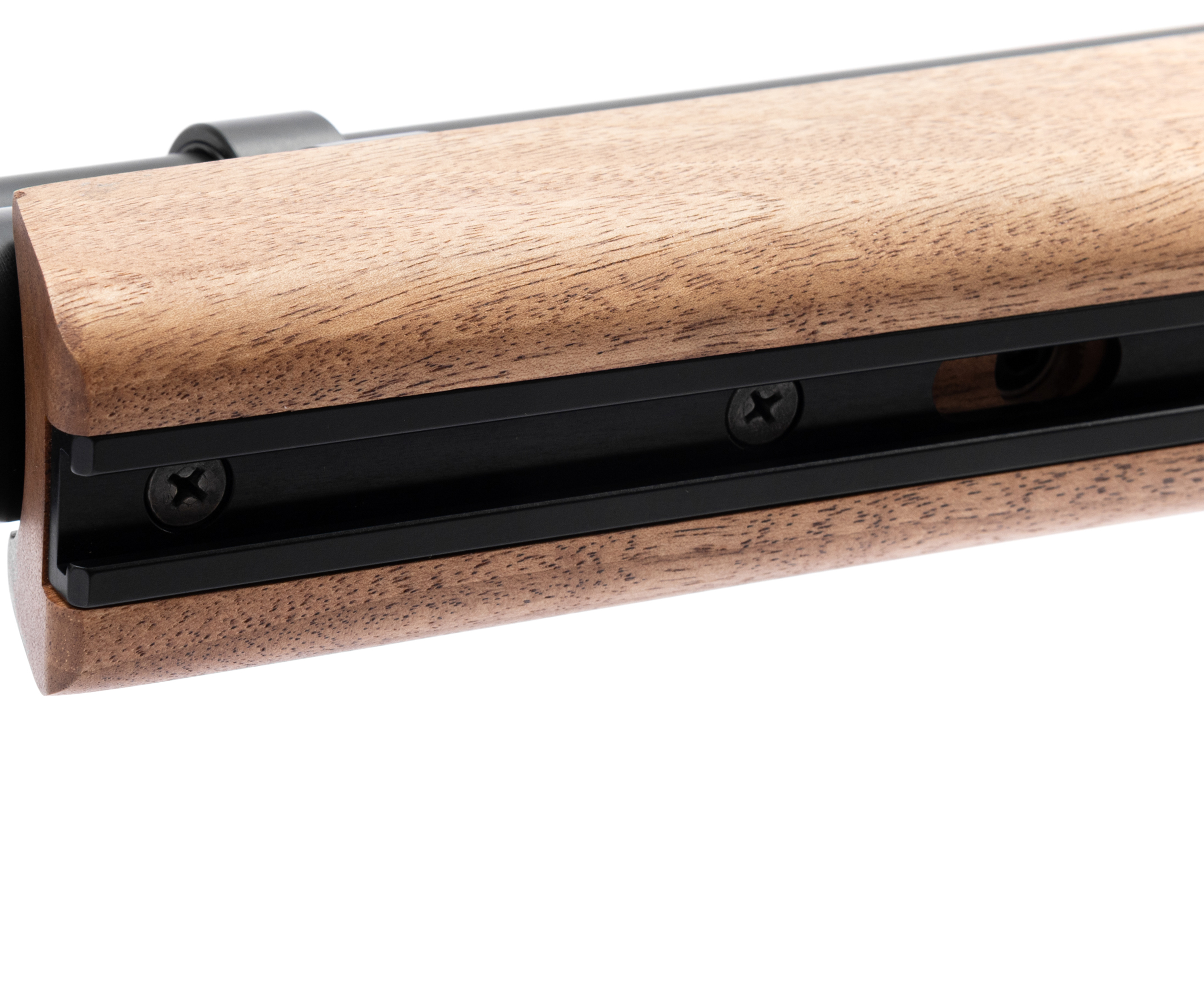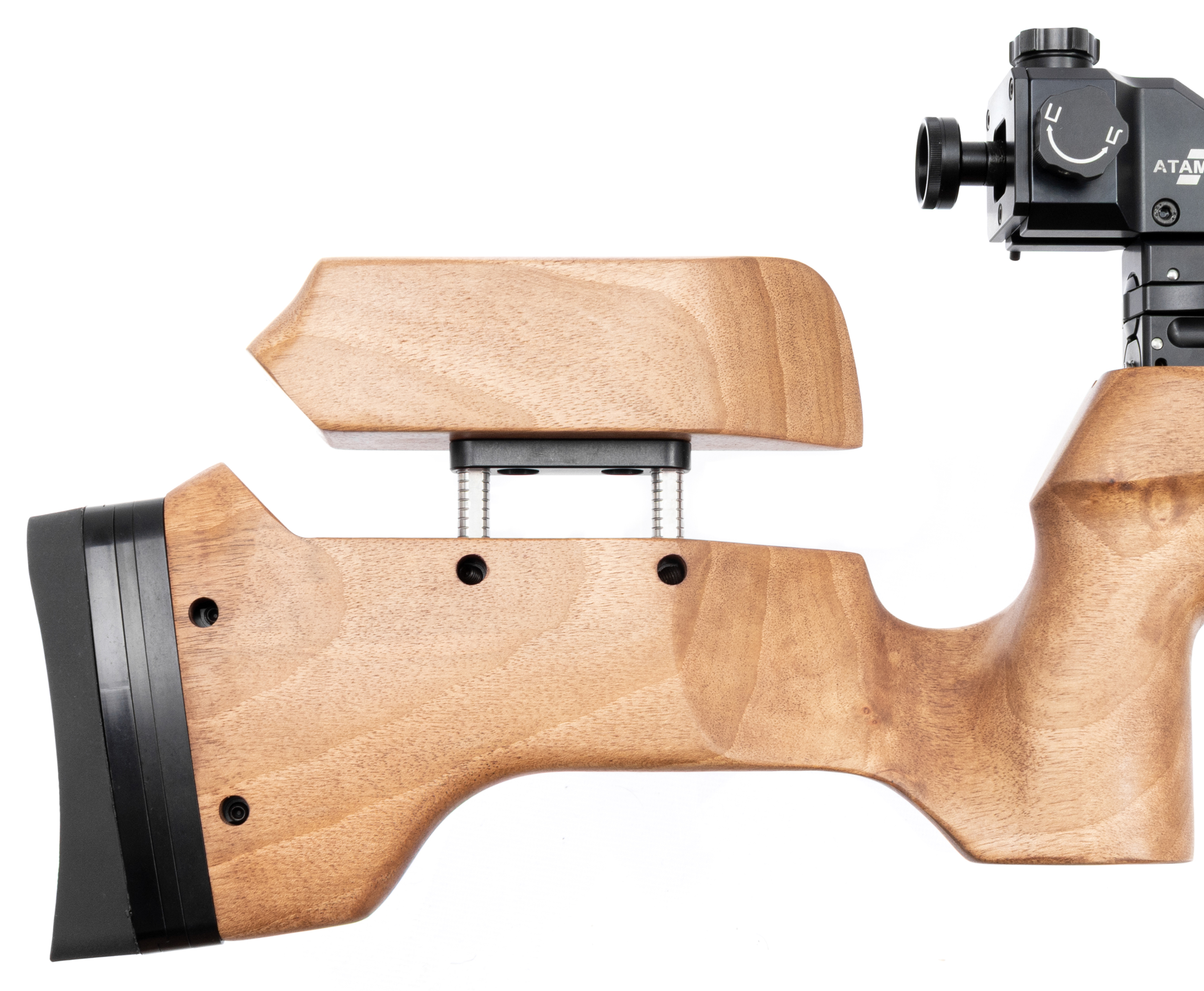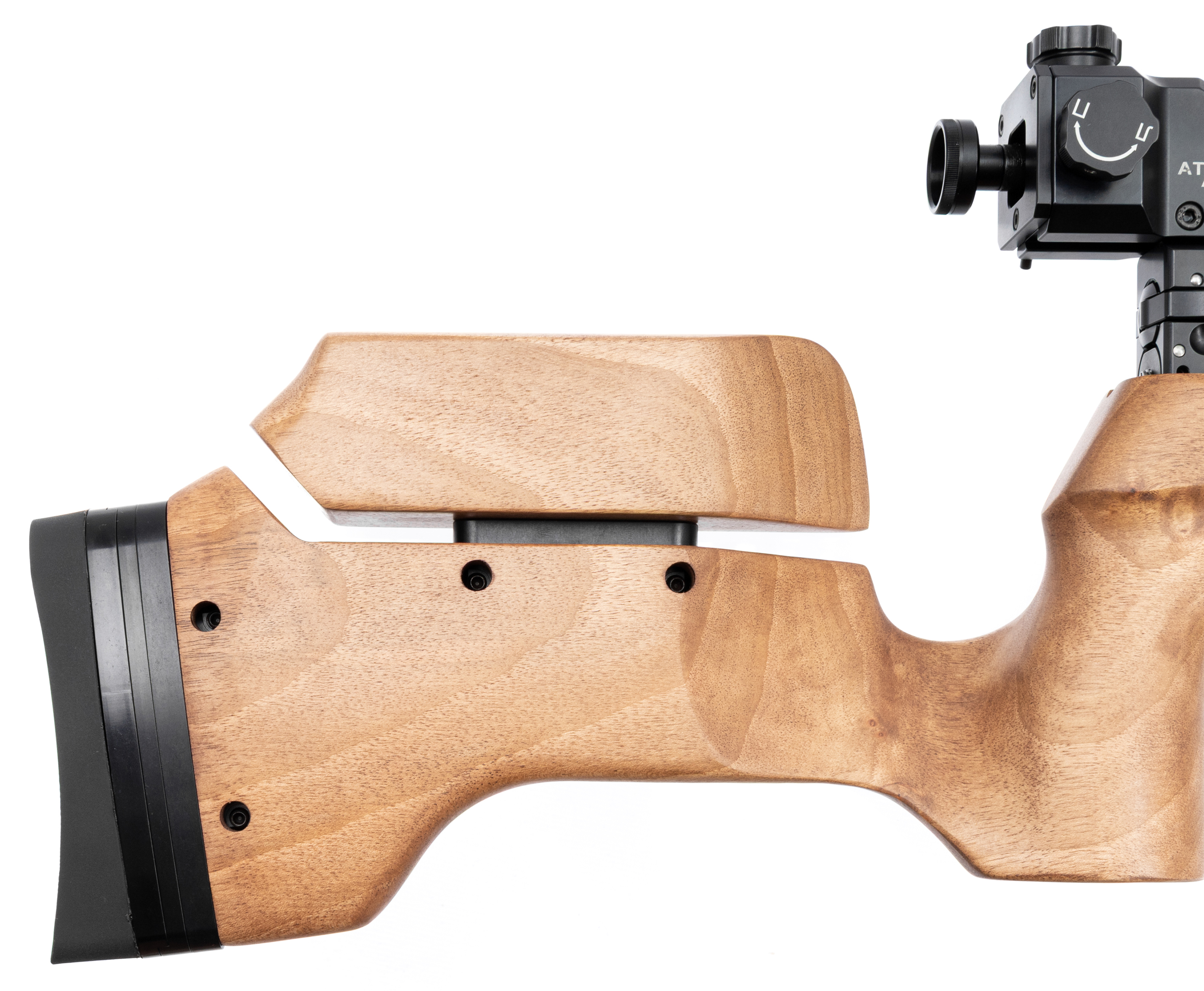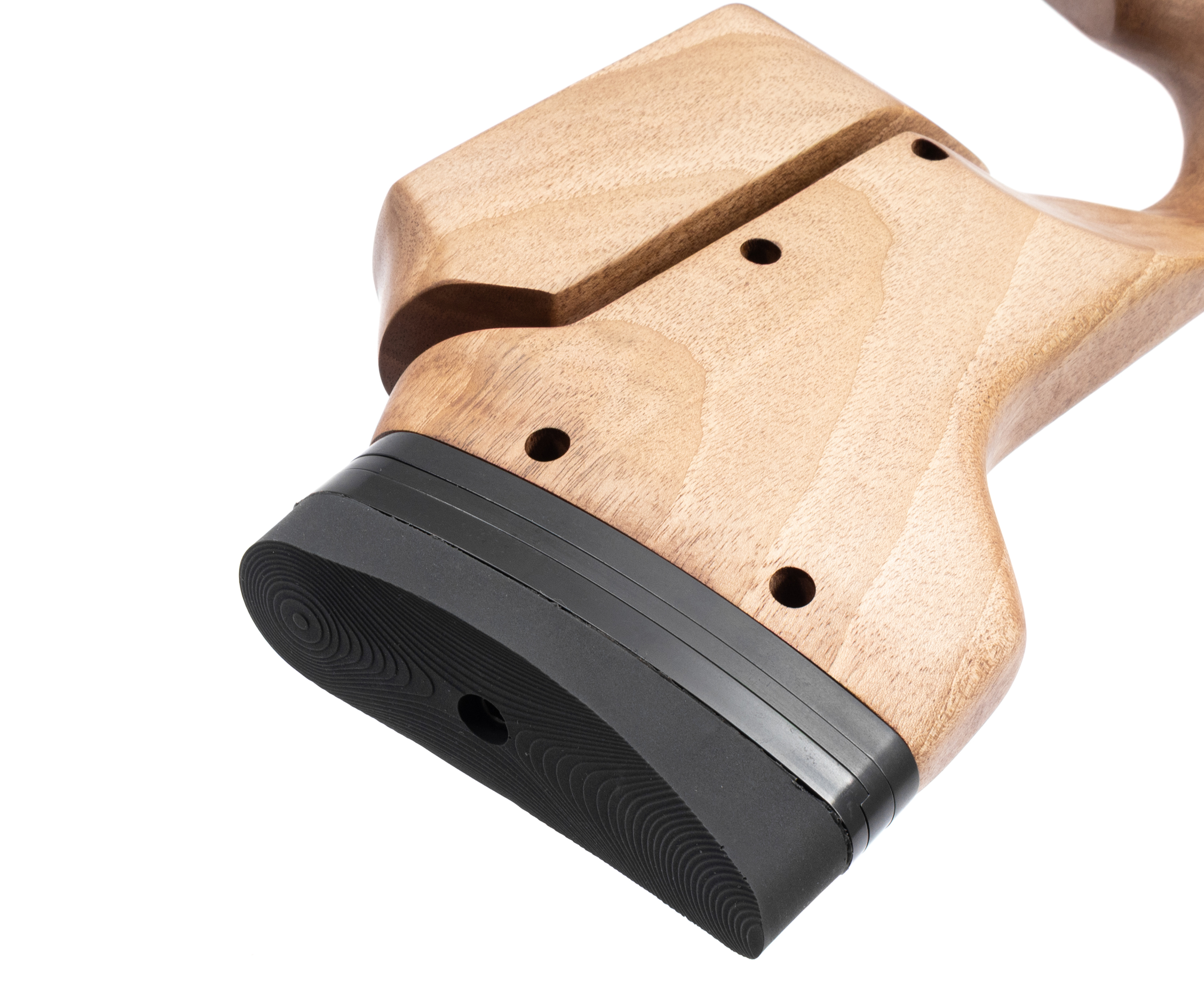 Ложе выполнено из орехового дерева, придающего винтовке благородный внешний вид. Материал отличается приятной текстурой, хорошо ложится в руку, снижает скольжение и эффективно гасит вибрации при эксплуатации. Форма приклада разработана специально для продолжительных тренировок, гарантируя удобную вкладку и комфортную работу с платформой.