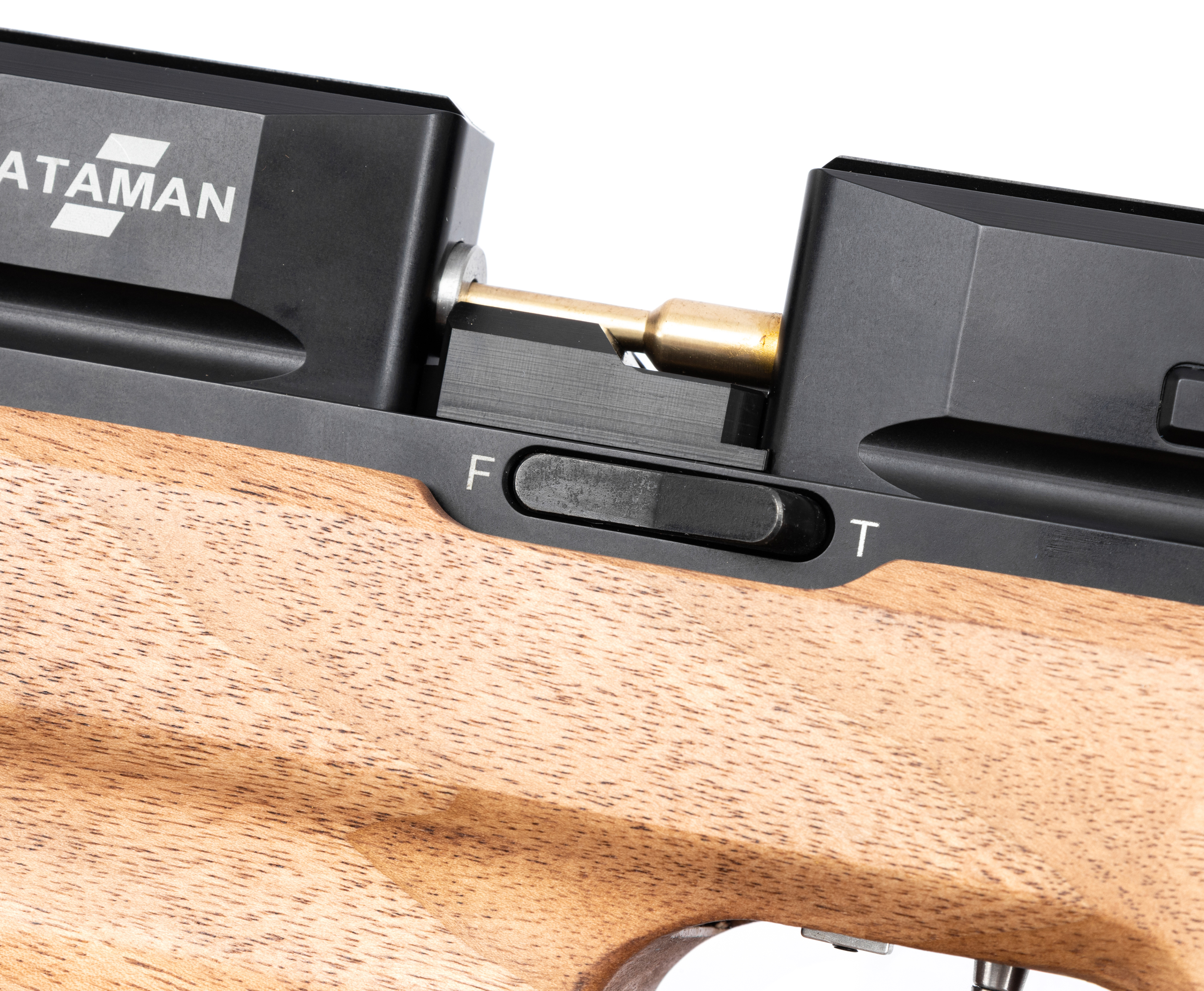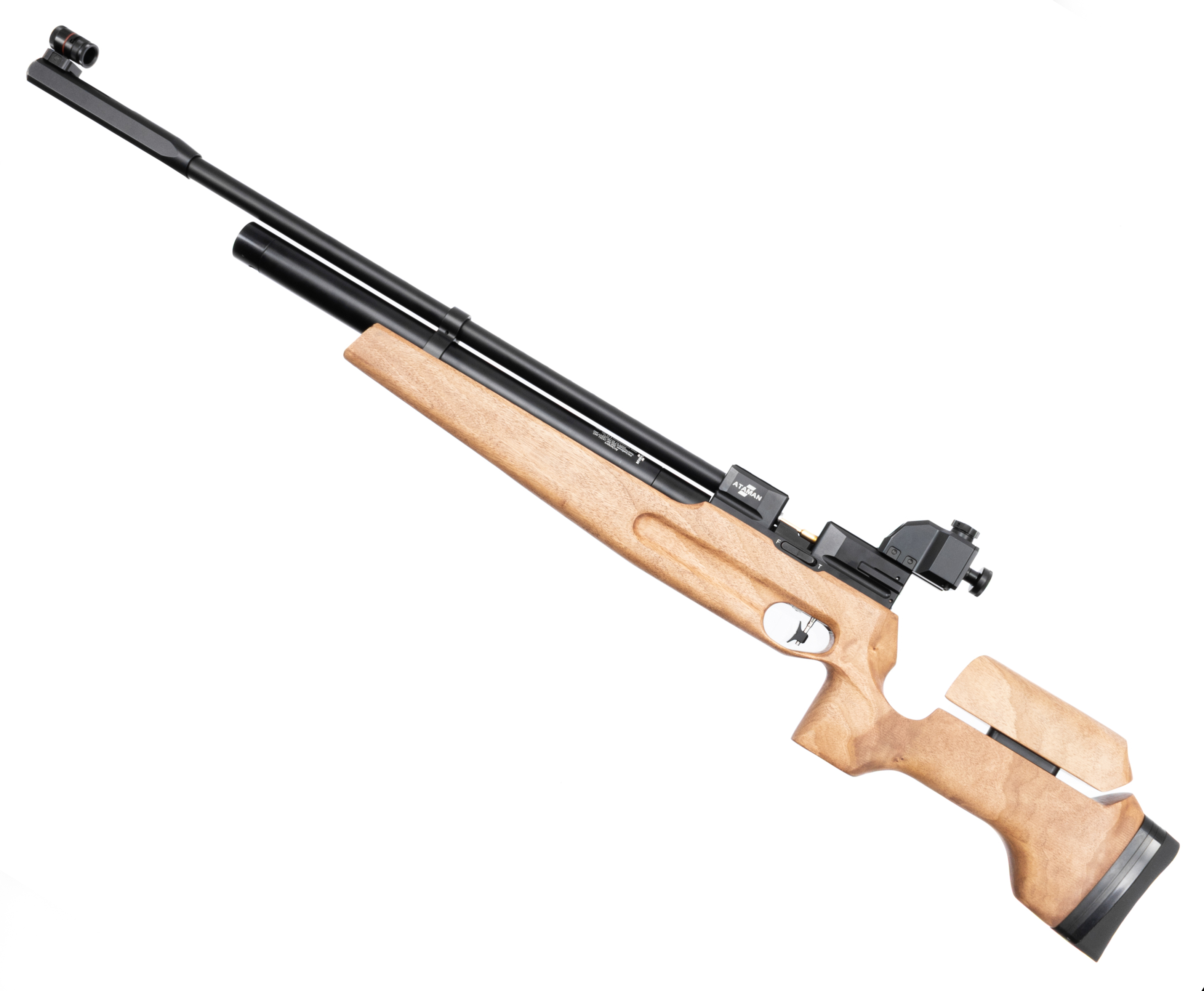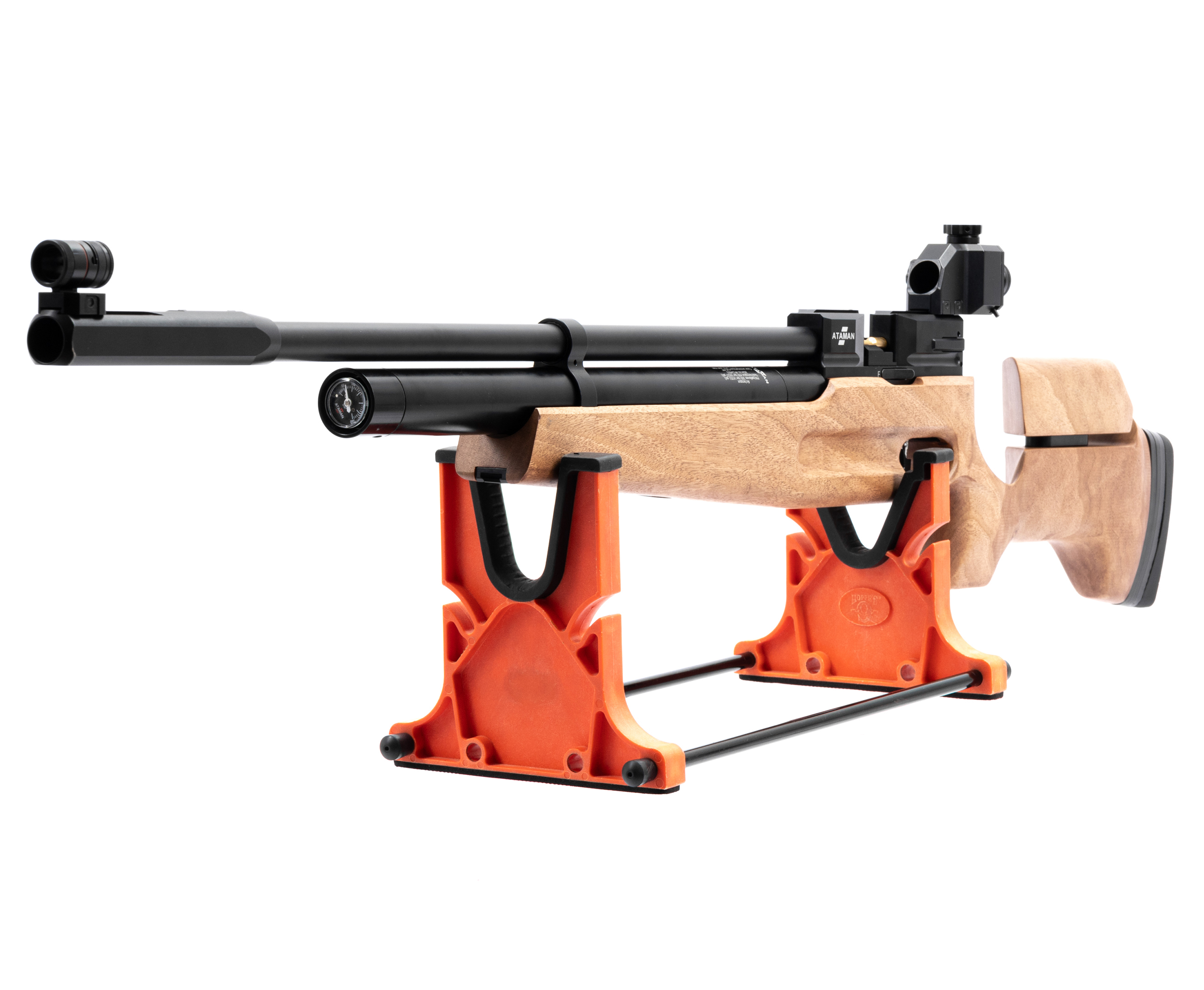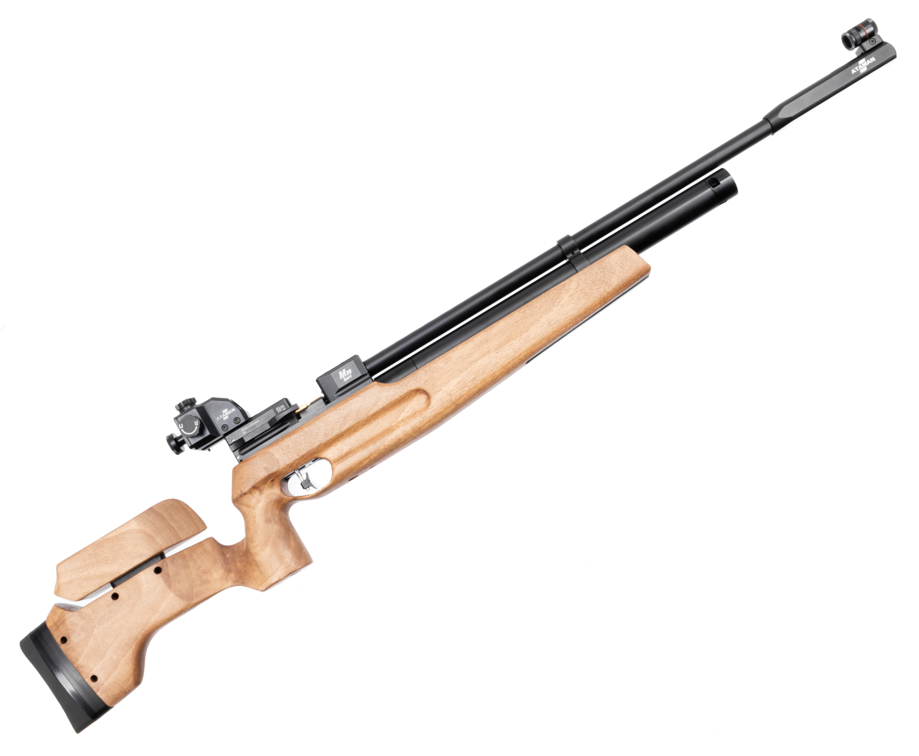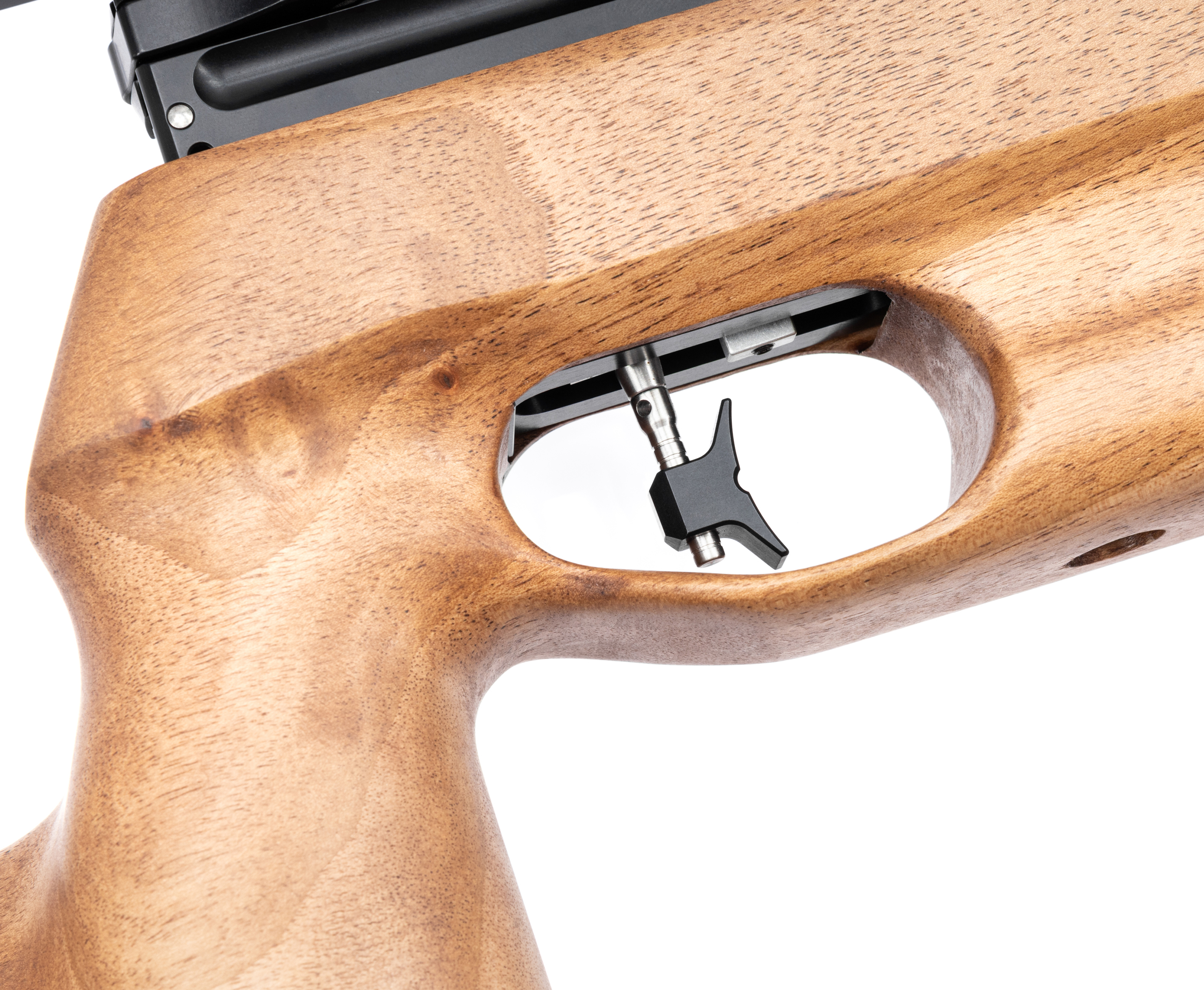 Ложе выполнено из орехового дерева, придающего винтовке благородный внешний вид. Материал отличается приятной текстурой, хорошо ложится в руку, снижает скольжение и эффективно гасит вибрации при эксплуатации. Форма приклада разработана специально для продолжительных тренировок, гарантируя удобную вкладку и комфортную работу с платформой.