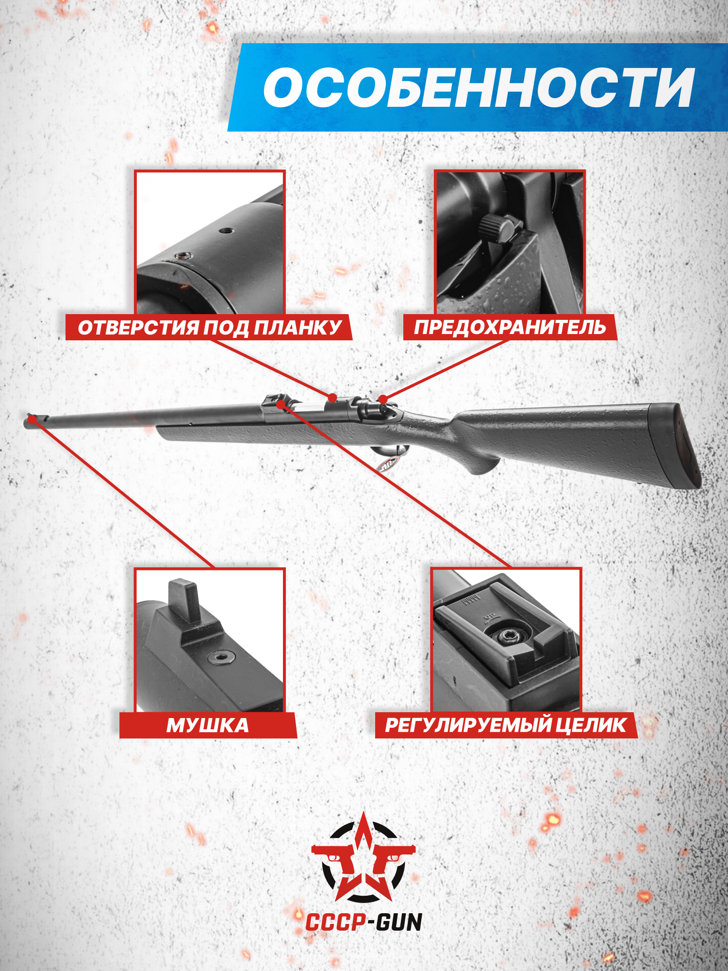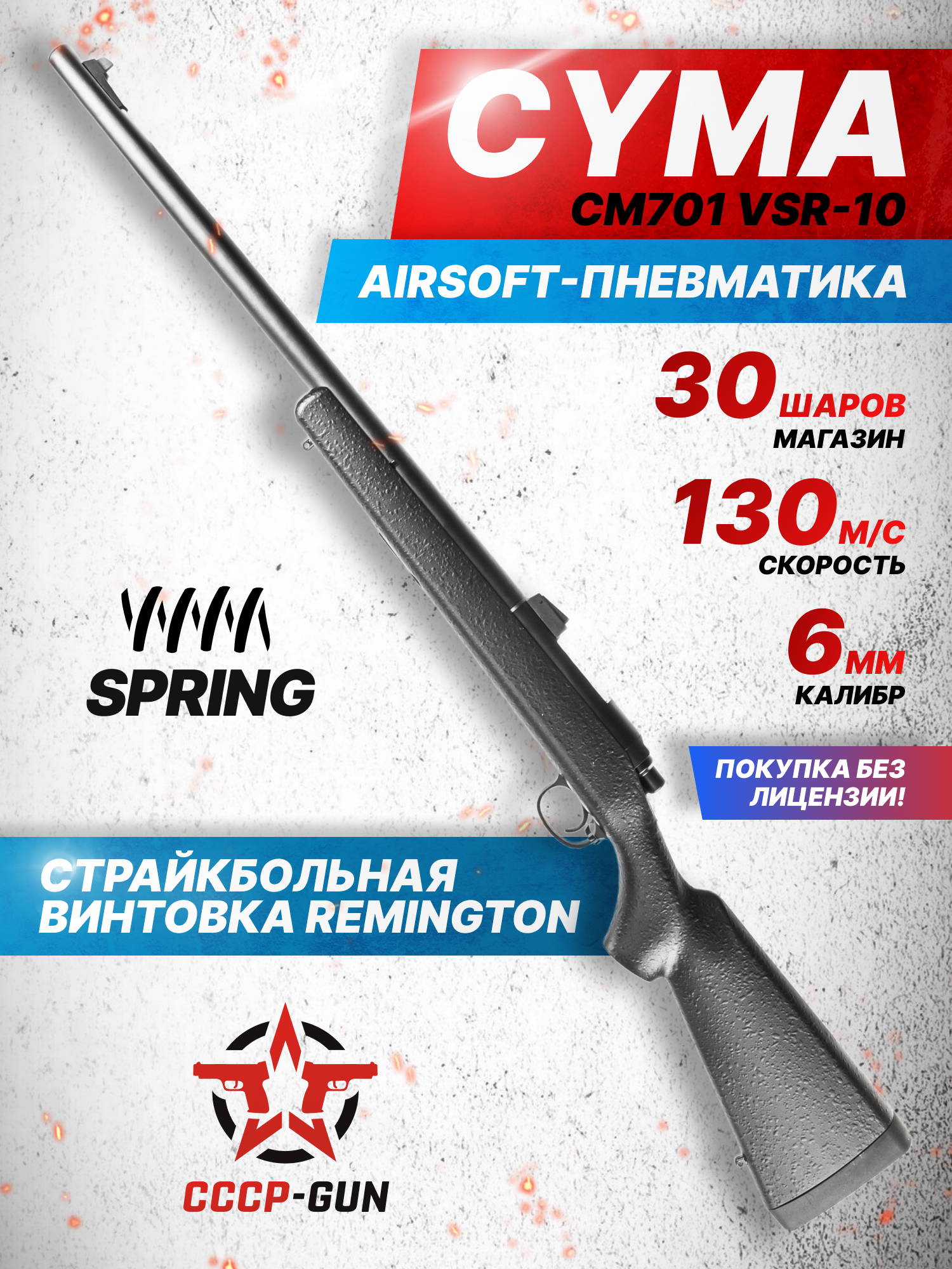 Согласно заявлениям производителя, обозреваемая снайперская винтовка Cyma VSR 10 Spring придает шару начальное ускорение в среднем до 130 метров в сек - при таком параметре формируется перспектива поражать игроков-оппонентов на большем удалении. Штатно для наведения применяются открытые мушка и целик - ко всему этому присутствуют резьбовые гнезда на верхней части ствольной коробки, служащие для закрепления планки под оптический прицел.