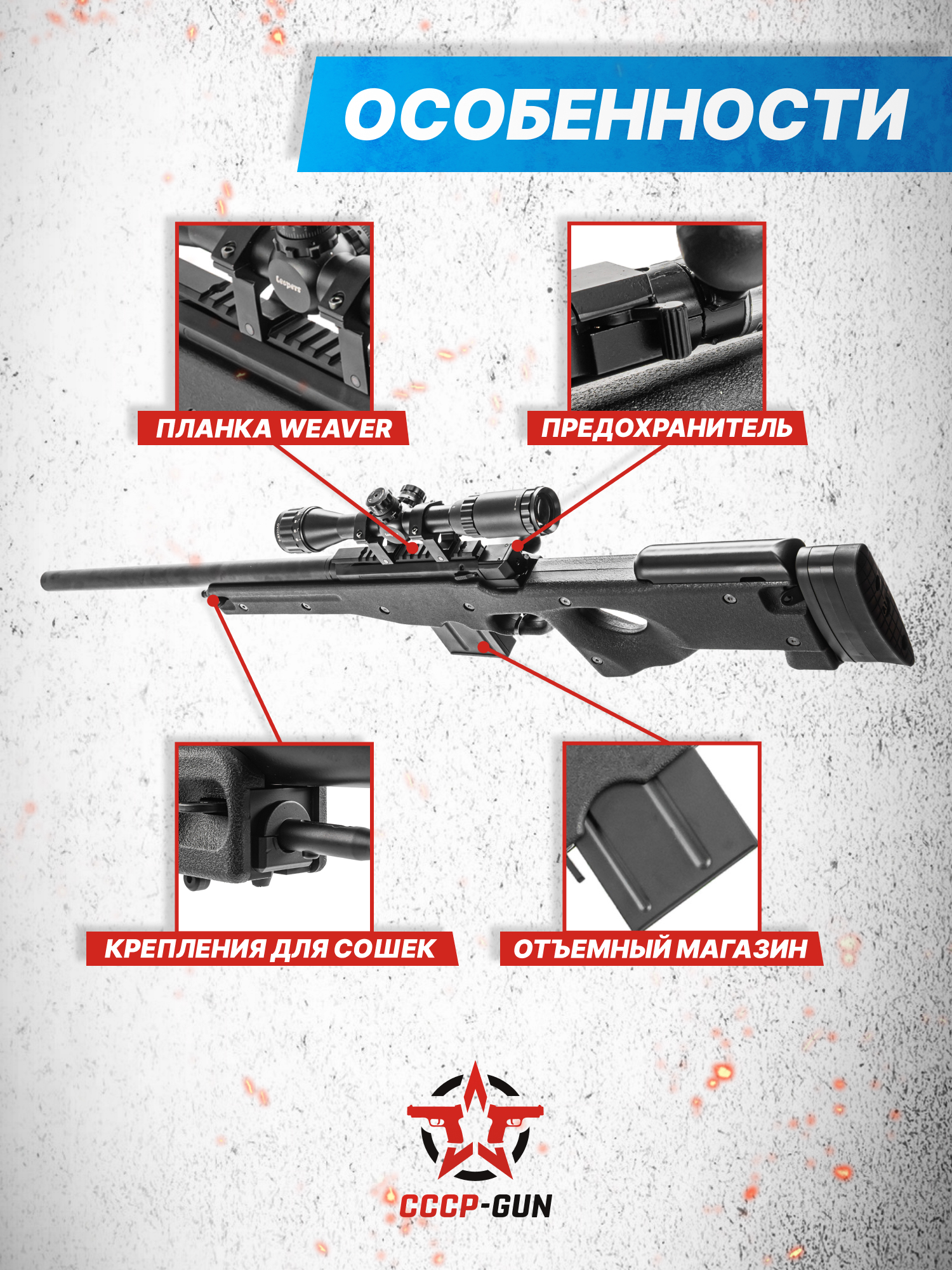 Страйкбольная винтовка L96 спроектирована для поражения участников игры на существенной дистанции - в своей стандартной конфигурации модель способна разогнать 6-миллиметровый шарик до 150 м. в сек. Дополнительно в конструкции заложена возможность корректировки траектории полета вылетающего заряда посредством Хоп-Ап. Настройка узла производится при помощи поворотного регулятора, местоположение которого скрыто под пятисотмиллиметровым стволом.