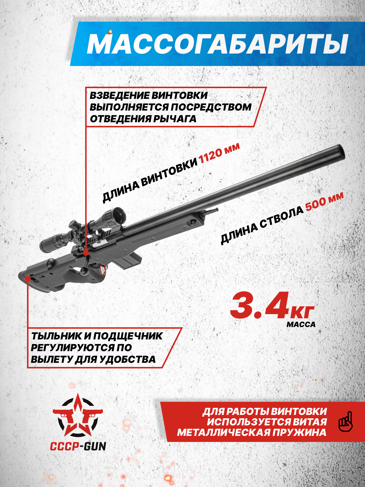 Примечательно, что рассматриваемое исполнение страйкбольной винтовки использует идентичный принцип отправки снаряда в бланк, как и огнестрельные аналоги - однако в процессе этого действия дополнительно происходит сжатие внутренней витой пружины. Последняя после нажатия на спуск толкает поршень, в результате чего формируется область повышенного давления внутри компрессионной камеры, что в конечном итоге и приводит к выстрелу.