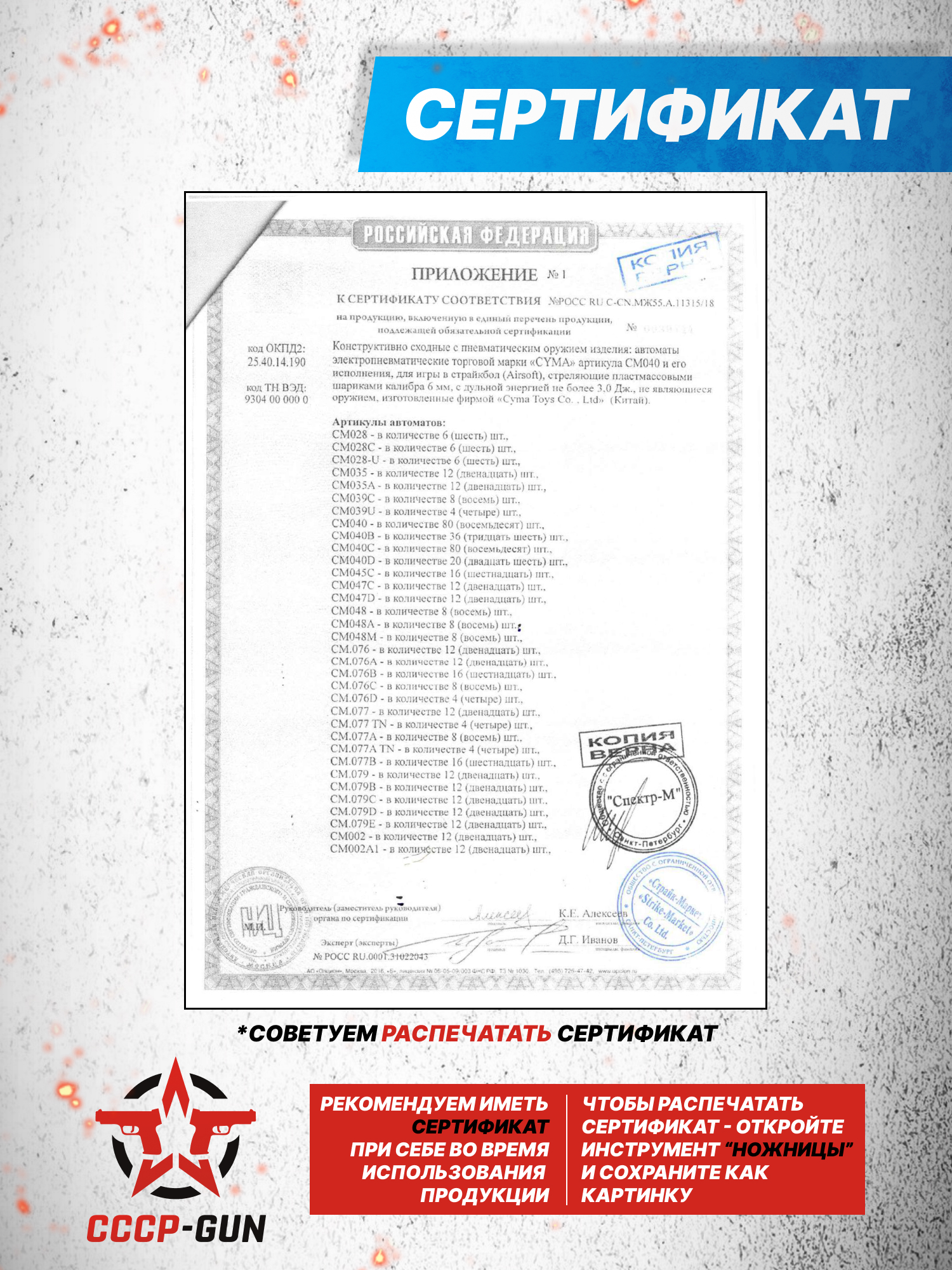 В целом, Cyma CM040 - это вариант электропривода для тех, кто уже начал погружаться в мир страйкбола, а также для любителей тюнинговать и увеличивать производительность своего оружия. Относительно недорогой и вместе с тем надежный автомат благодаря отличному исполнению прослужит своему владельцу долгие годы.