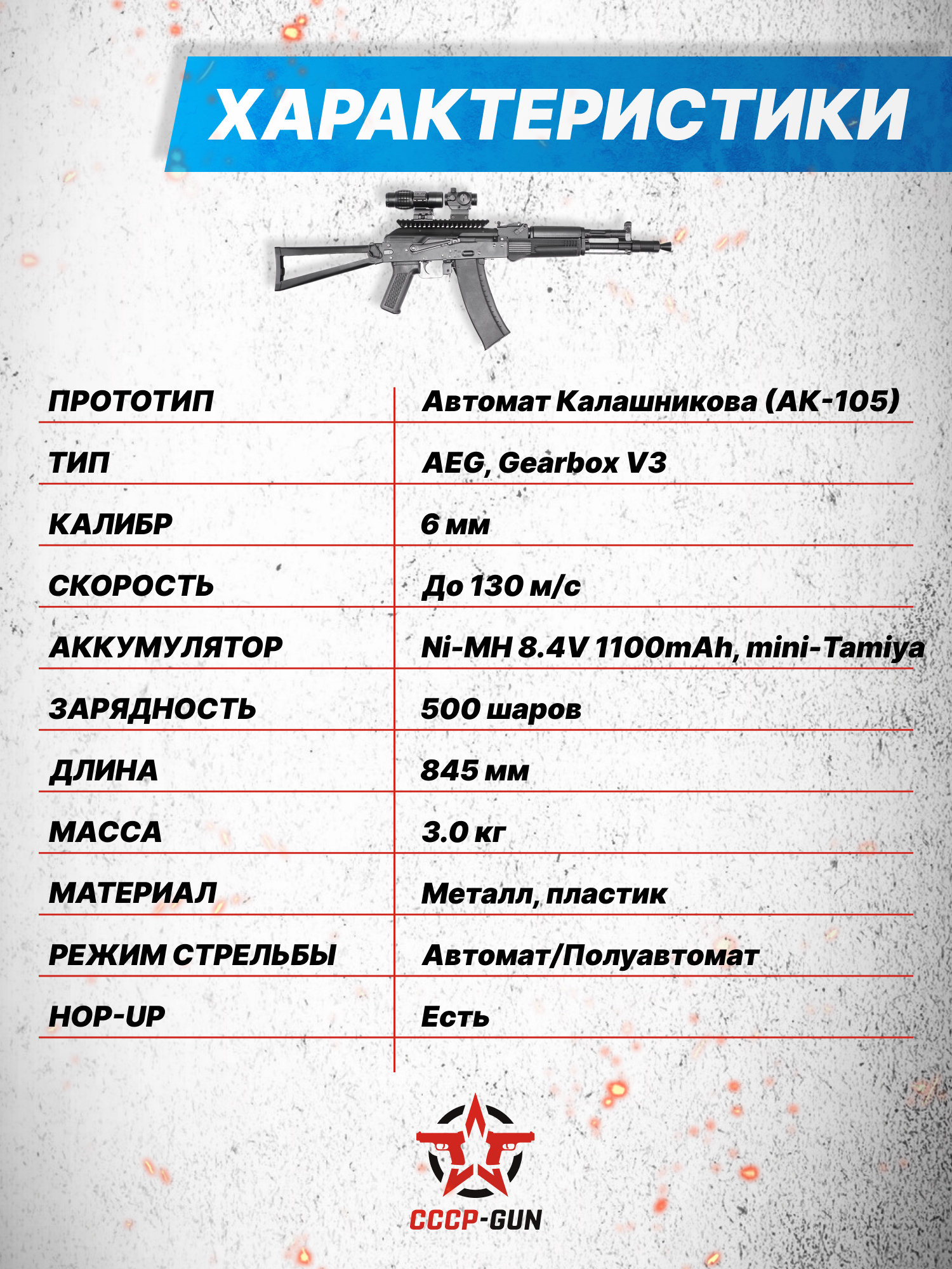 Внешний облик автомата копирует боевую единицу АК 105 стоящую на вооружении российской армии. Массо - габаритные показатели модели максимально приближены к оригиналу. Так длина привода в со сложенным прикладом равна 606 мм, а полная длина - 838 мм.