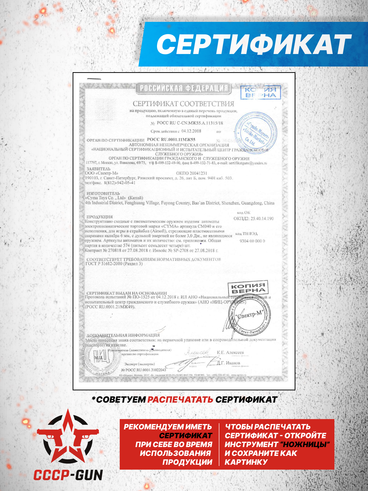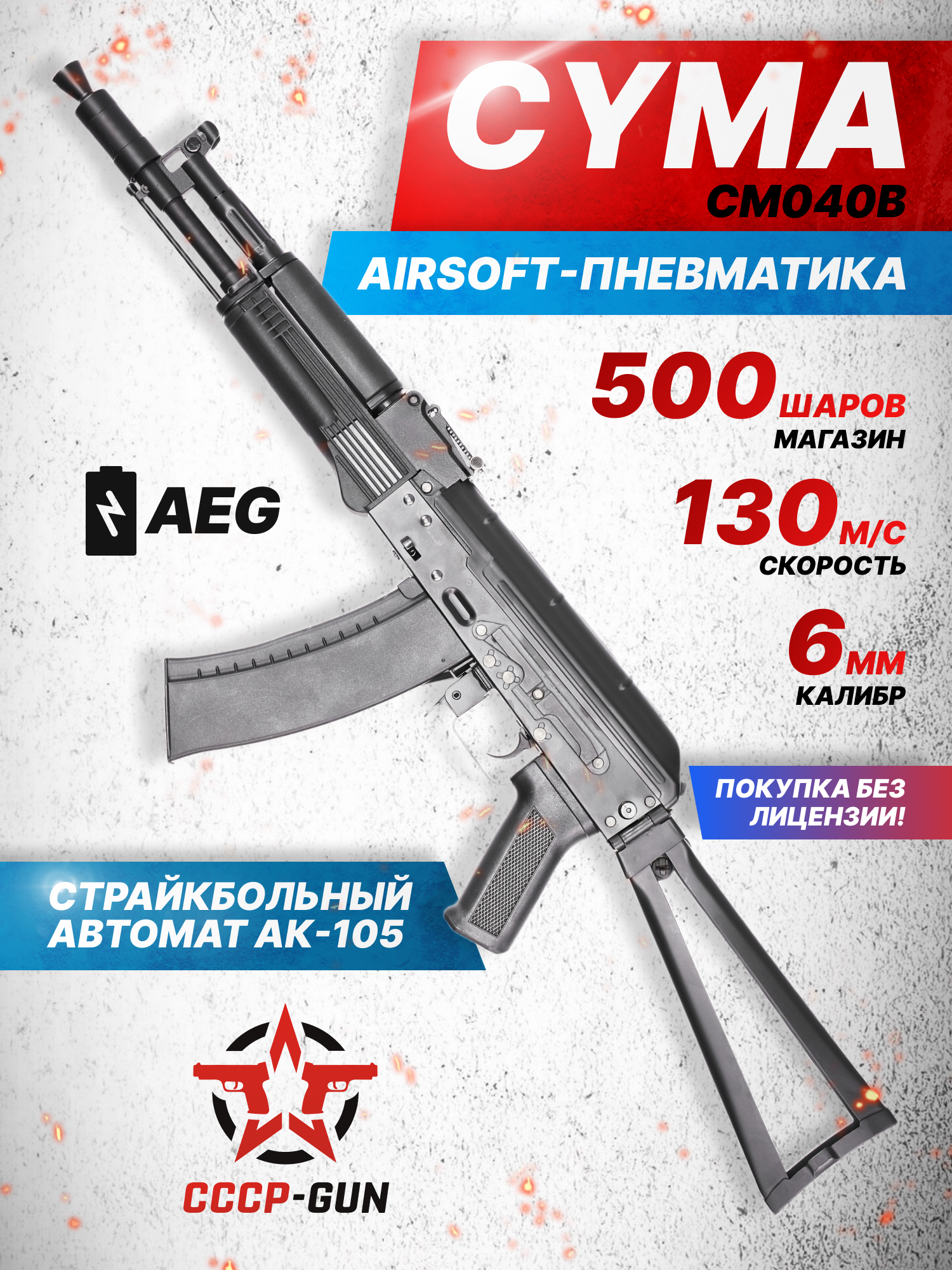 Страйкбольный электро - пневматический привод Cyma CM040B поставляется в полной комплектации включающей аккумуляторную батарею Ni-MH, зарядное устройство и бункерный магазин на 500 зарядов.