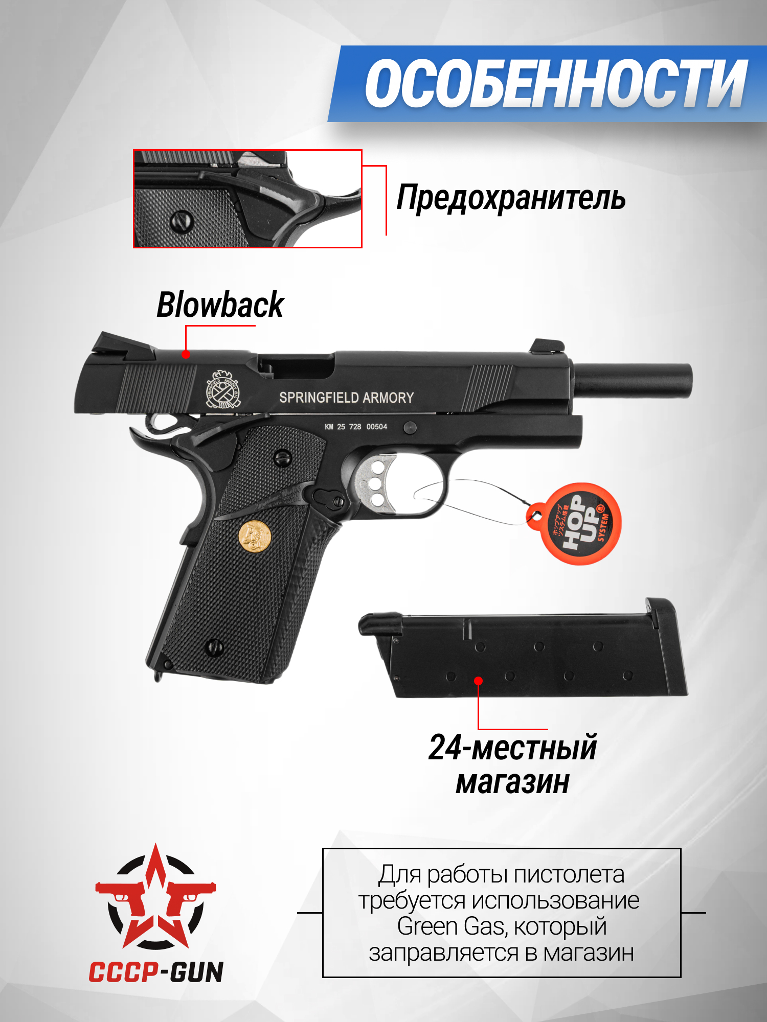 Магазин пневматики может содержать до 24 шаров 6 мм, а для его отсоединения от пистолета требуется нажать кнопку, которая размещена на рукоятке. Кроме того, инженеры оснастили модель двумя отдельными предохранителями, а также предусмотрели задержку затвора - когда все шарики заканчиваются, кожух замирает и остается в тыльной позиции.