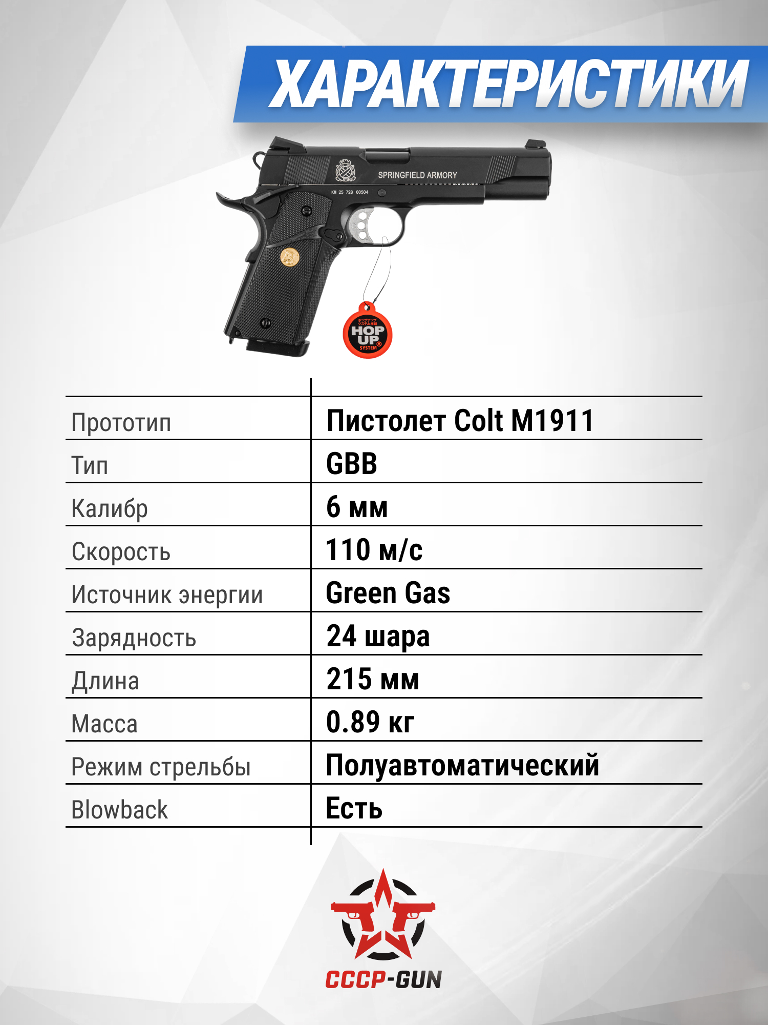 Представленный пневматический Colt 1911 Blowback может придавать шарикам из пластика скорость до 110 метров в секунду, что выступает оптимальным значением для короткоствольной страйкбольной пневматики. Рекомендуется использовать боеприпасы с весом 0.20-0.25 грамма.