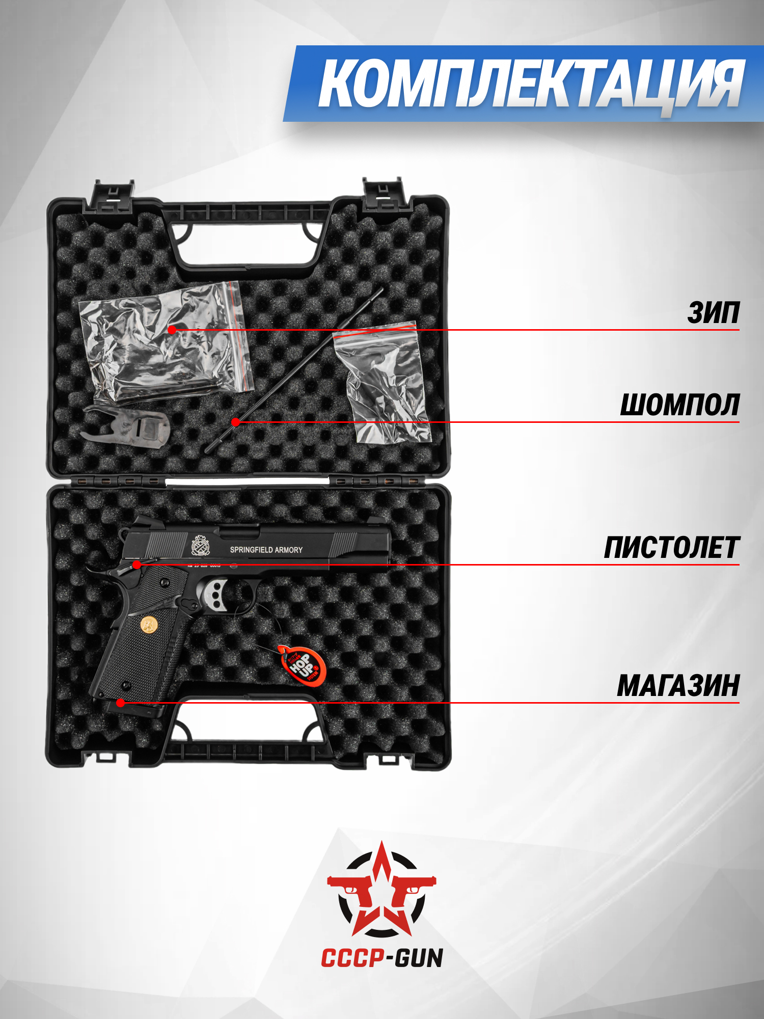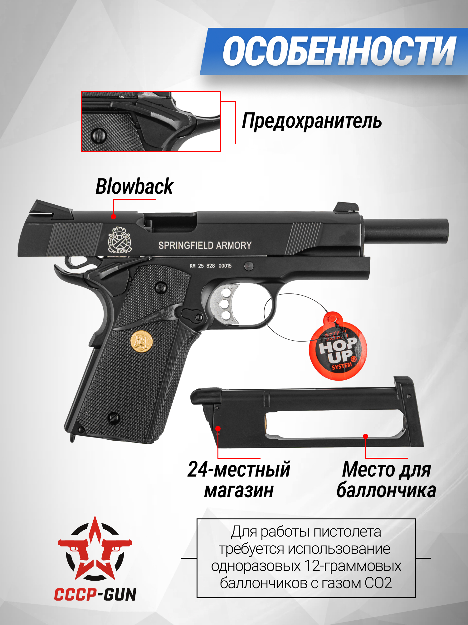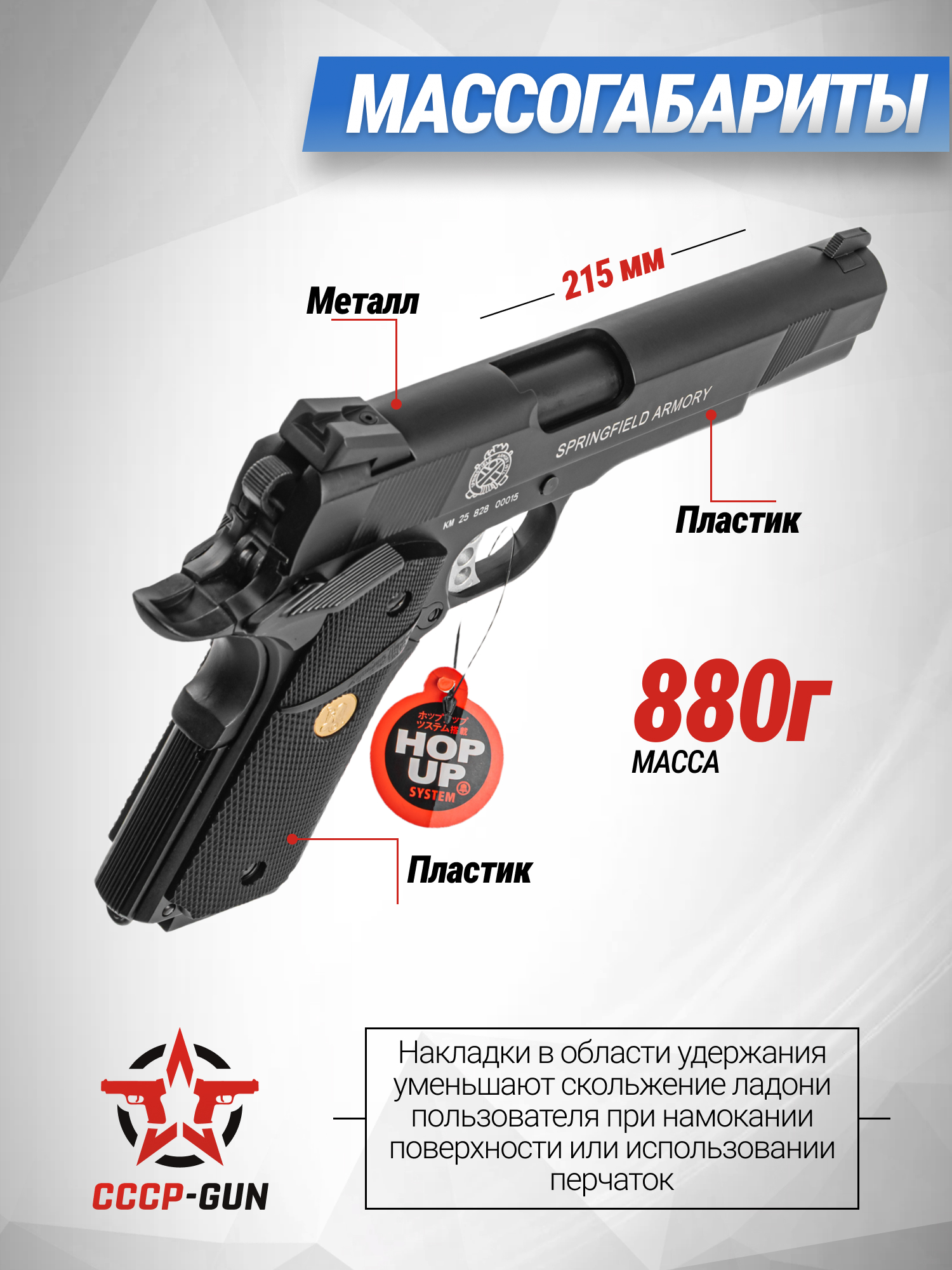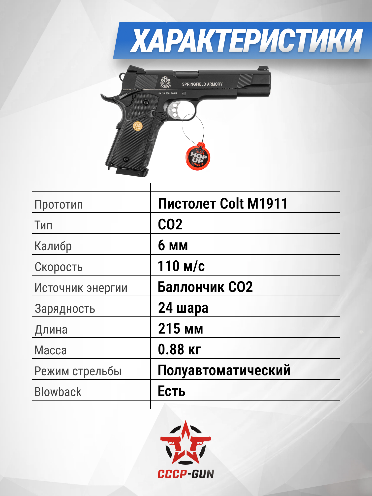 Примером мягкой пневматики из товарного ряда производителя является обозреваемый пистолет CLT 1911 MEU - его масса достигает 880 граммов при длине 215 мм, что соответствует прототипу. Такого показателя инженерам удалось достичь благодаря использованию металлического сплава для изготовления основы, что также заметно повышает ресурс и устойчивость конструкции к нагрузкам. Накладки на рукояти выполнены из полимерного материала в черном оттенке - элементы нужны для комфортного удержания и предотвращения соскальзывания ладони.