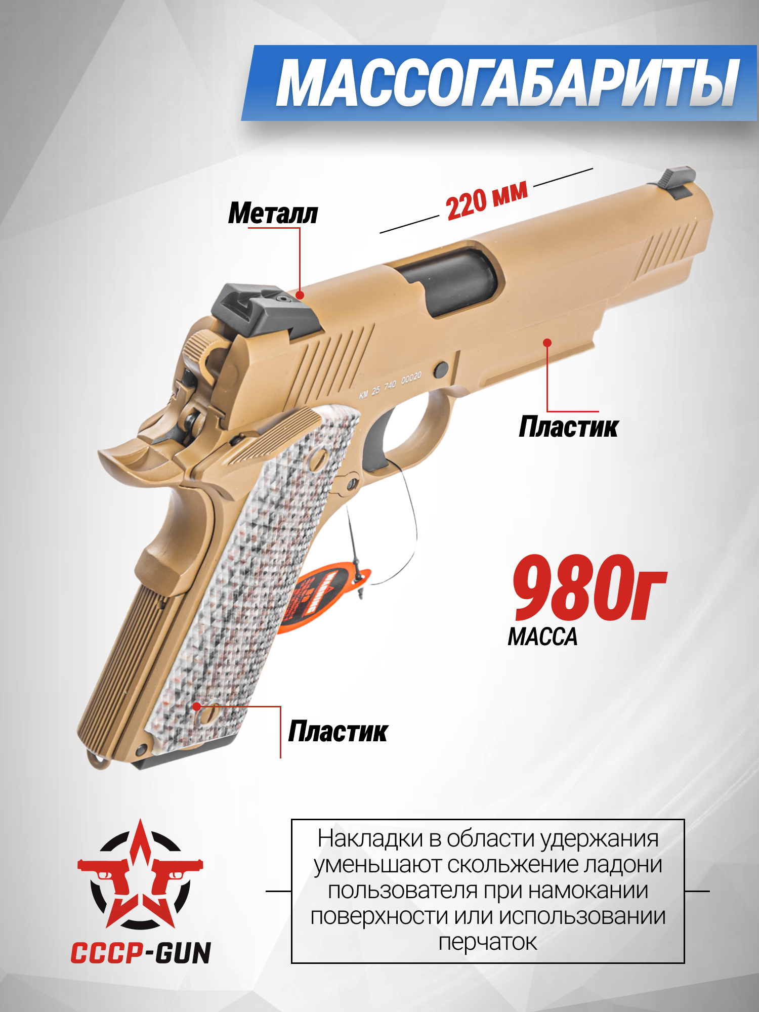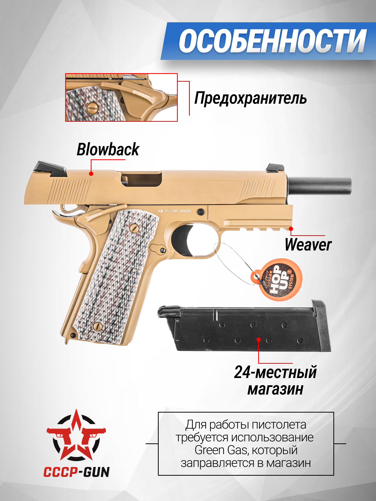 Кроме прочего, страйкбольный пистолет Кольт на Грин Газе предусматривает планку Weaver, позволяющую устанавливать вспомогательные приспособления. Корпус изделия преимущественно выполнен из металлических сплавов, что позволило сформировать итоговый вес 0.92 кг.
