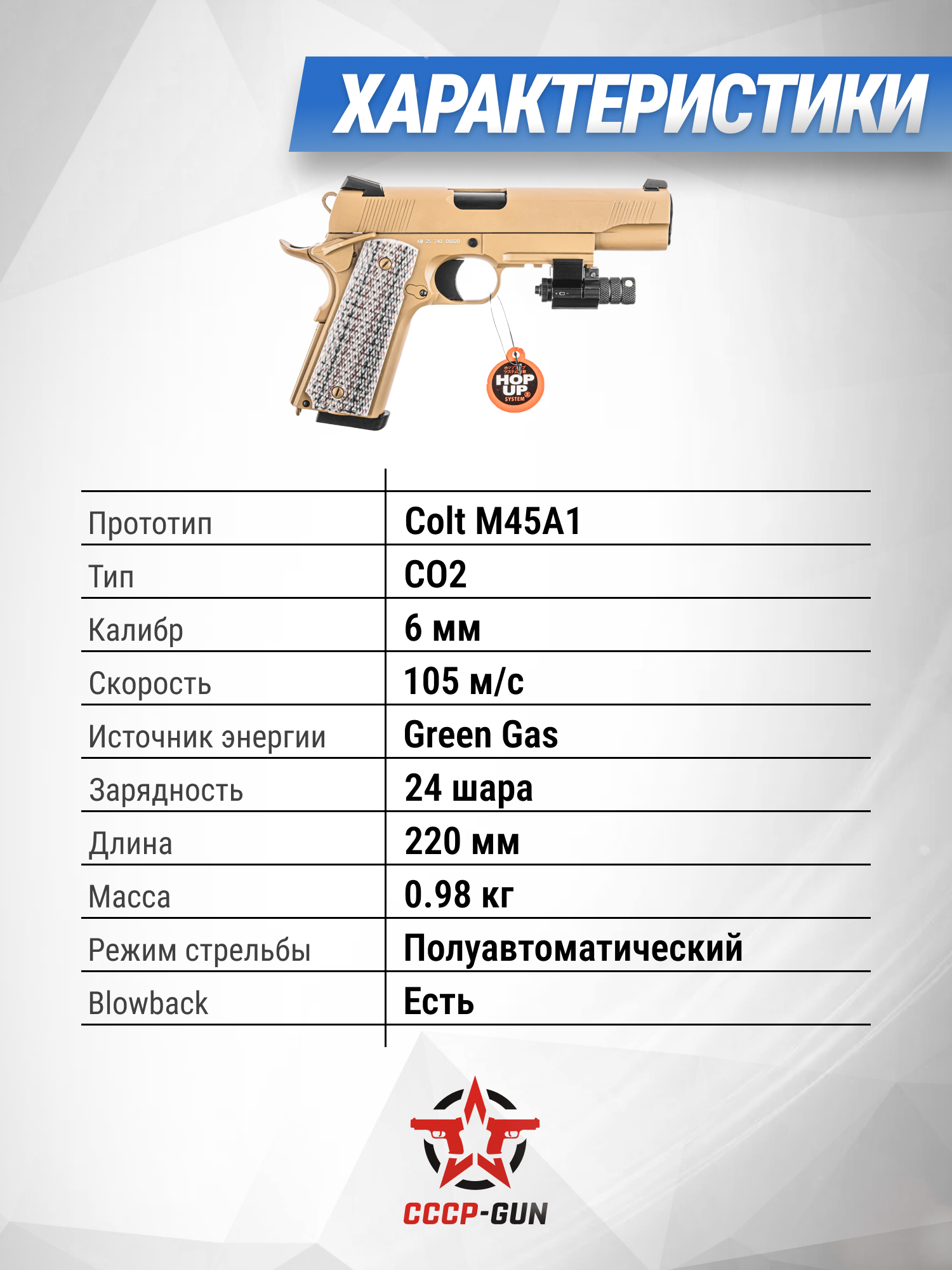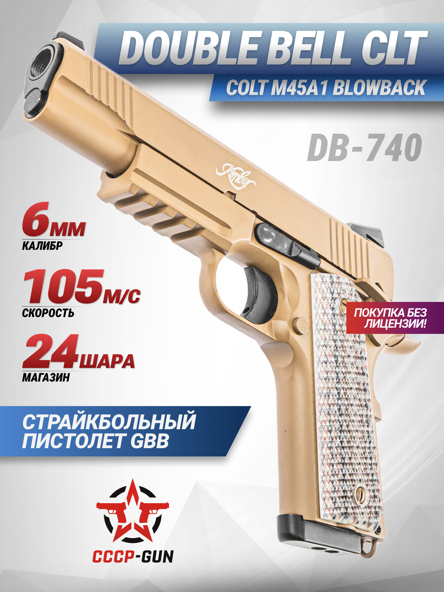 Указанным критериям соответствует представленный пистолет от Дабл Белл - эта модель представляет собой страйкбольное воплощение Colt, причем взята за основу его специализированная версия, спроектированная для выполнения тактических операций под наименованием M45A1. Боевой прототип претерпел фундаментальные изменения для подразделений морской пехоты Соединенных Штатов. Корпус этого экземпляра имеет покрытие песочного тона, а полная длина составляет 220 миллиметров.