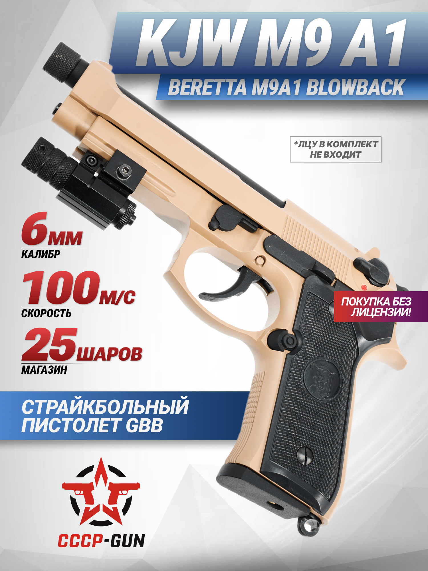 Дульная энергия в конкретном случае не превышает 3 Джоуля, что позволит купить страйкбольный пистолет KJW M9 A1 GBB Tan (6 мм, Blowback) по приемлемой стоимости без наличия лицензии.