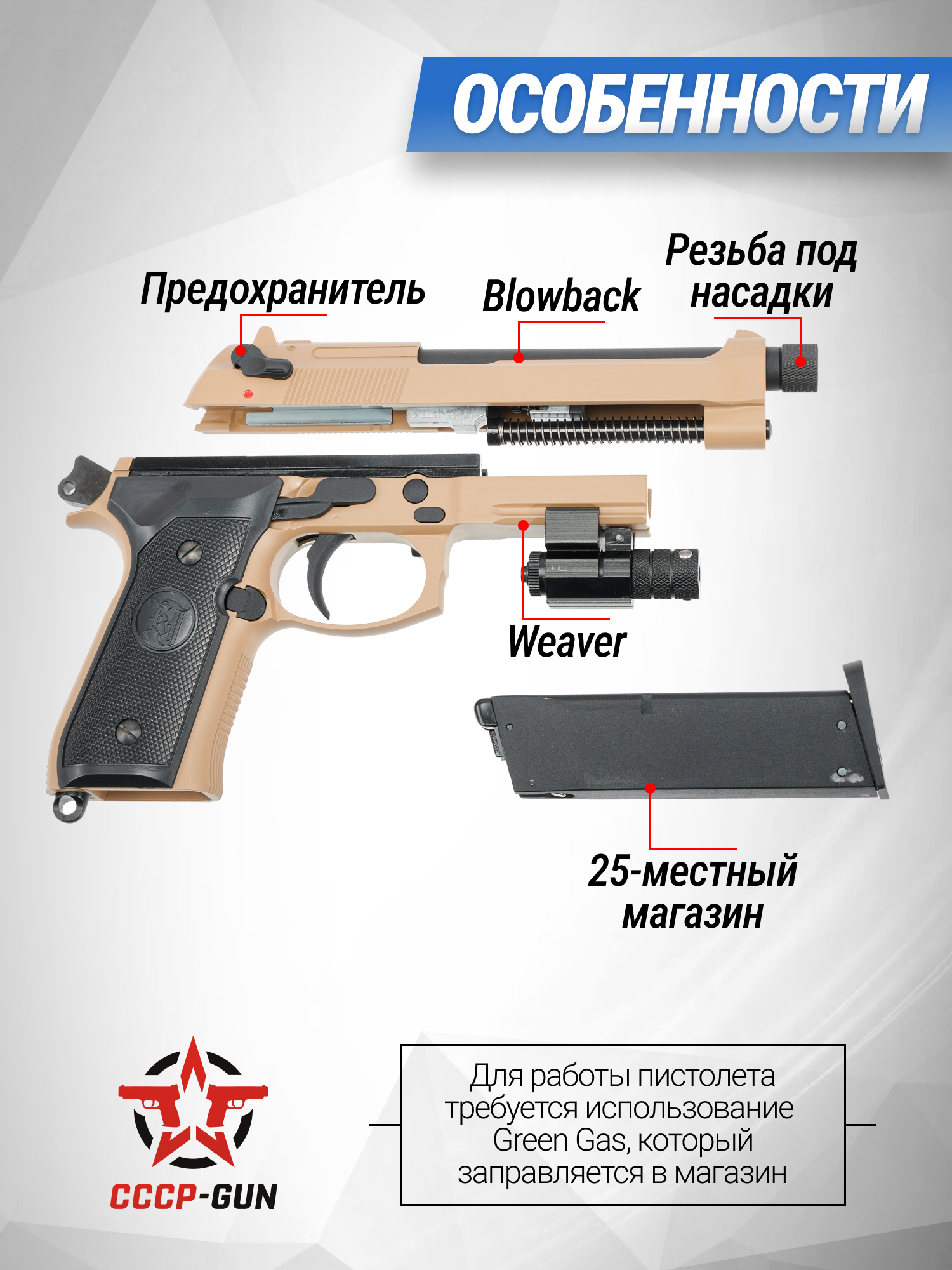 В качестве главной энергии для совершения выстрела из страйкбольных пистолетов КЖВ М9 А1 ББ Тан (6 мм, Блоубэк) выступает газовая смесь стандарта Green Gas. Отсек для ее наполнения находится внутри механического магазина.