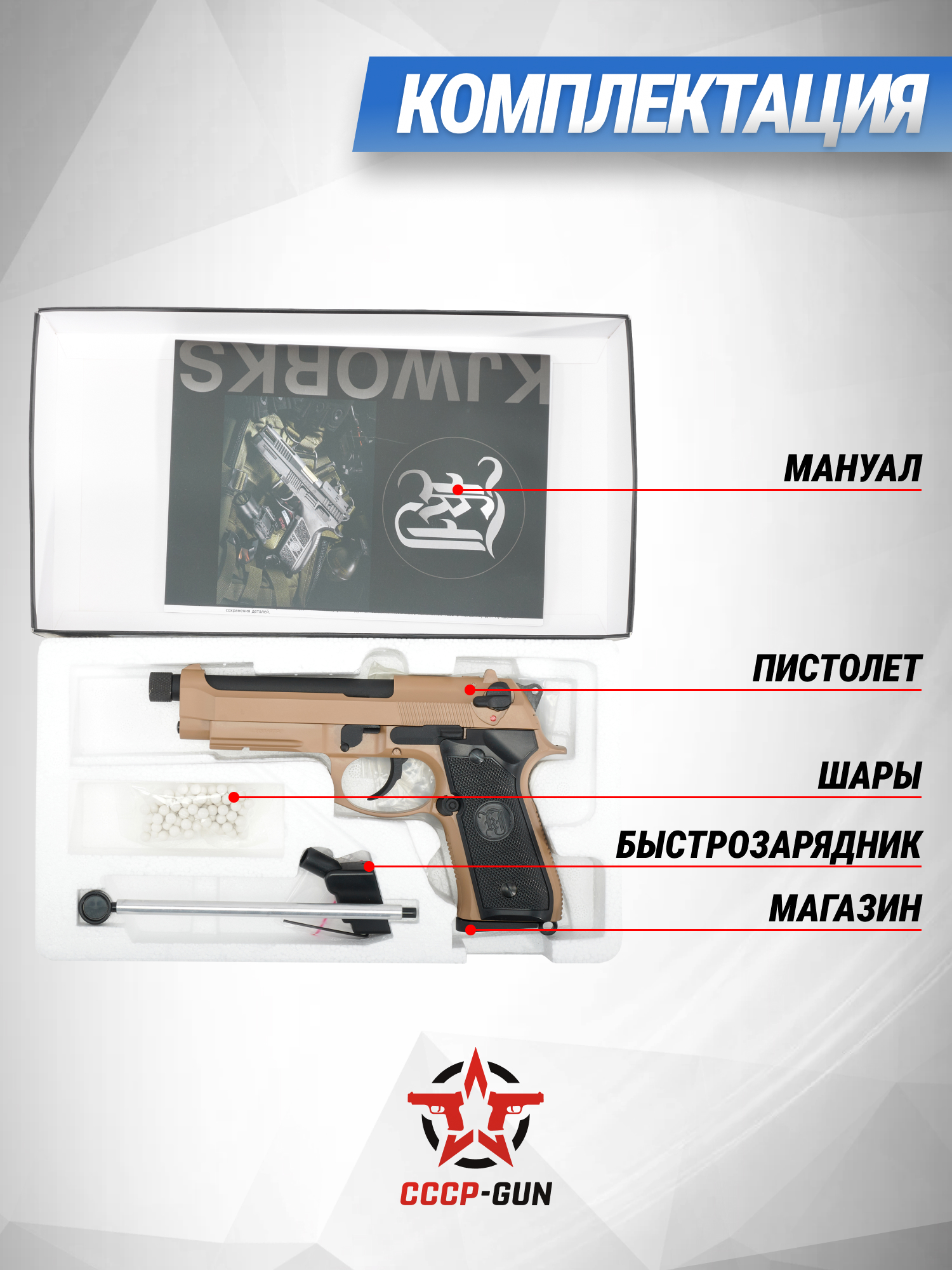 | Комплект поставки | Пистолет, паспорт, магазин, комплект шариков, упаковка |