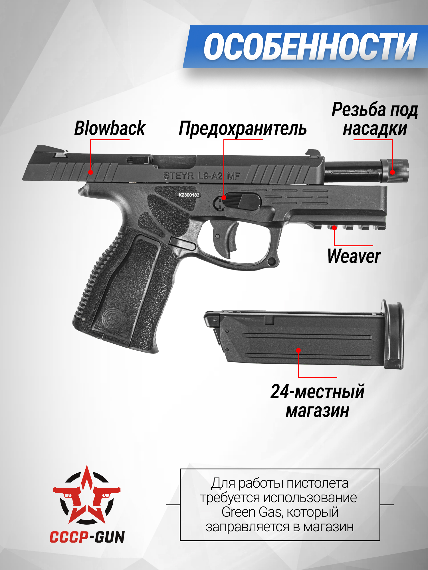 Пистолет Штейр относится к категории Gas Blowback. Это говорит о наличии механизма имитирования движения затвора, что происходит в огнестрельном прототипе при стрельбе. После нажатия на спуск страйкбольного образца слайд сдвинется назад и вернется вперед - учитывая конструкцию УСМ также потребуется взводить оружие перед стрельбой.