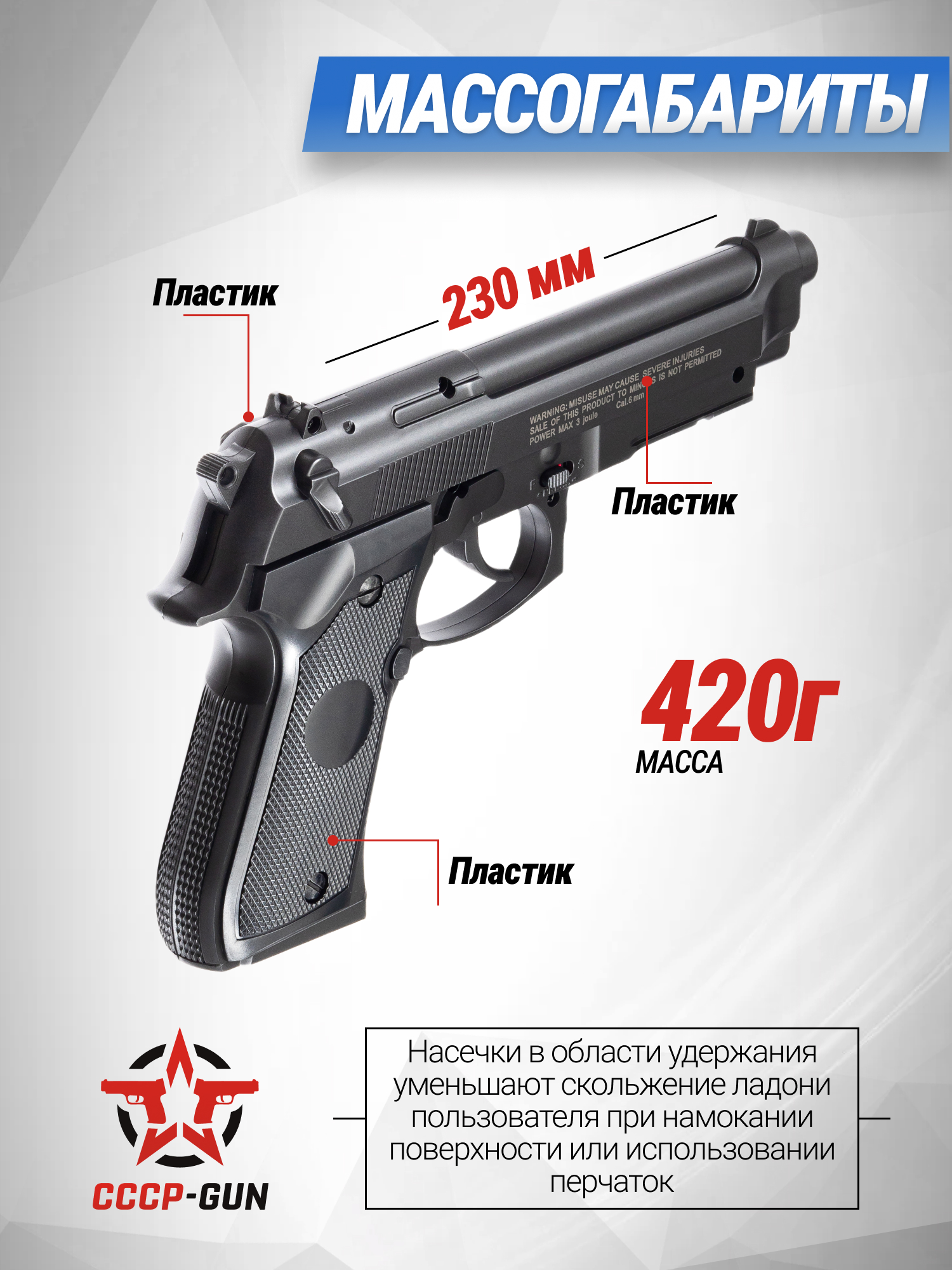 Представленная модель внешне повторяет очертания пистолета Beretta M92. Сам пистолет копирует исключительно внешний вид данного образца. Из плюсов конструкции корпуса данной модели можно выделить то, что пистолет оснащён дополнительной планкой вивера. Эта планка находиться под стволом пистолета и позволяет разместить фонарь и лазерный целеуказатель.