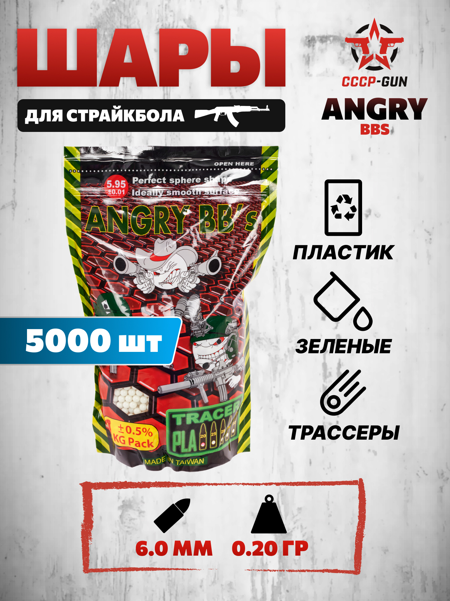 Упаковка с зарядами Энгри вместила 5 тысяч пулек 6 мм - с таким запасом пользователь сможет отправиться на полноценную игру, либо пройти несколько тренировок повышенной интенсивности. Тарой выступает пластиковый пакет с ЗИП замком, который делает емкость многоразовой - страйкболисту не придется искать, куда пересыпать заряды.