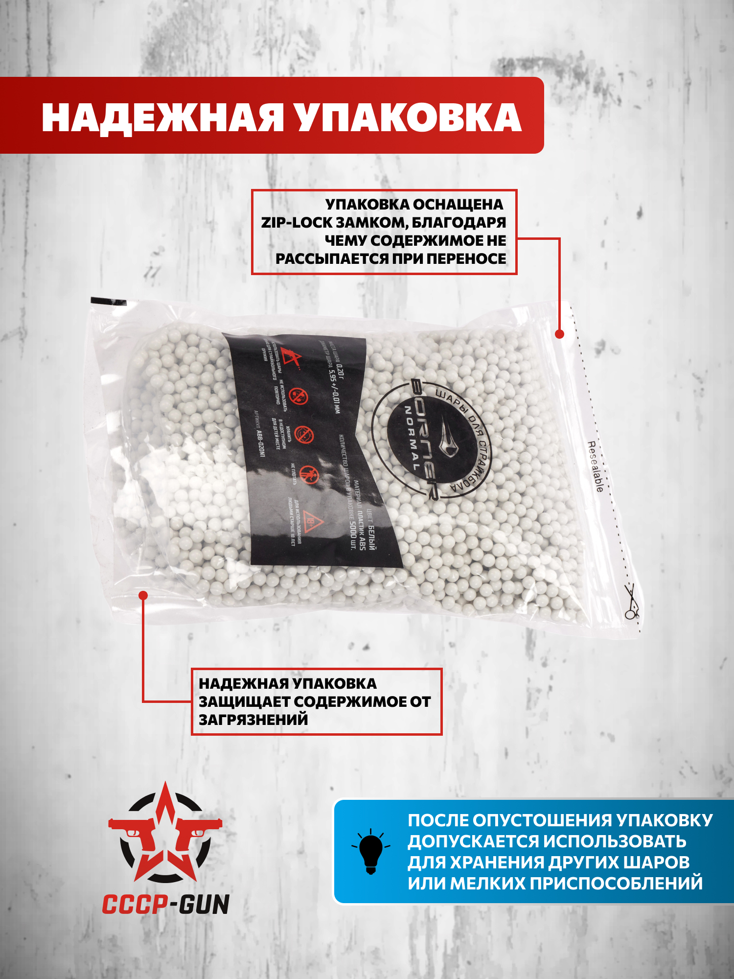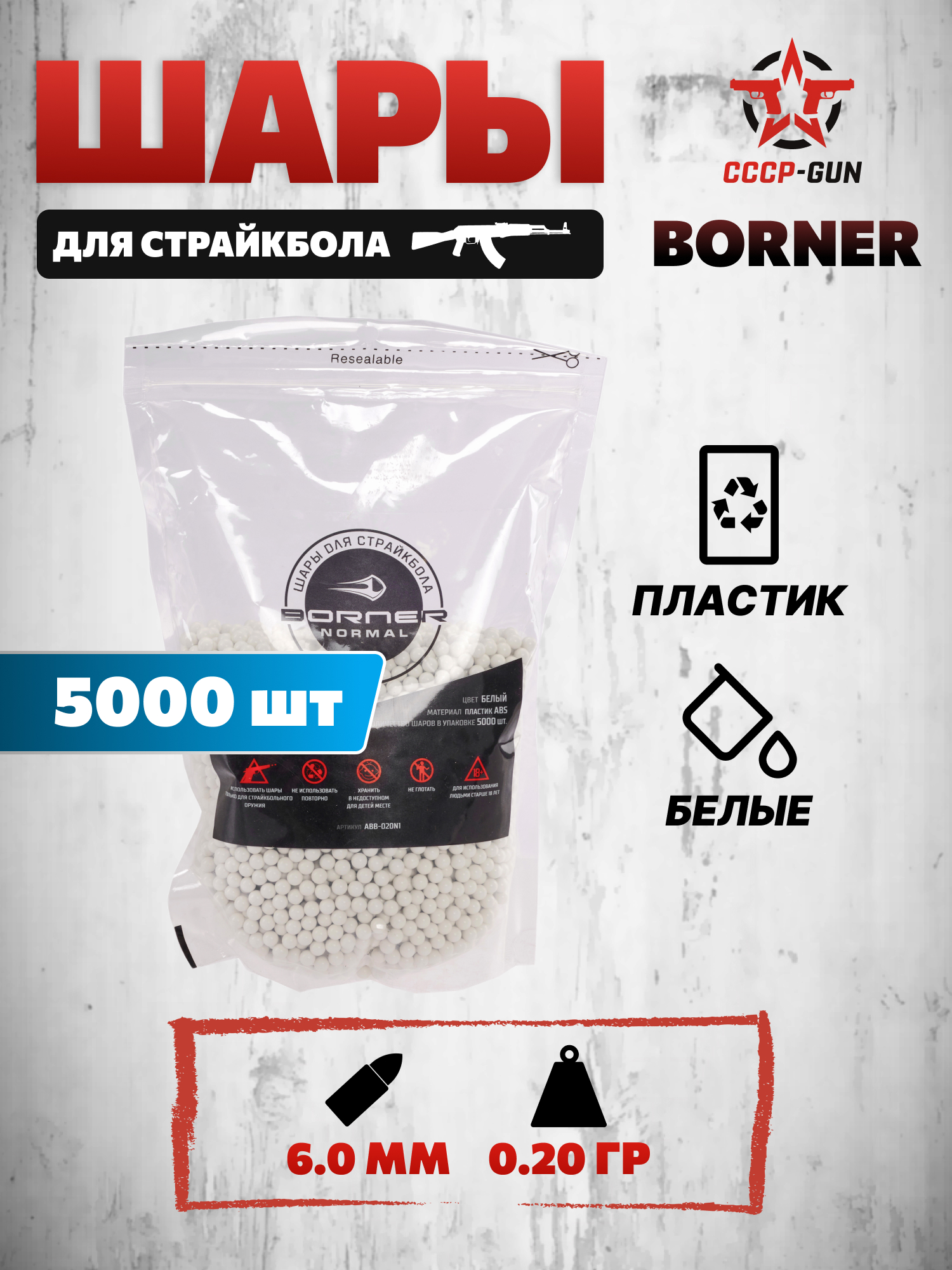 В эту вариацию упаковки вошло 5000 BB пуль. Запаса подобного размера хватает для нескольких крупных игровых мероприятий и множества локальных тренировок, организуемых страйкболистами в межсезонье.
