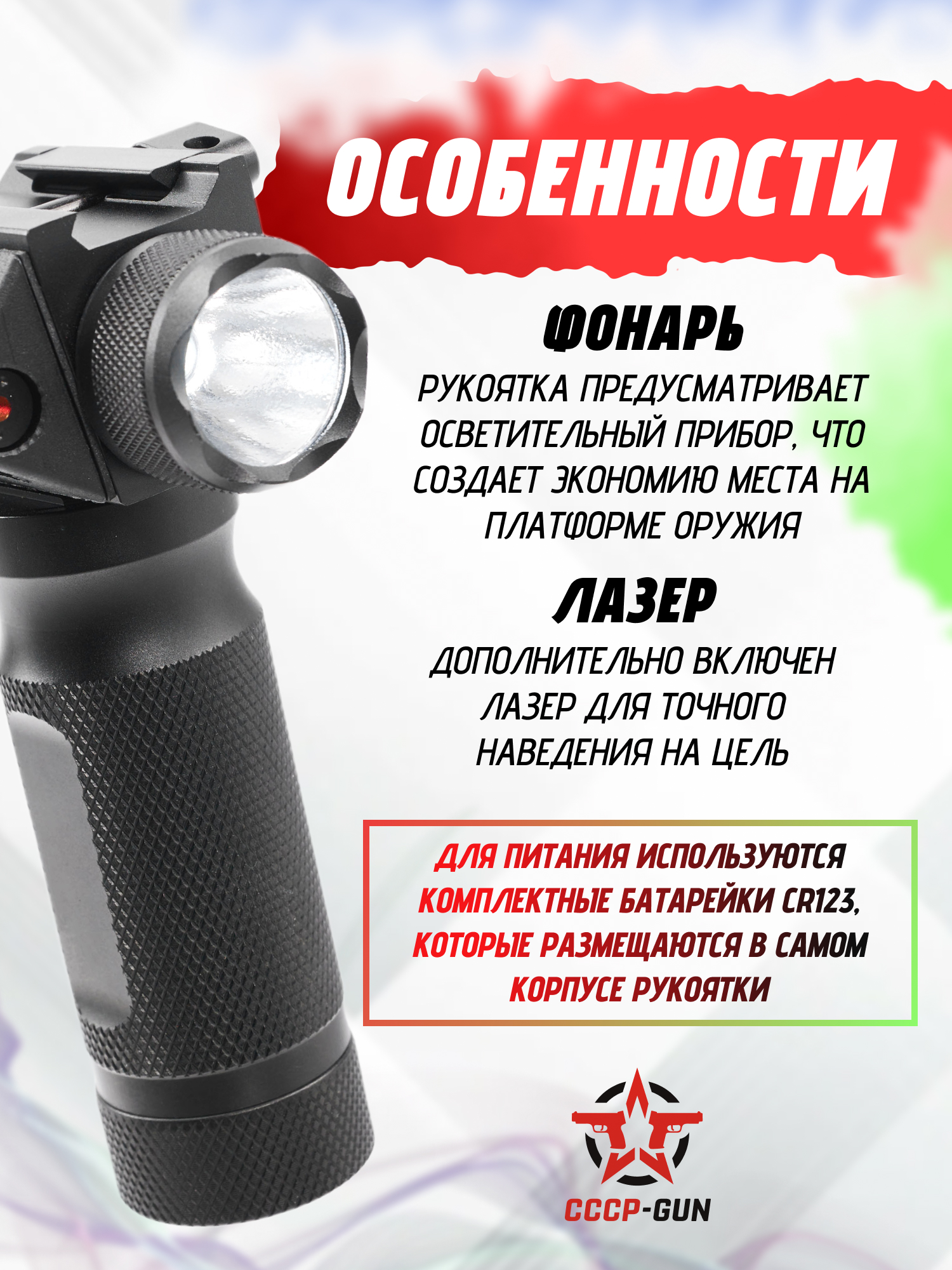 Тактическую рукоятку с фонарём и ЛЦУ Patriot BH-GF01 можно купить для подсвечивания или ослепления целей при помощи фонаря и более удобного прицеливания на ближних дистанциях с помощью ЛЦУ.