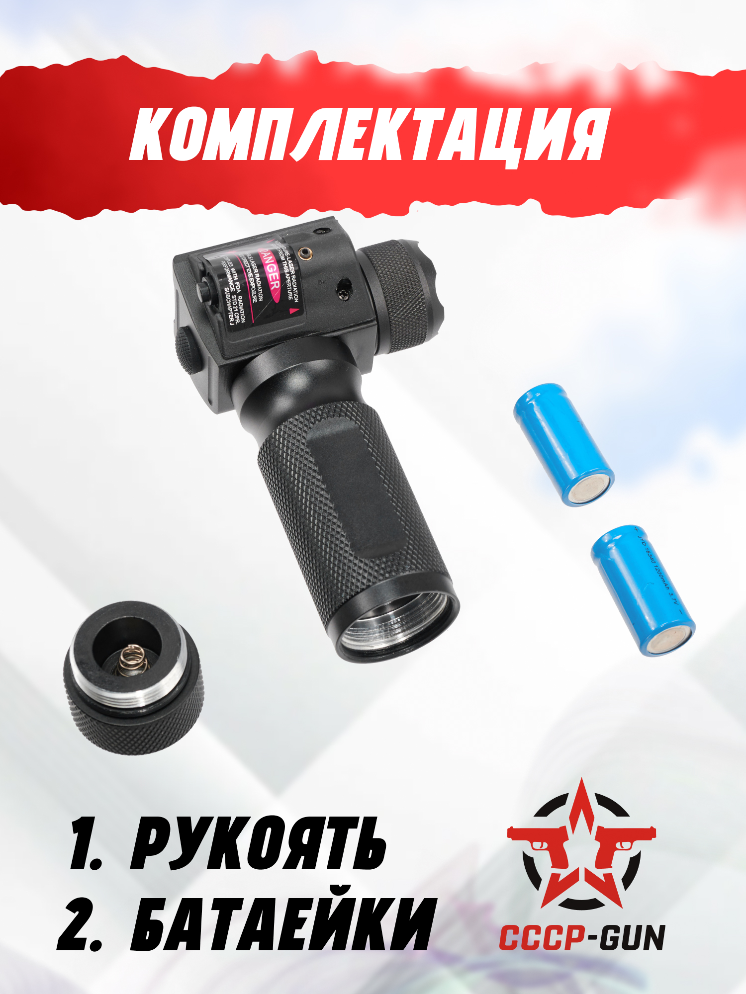 Вся электронные устройства данной рукояти питаются от двух батареек CR123. После приобретения тактической рукояти с фонарём и ЛЦУ Патриот БХ-ГФ01 за её цену первые батарейки стрелок сможет найти в комплекте с аксессуаром, но последующие ему придётся докупать отдельно. Ёмкость для батареек располагается внутри рукоятки. Для помещения батареек внутрь необходимо открутить заглушку в нижней части модели.